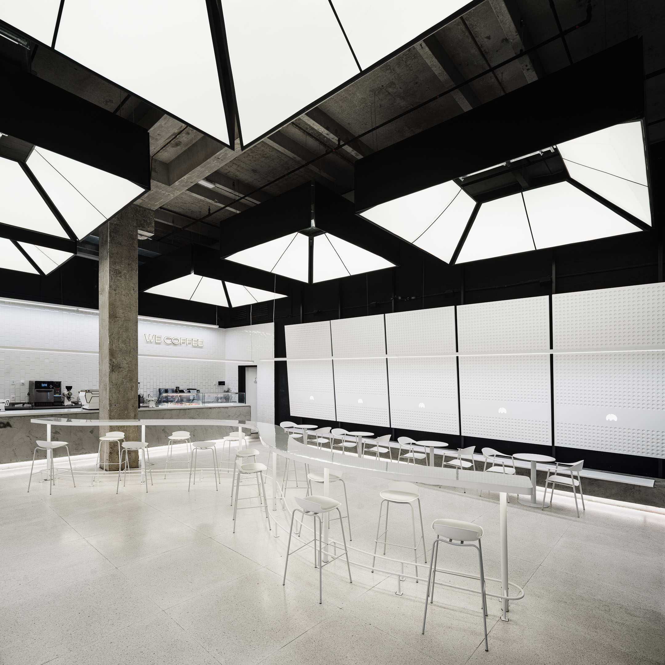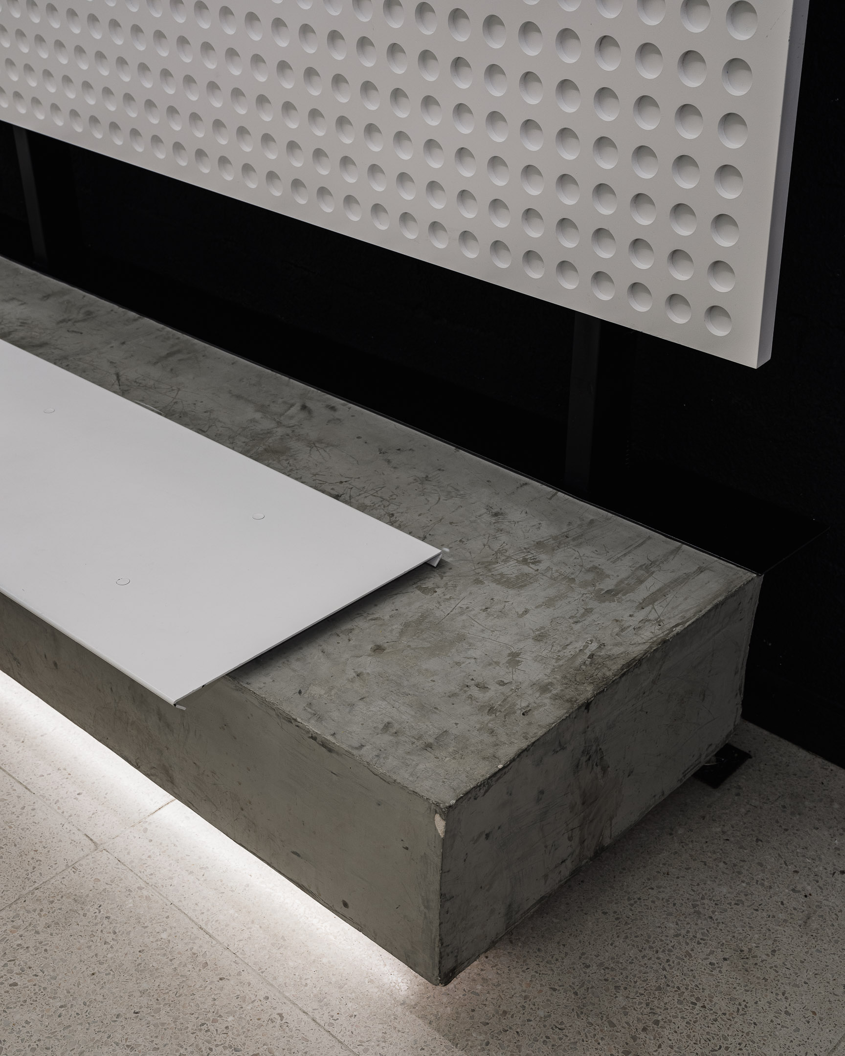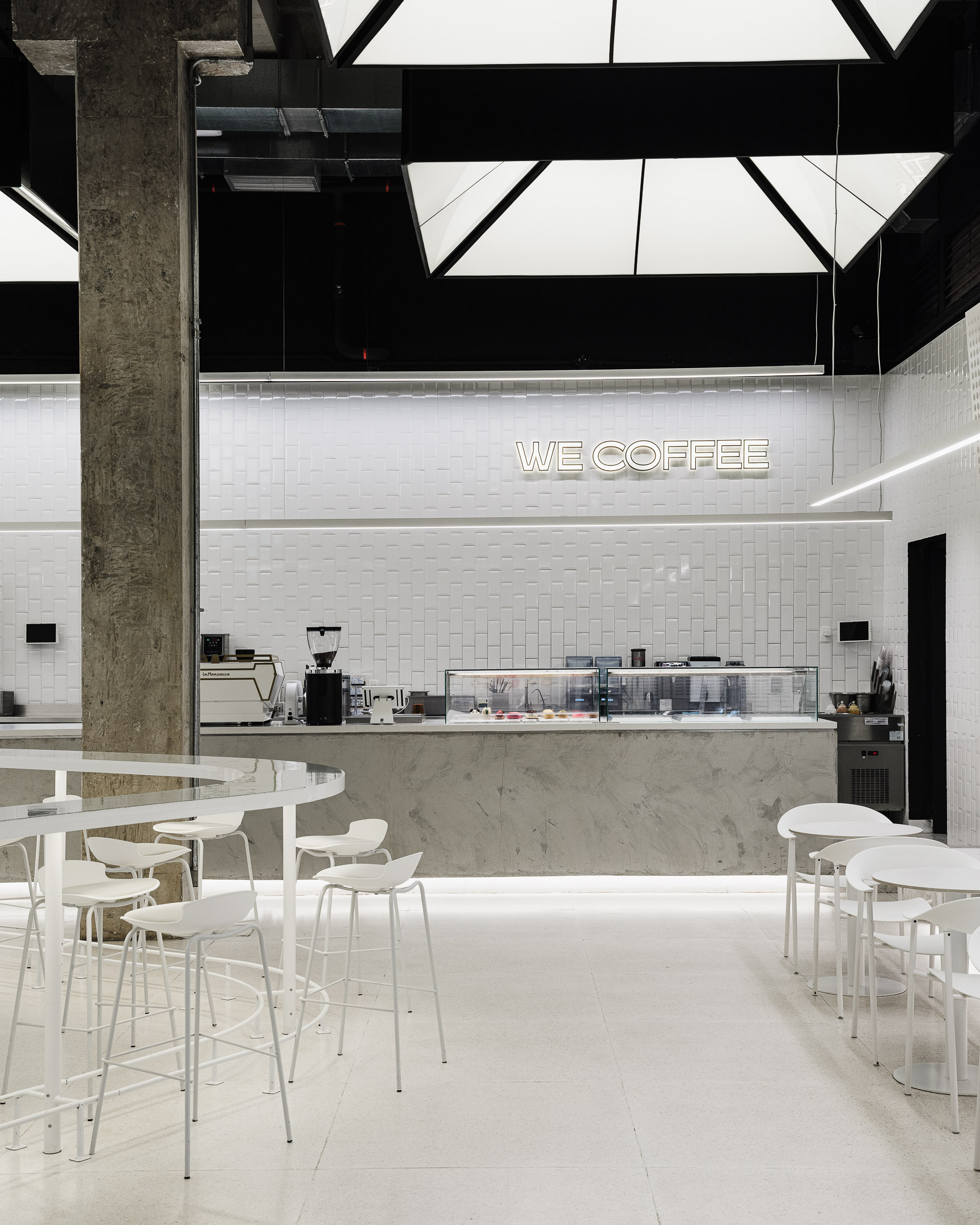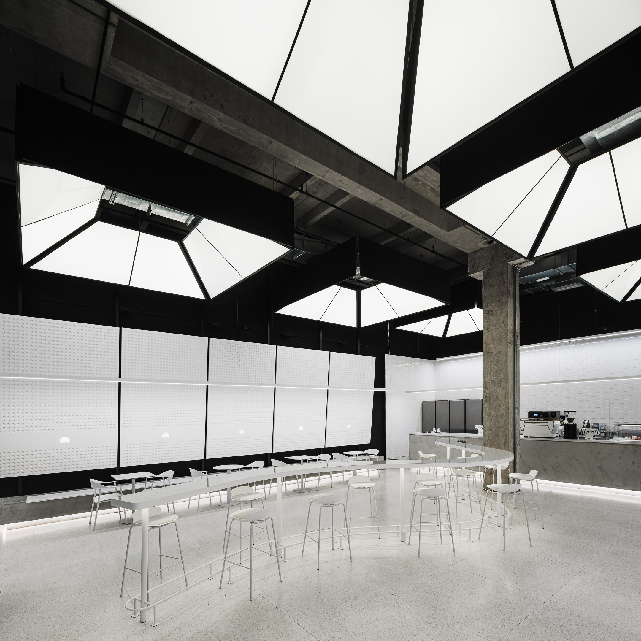 A monochromatic coffee shop featuring a concrete bench, metal seating and tables, and lighting reminiscent of a photographer’s studio.
