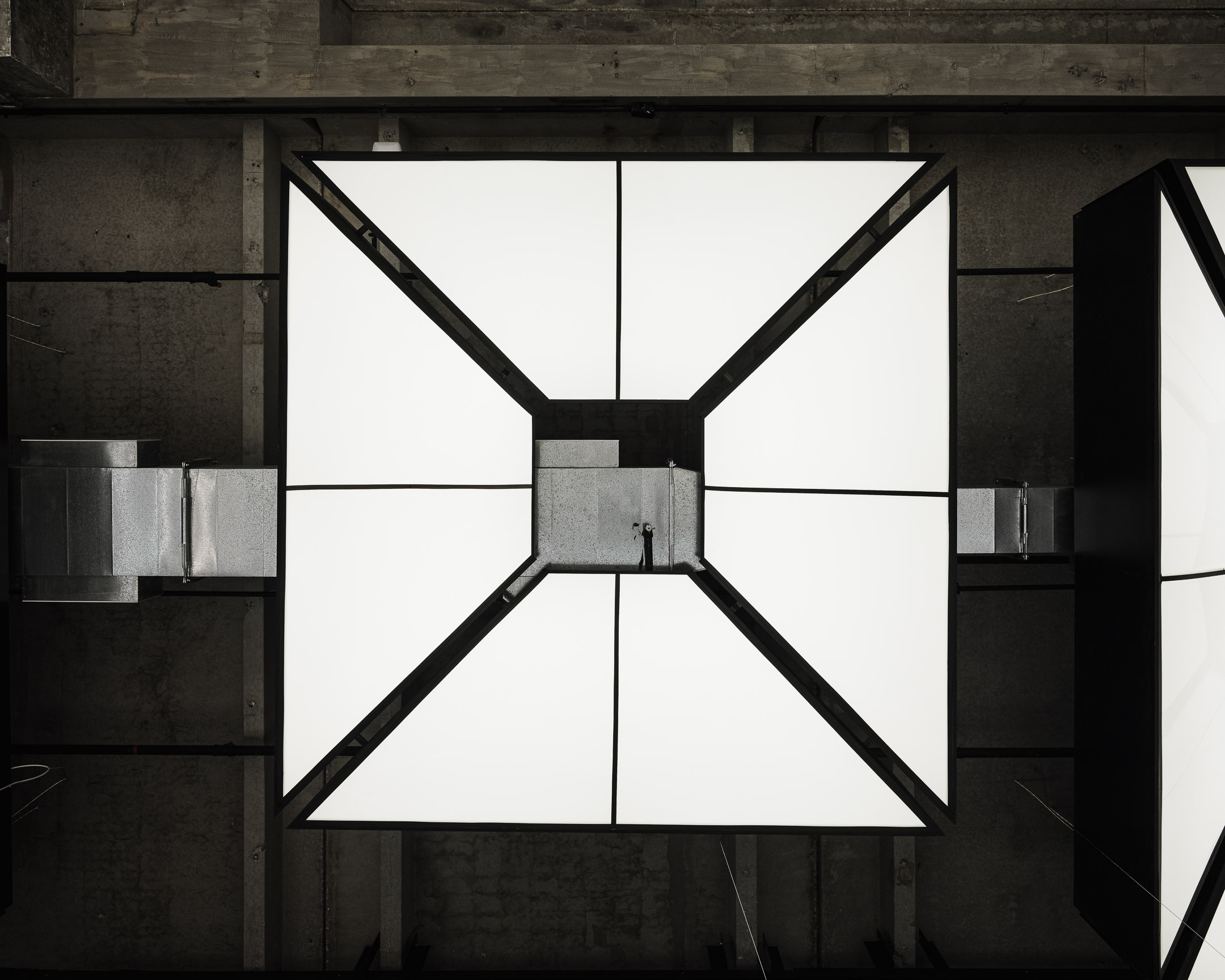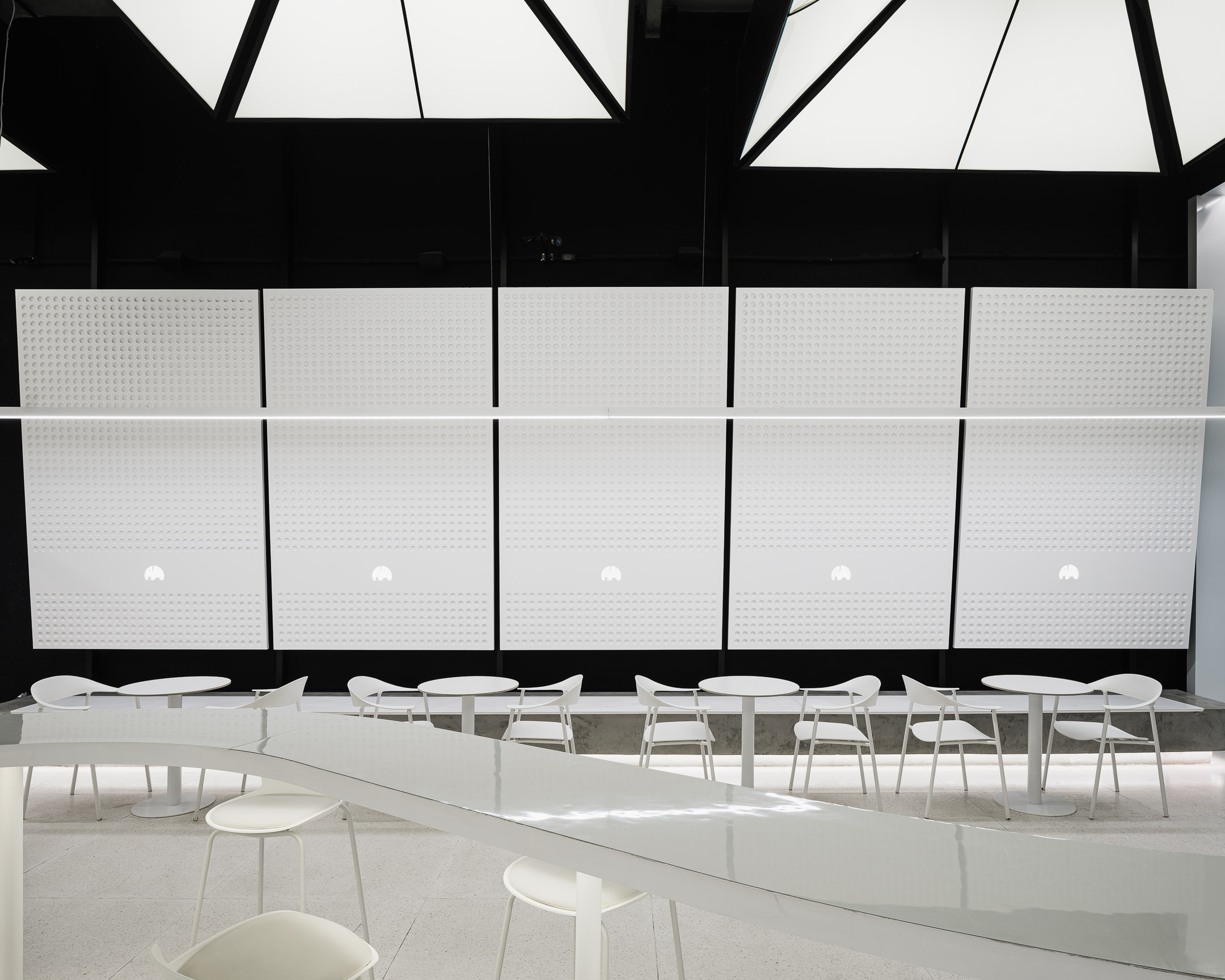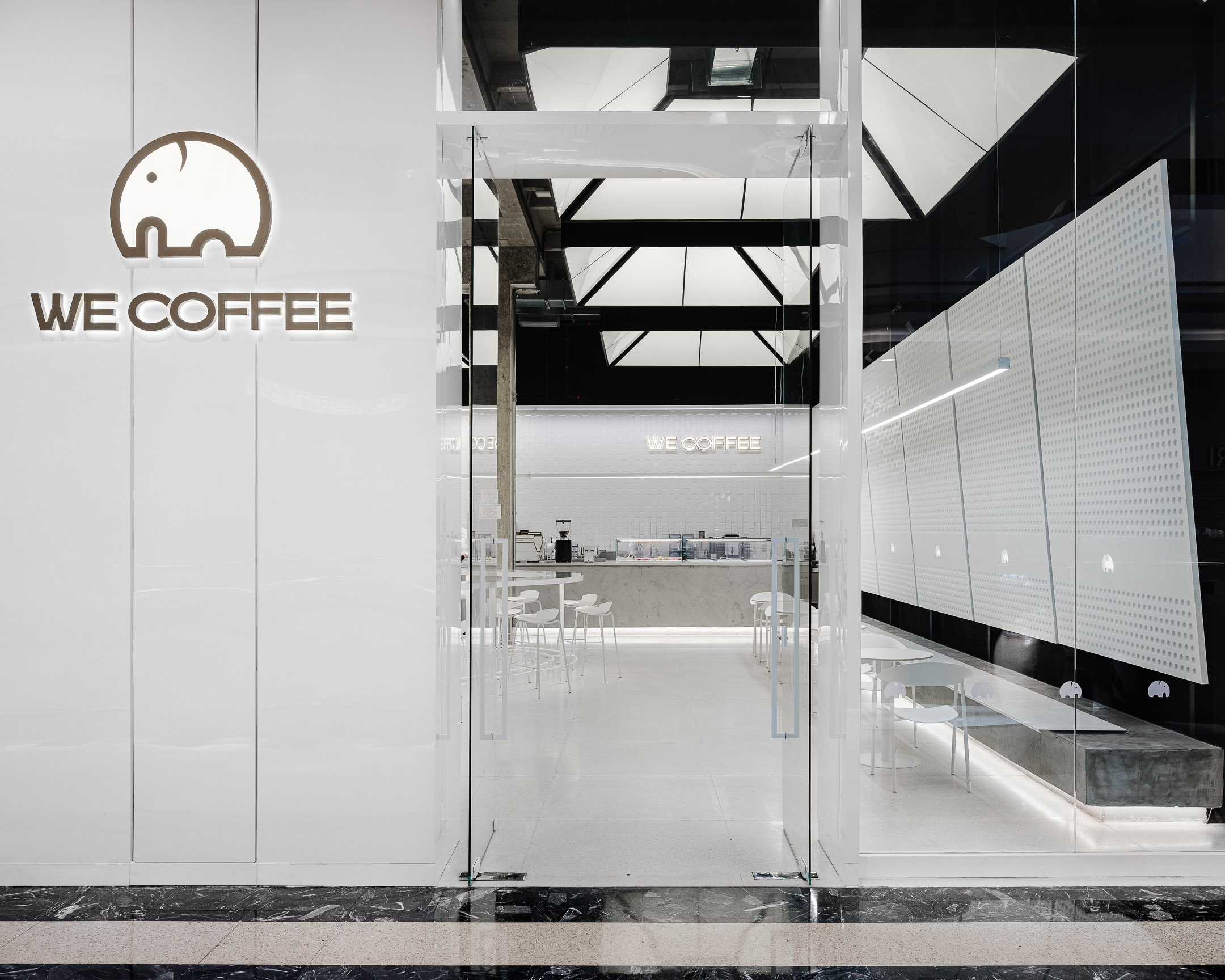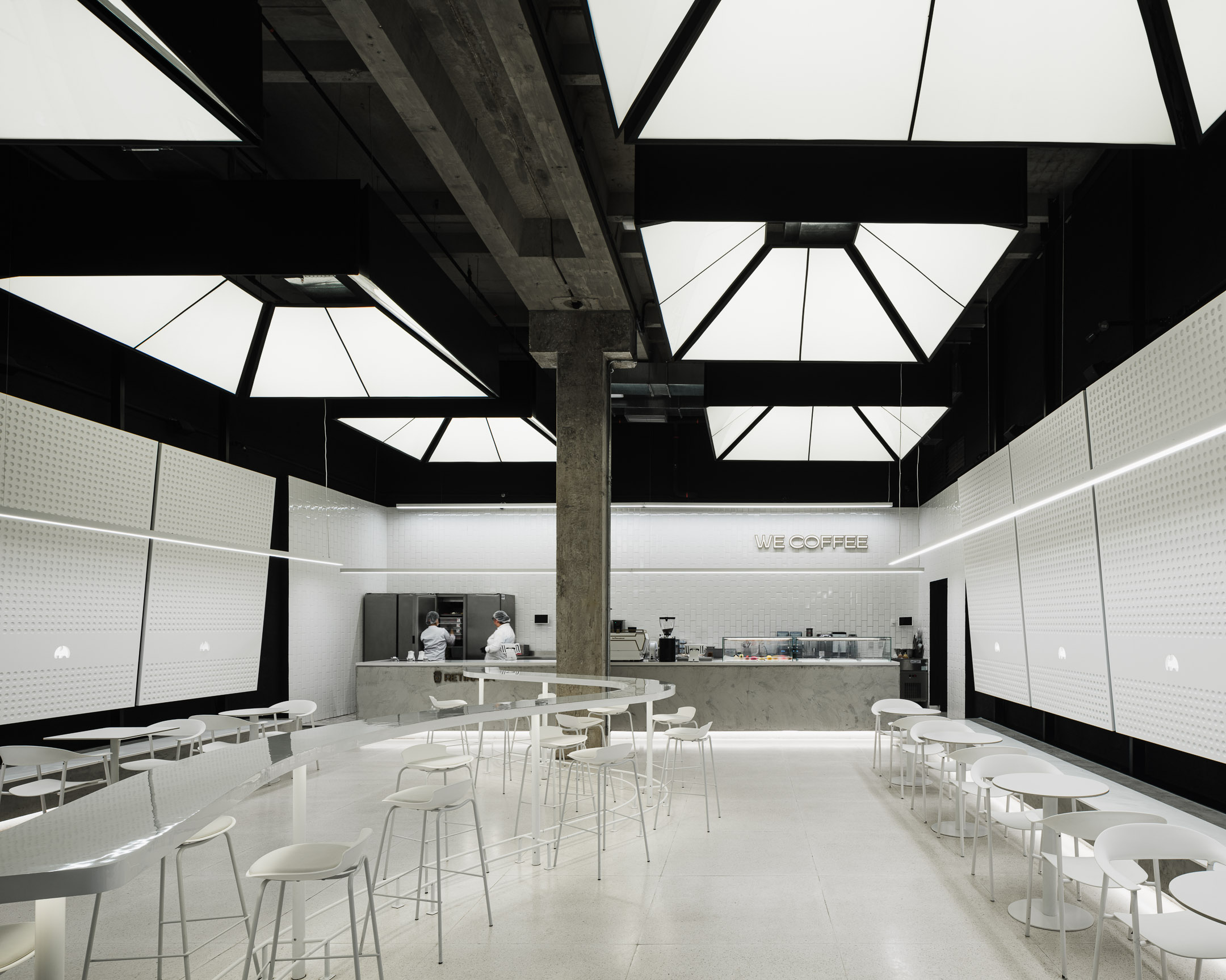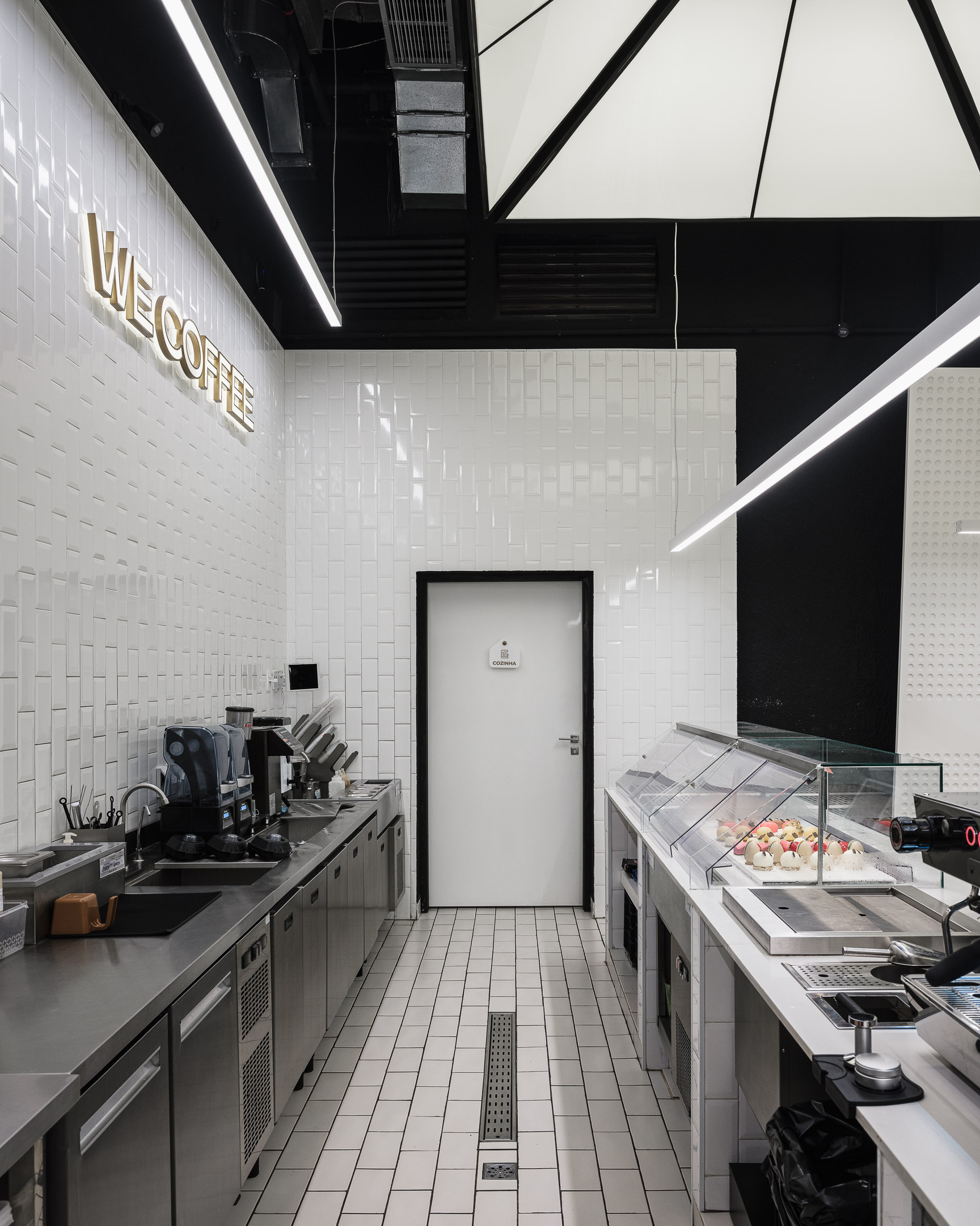 A monochromatic coffee shop featuring a concrete bench, metal seating and tables, and lighting reminiscent of a photographer’s studio.