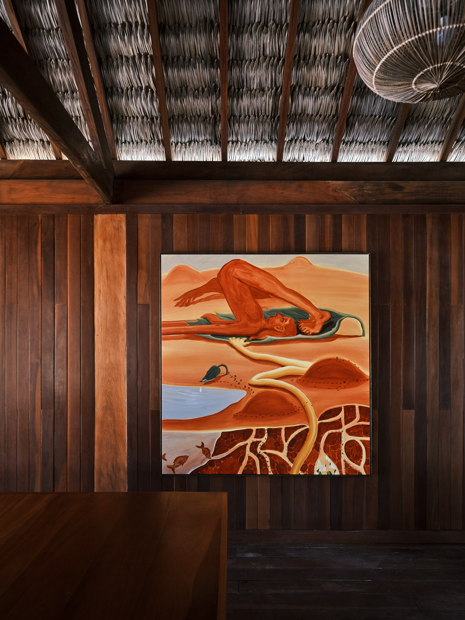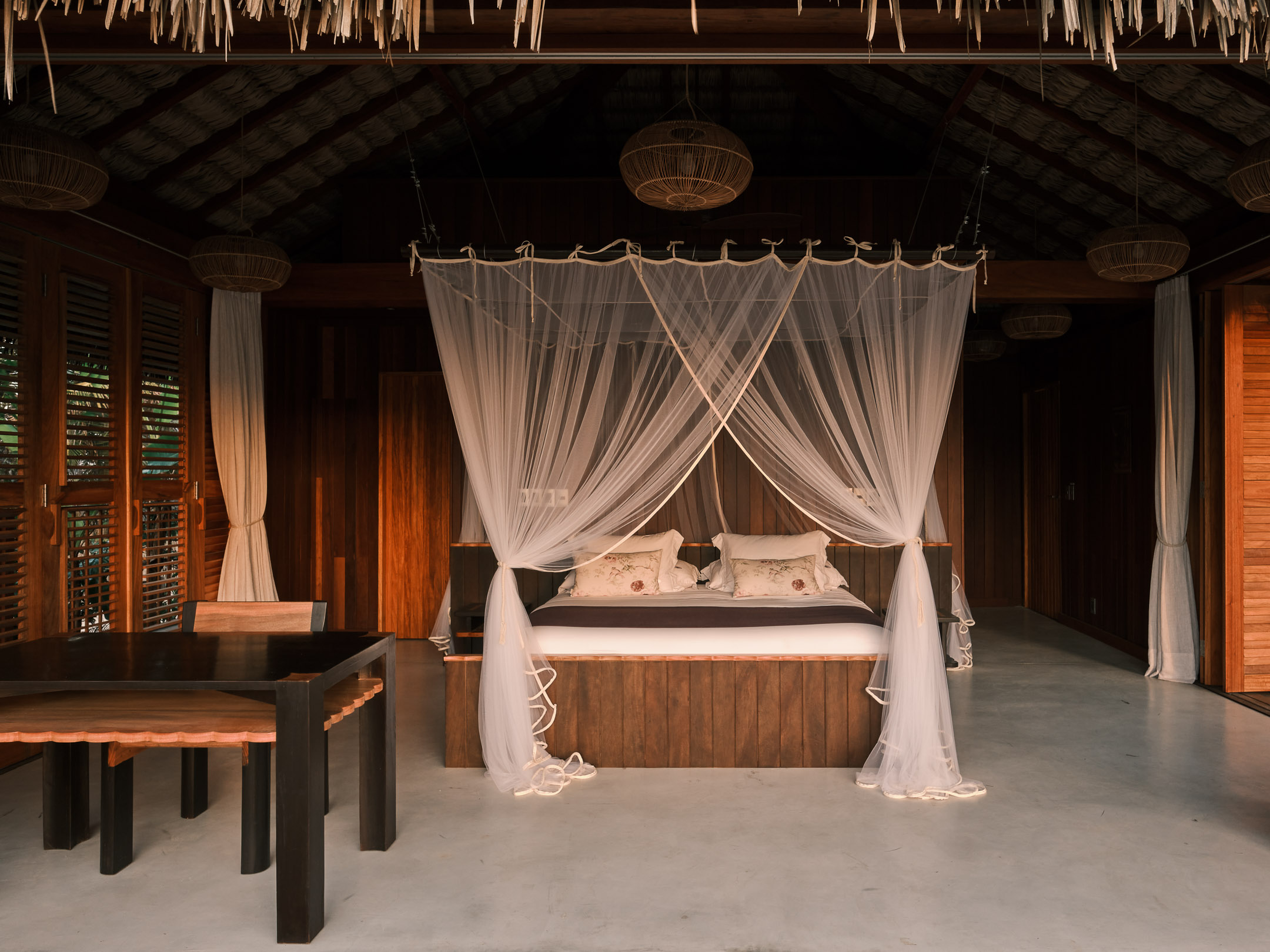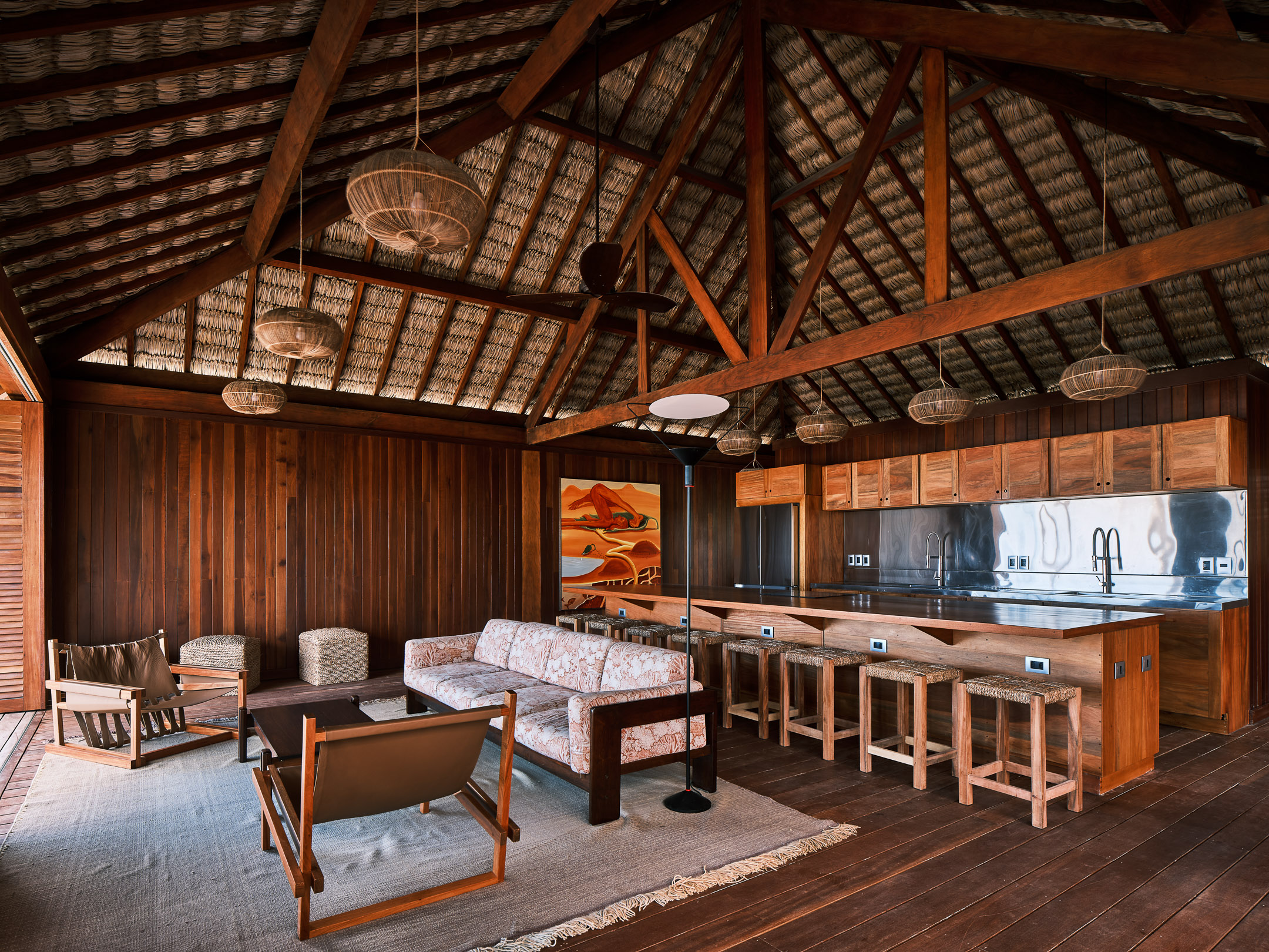 The second part of the photo essay focuses on the nine bungalows, consisting of seven suites and two communal kitchens. The construction language is different from the main house; here, the wooden structures emerge from concrete foundations and is topped with straw and reed roofing. Each bungalow was laid out with furniture and artworks from different designers and artists.