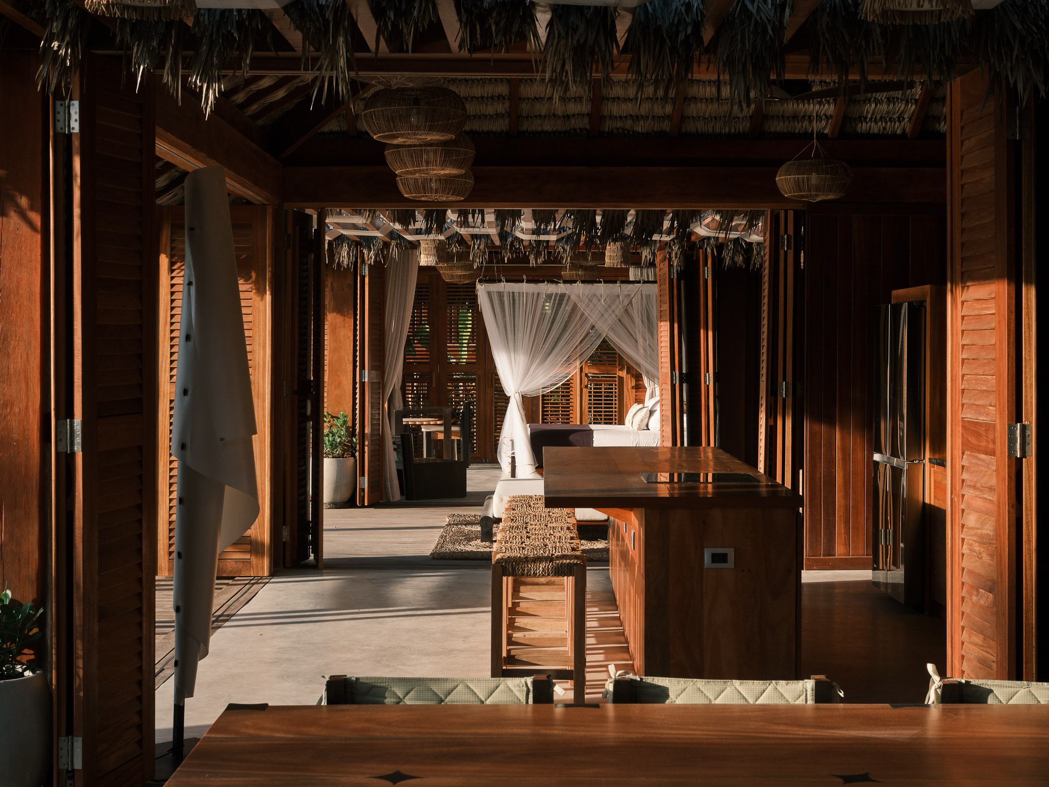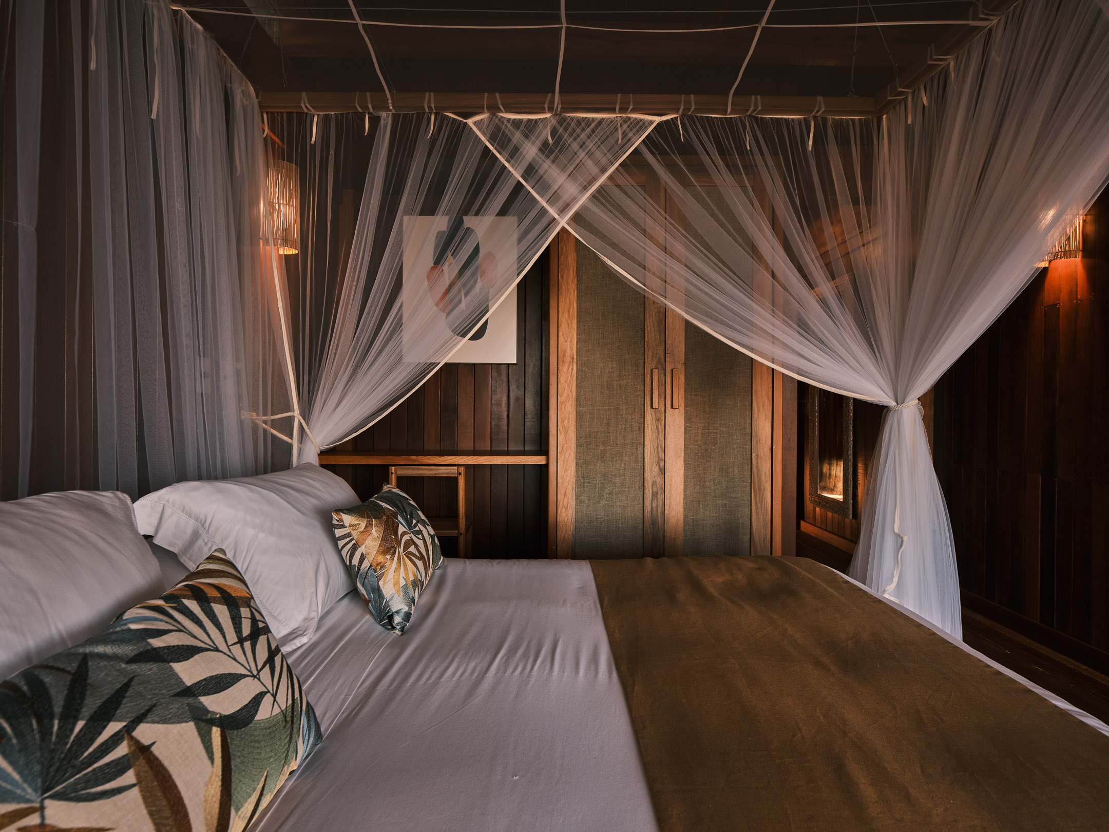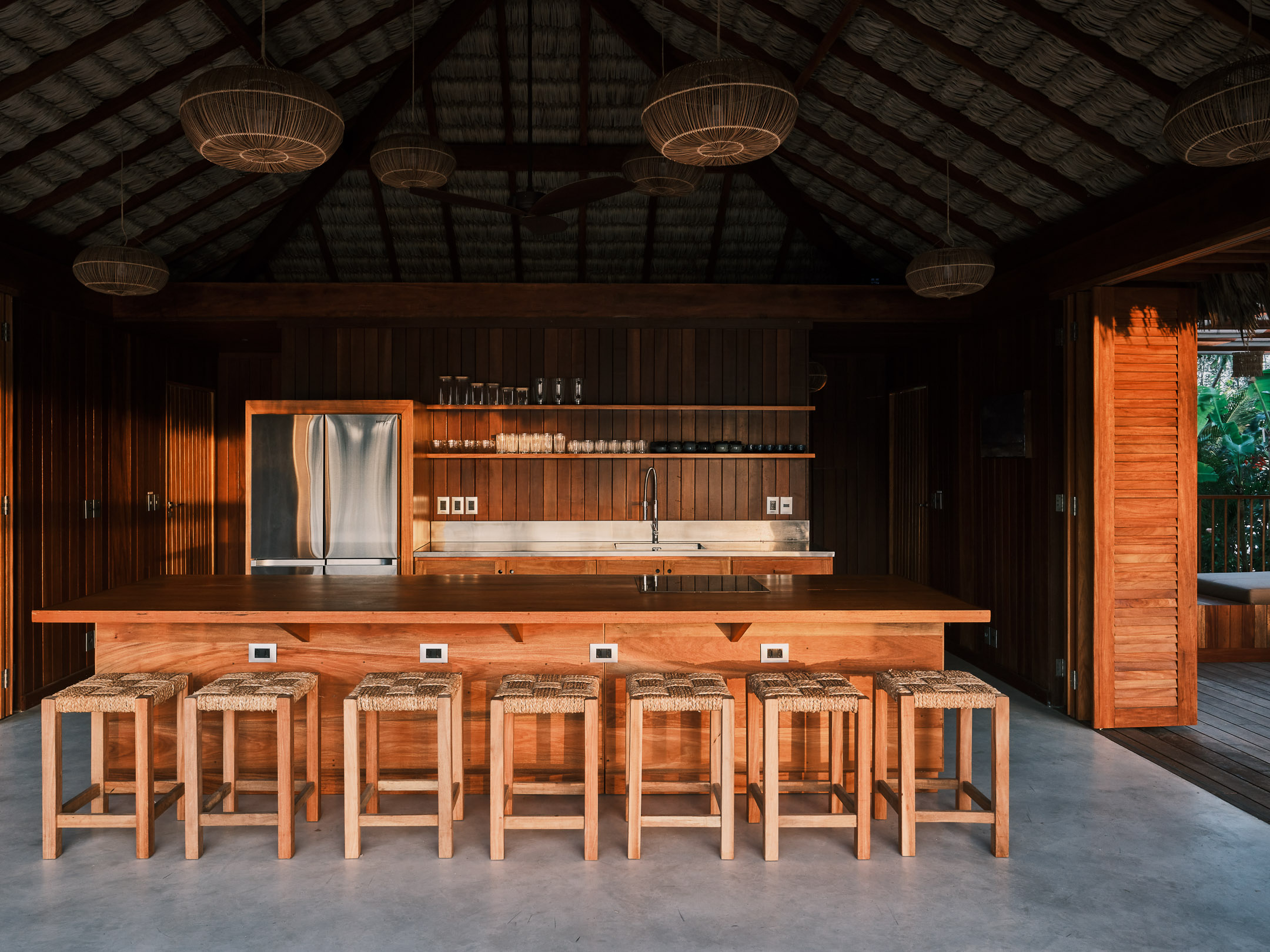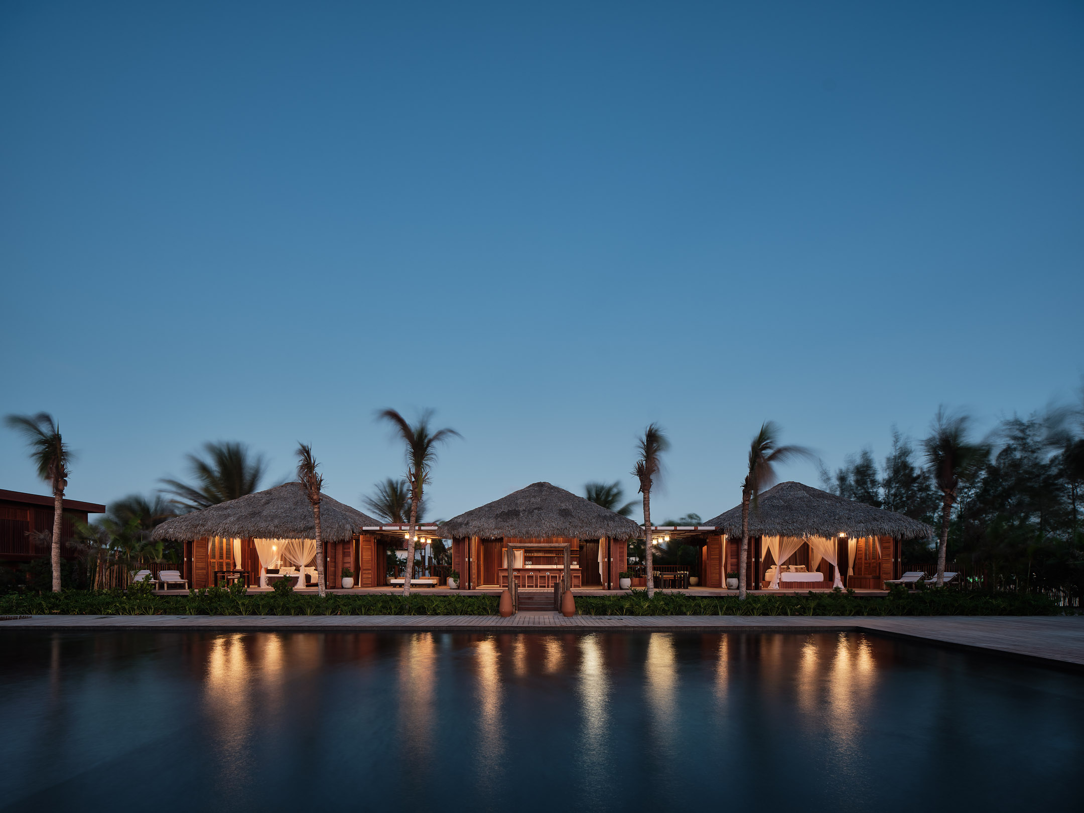 The second part of the photo essay focuses on the nine bungalows, consisting of seven suites and two communal kitchens. The construction language is different from the main house; here, the wooden structures emerge from concrete foundations and is topped with straw and reed roofing. Each bungalow was laid out with furniture and artworks from different designers and artists.