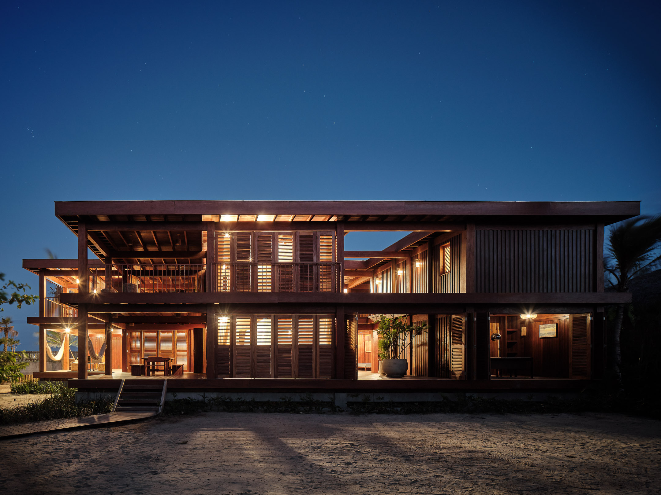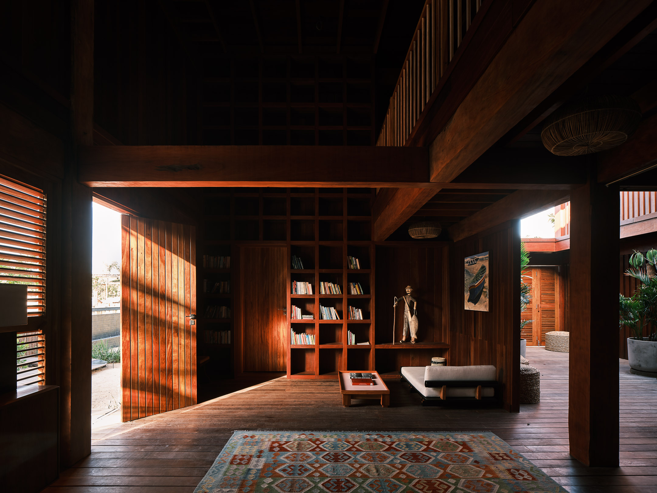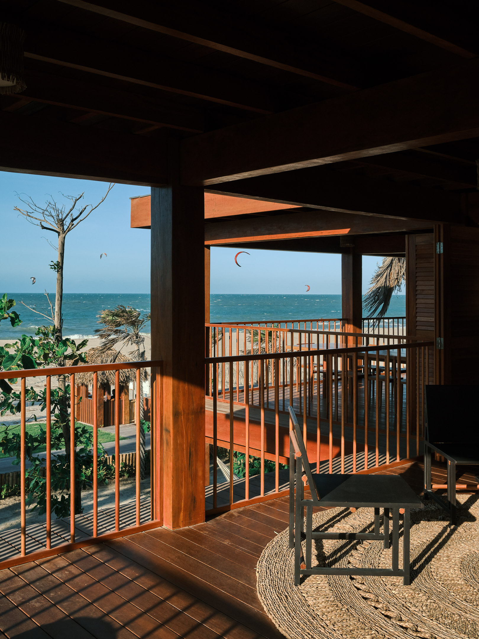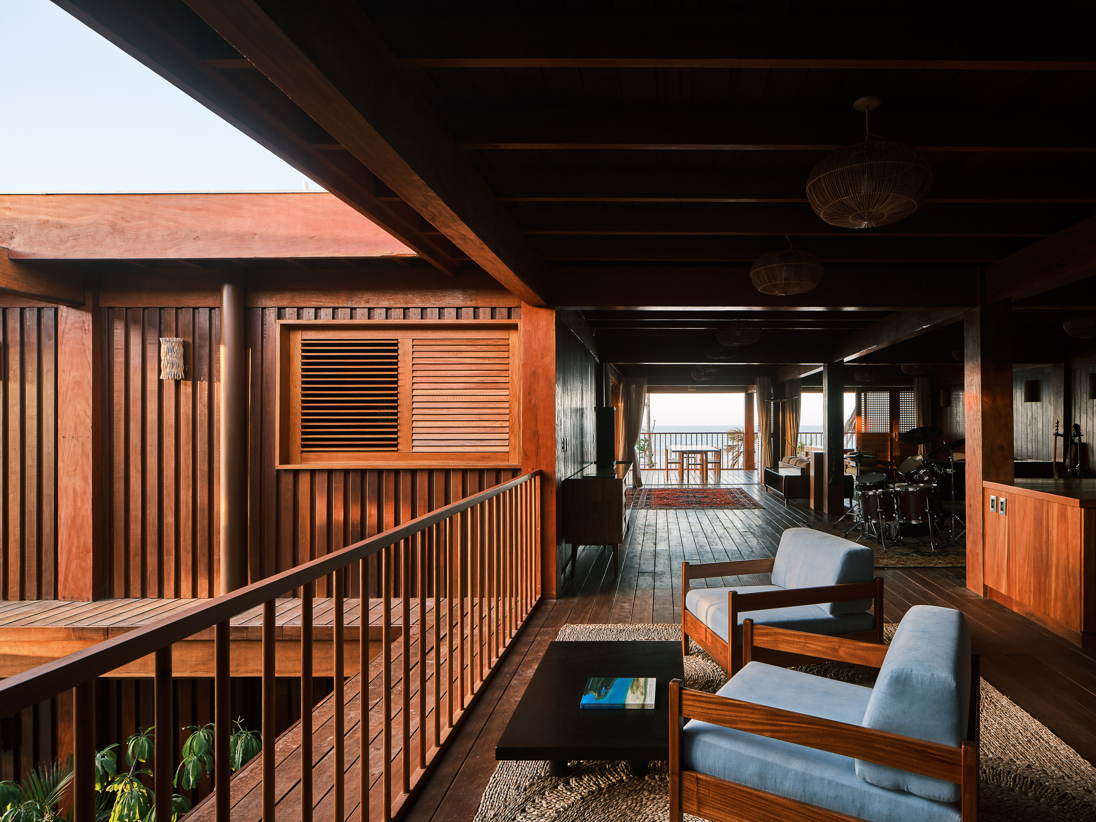 The first part of the photo essay focuses on the main house, a two-story wooden building facing the sea. The project involved local carpentry teams, who carried out all the structure, cladding and closures. The spacious environments do not have glass panes or air conditioning, and all spaces channel and distribute the constant flow of wind.
