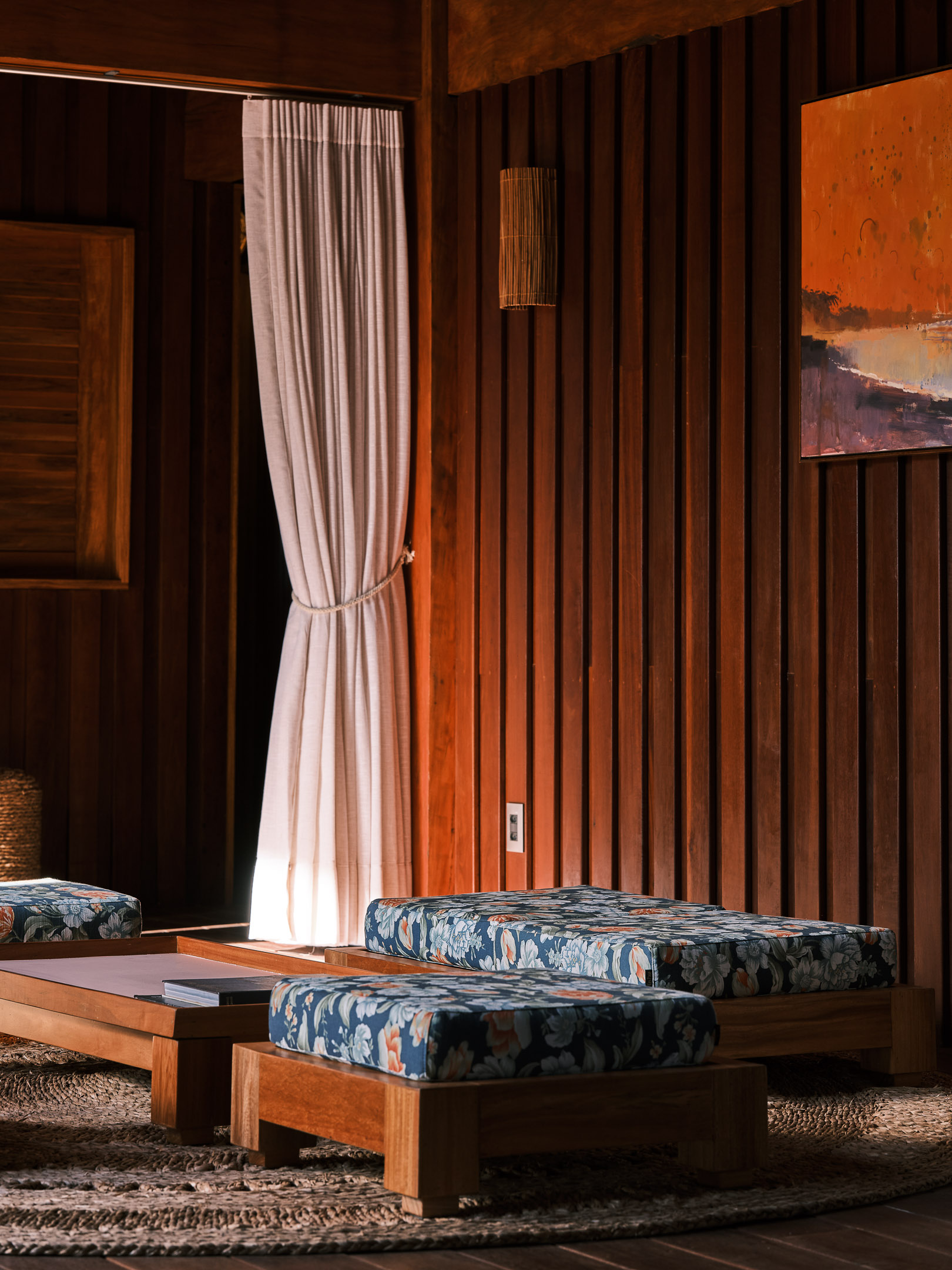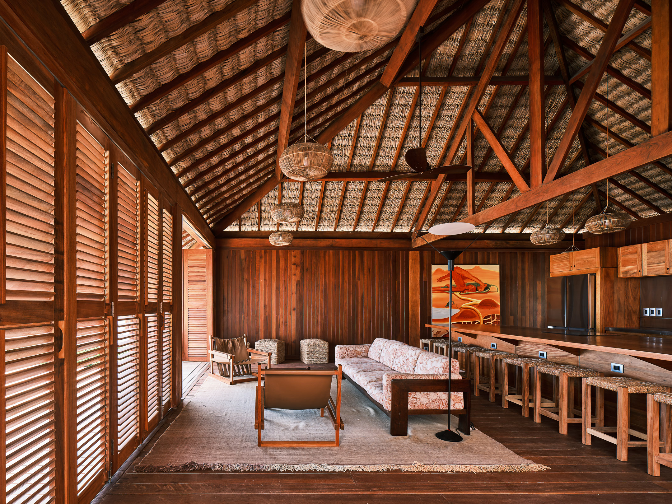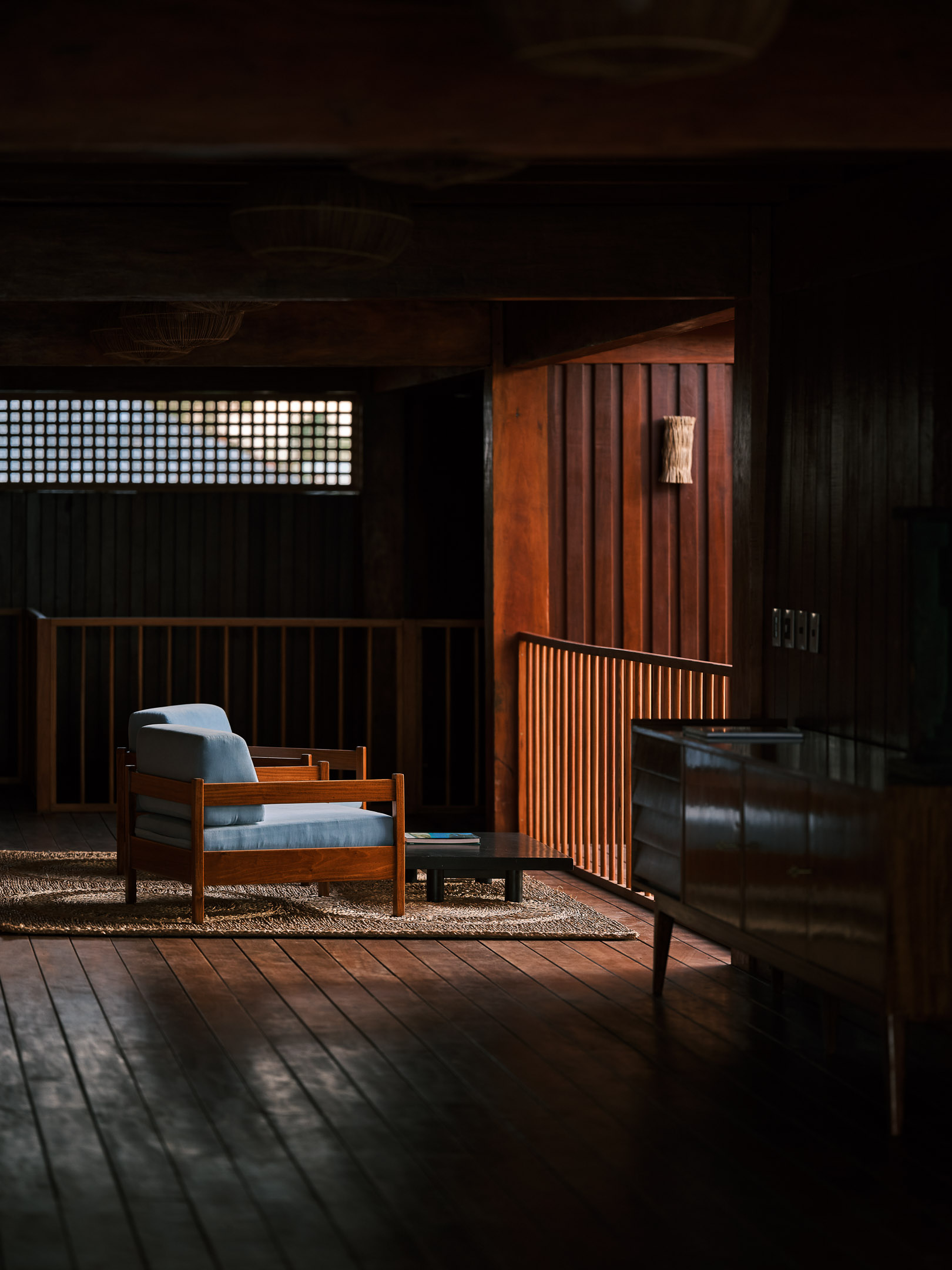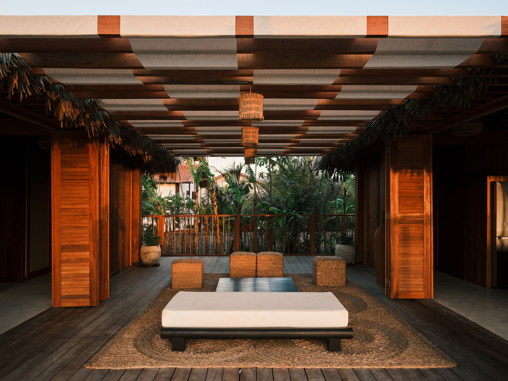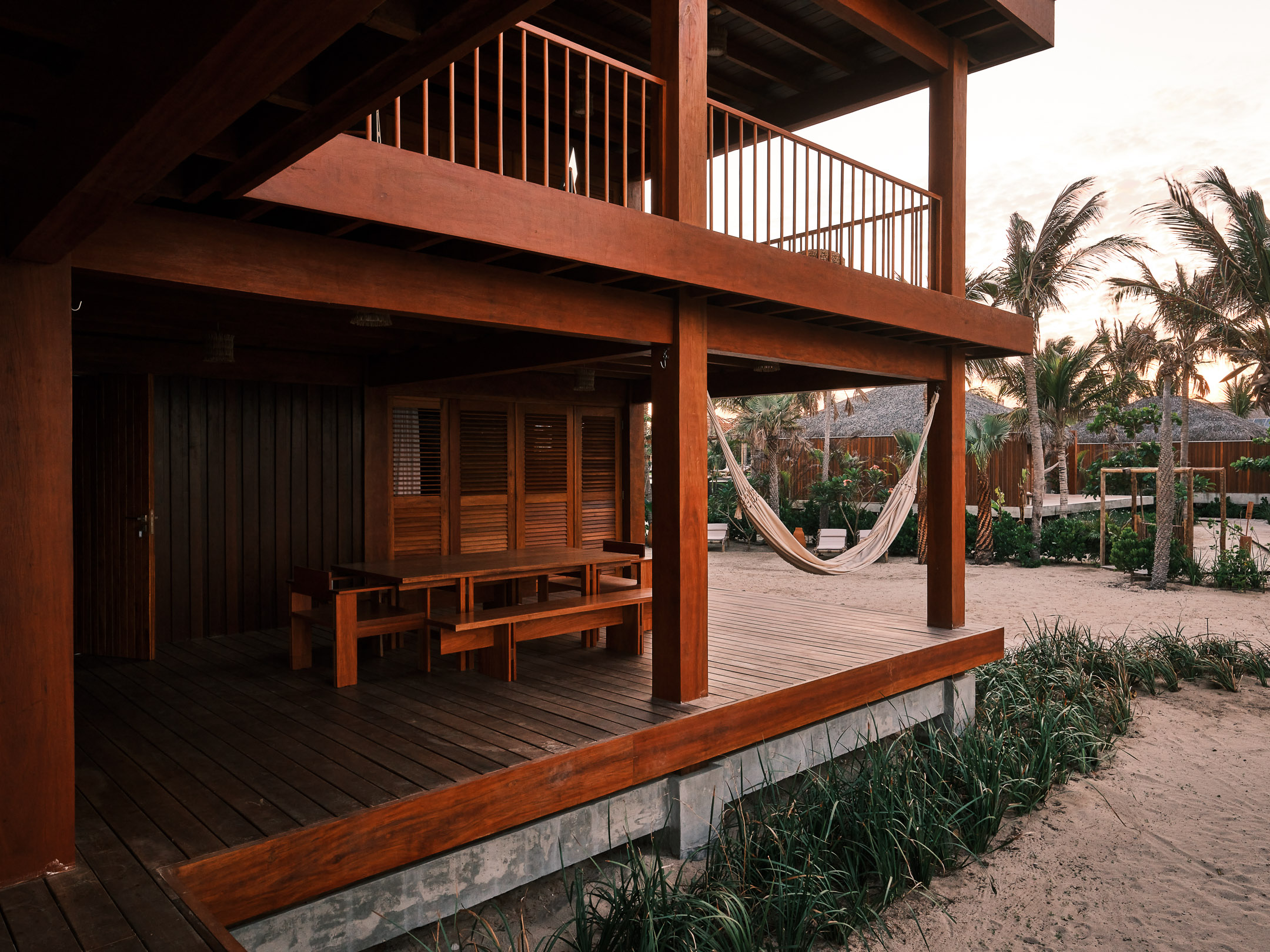 The first part of the photo essay focuses on the main house, a two-story wooden building facing the sea. The project involved local carpentry teams, who carried out all the structure, cladding and closures. The spacious environments do not have glass panes or air conditioning, and all spaces channel and distribute the constant flow of wind.