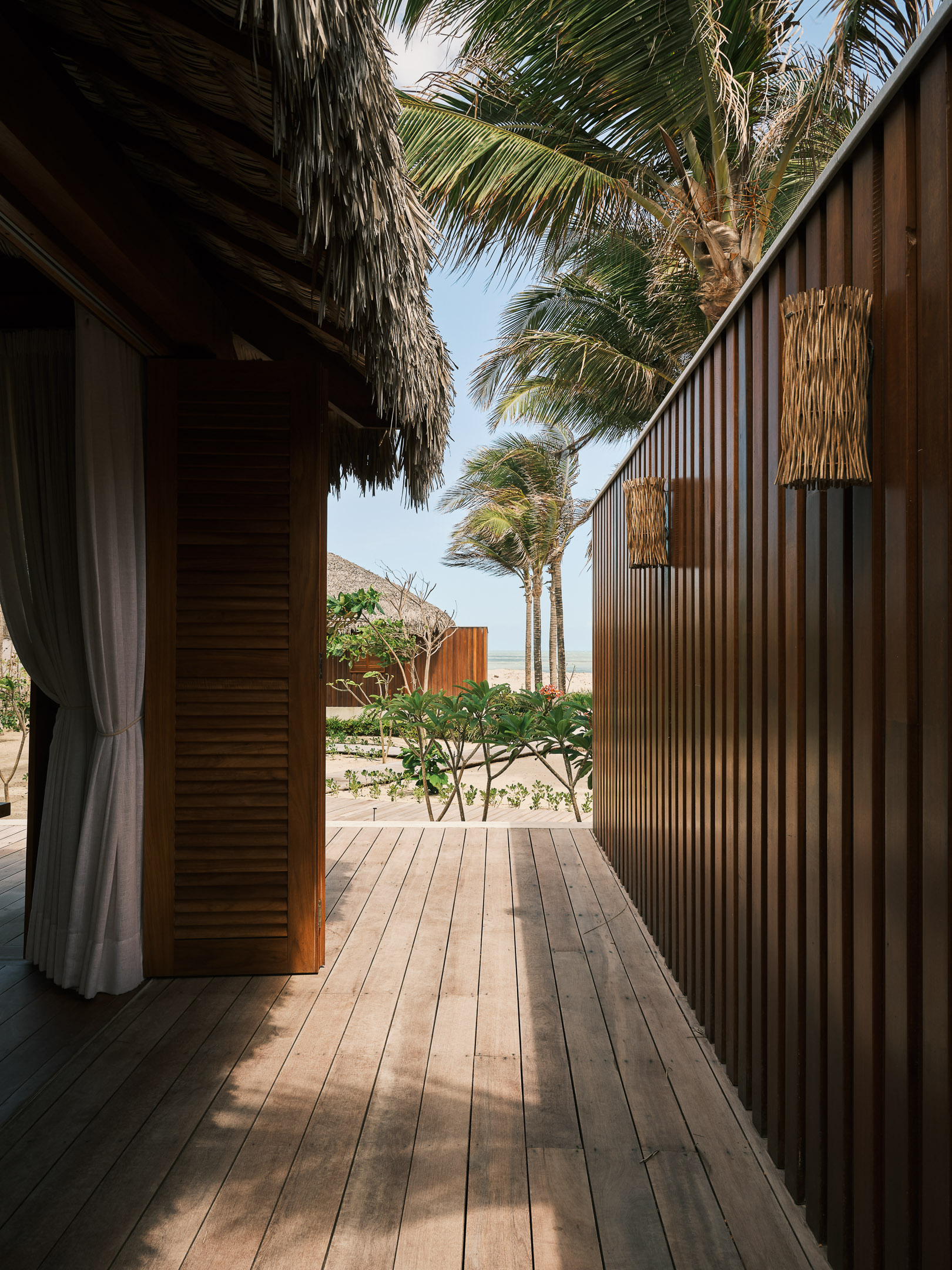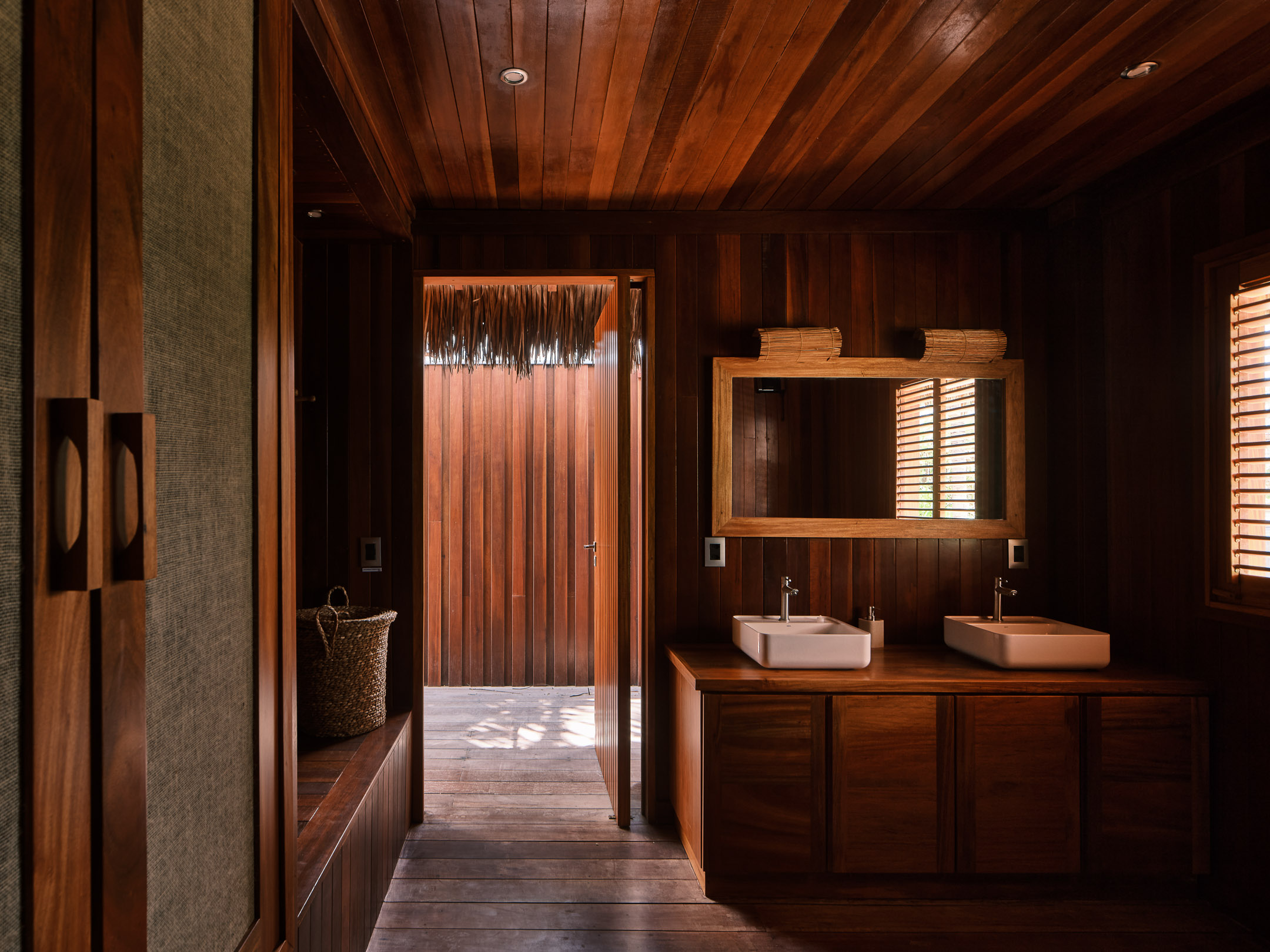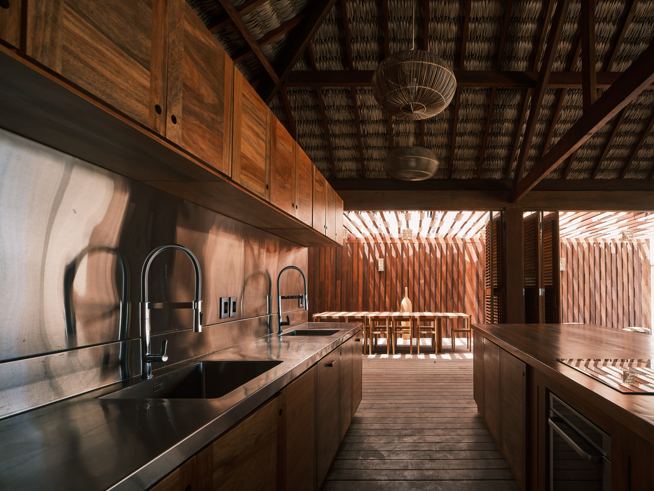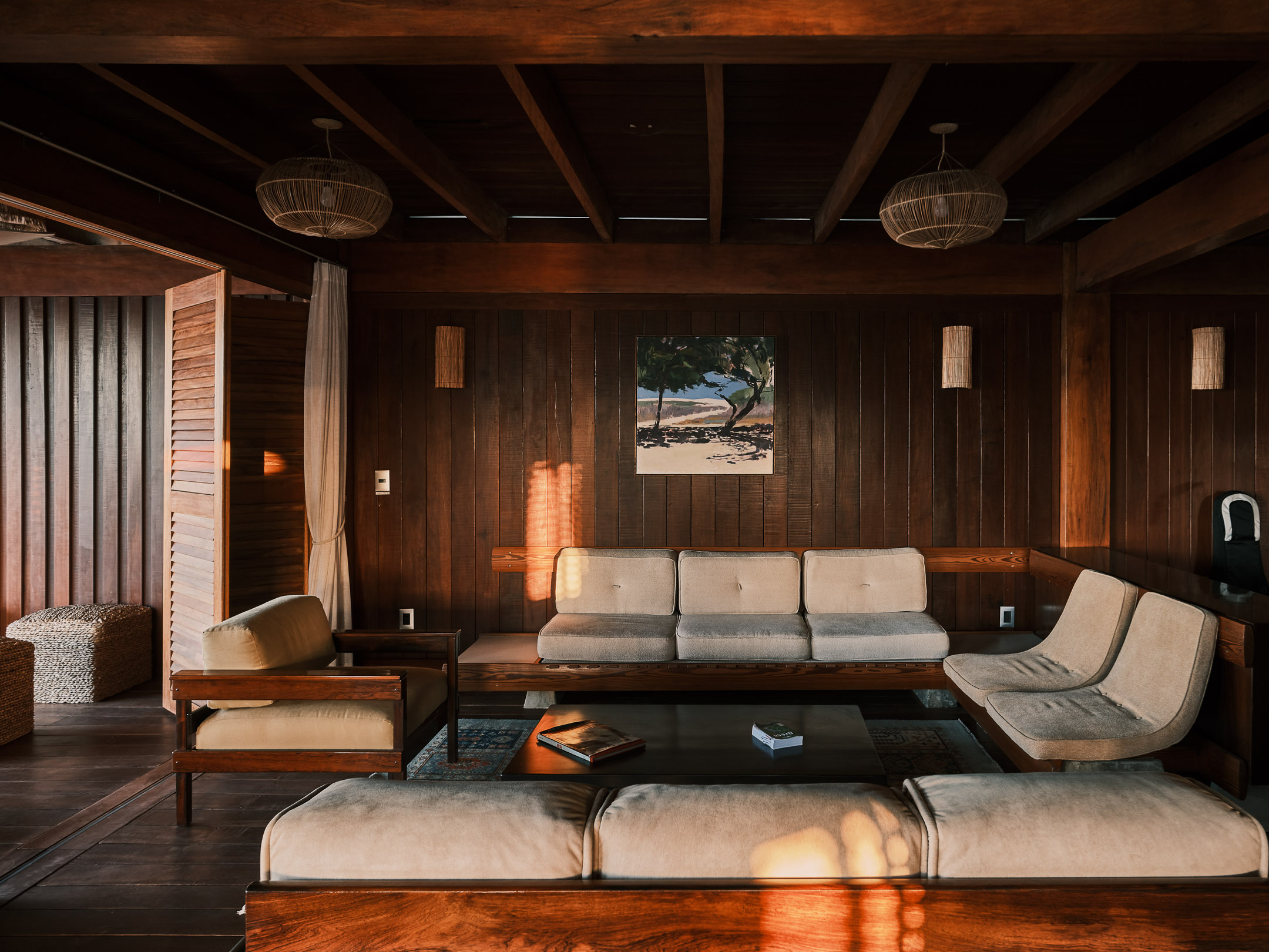 The first part of the photo essay focuses on the main house, a two-story wooden building facing the sea. The project involved local carpentry teams, who carried out all the structure, cladding and closures. The spacious environments do not have glass panes or air conditioning, and all spaces channel and distribute the constant flow of wind.