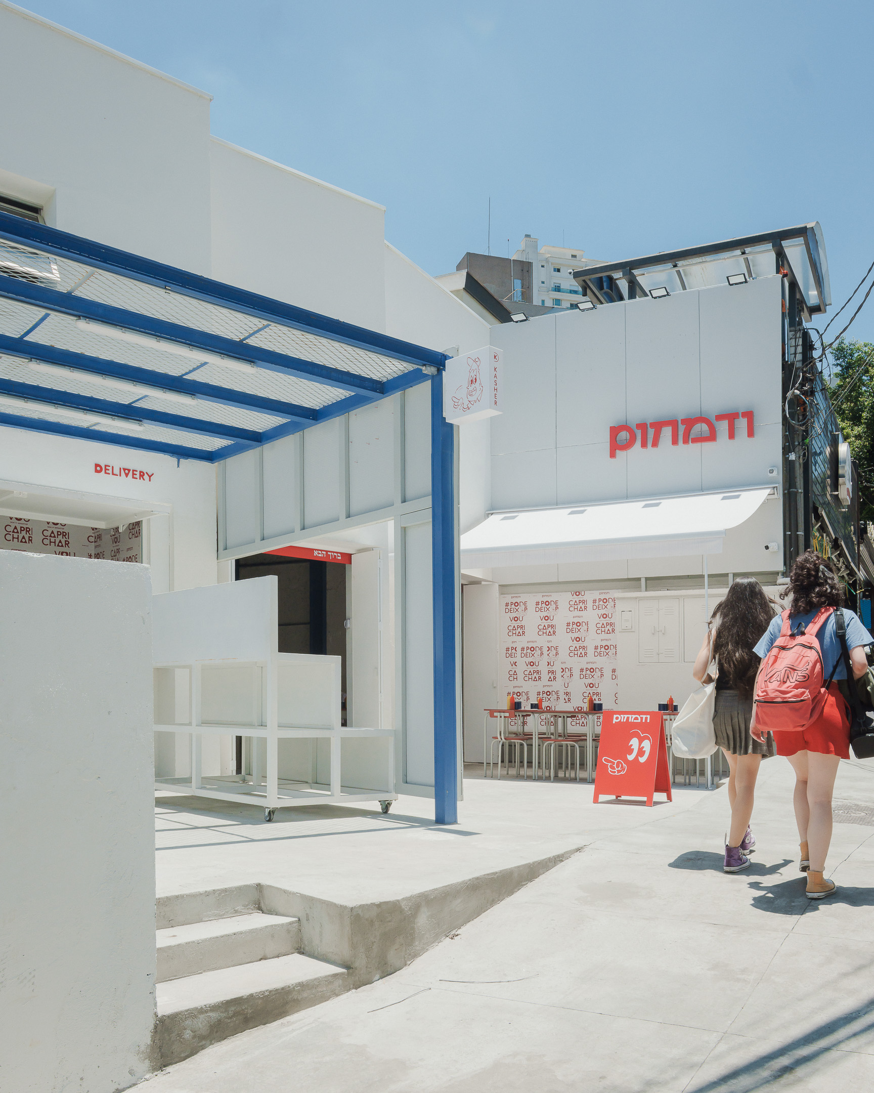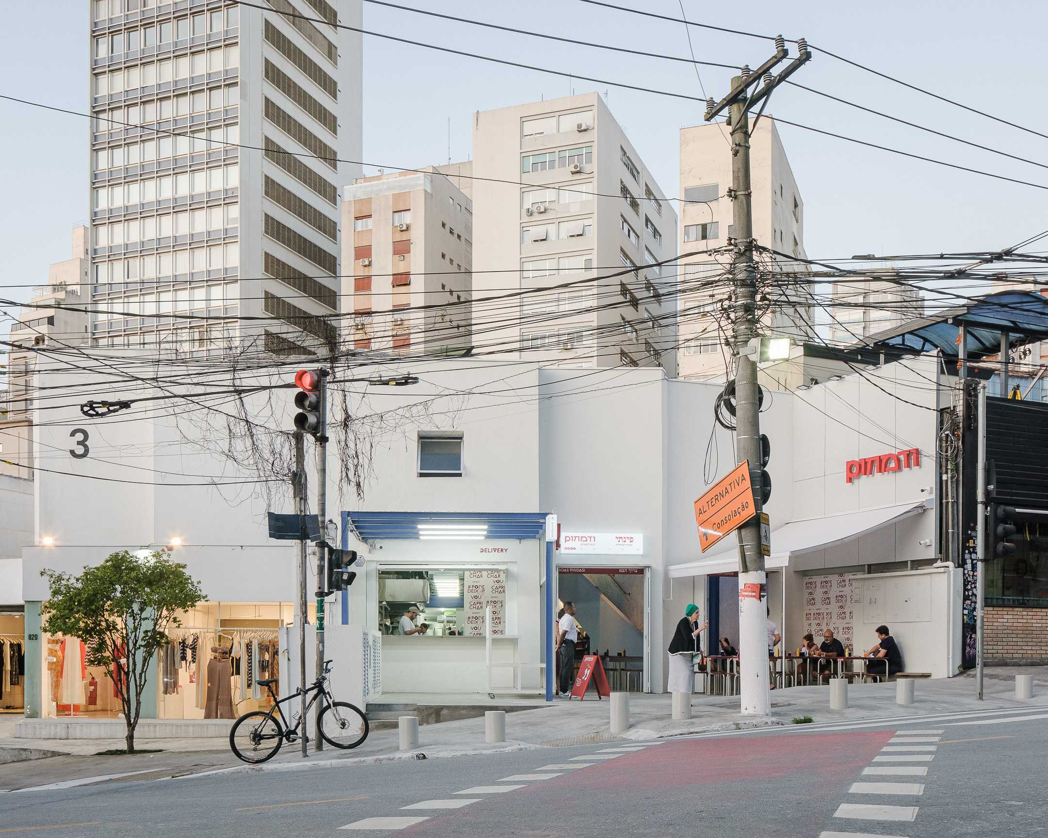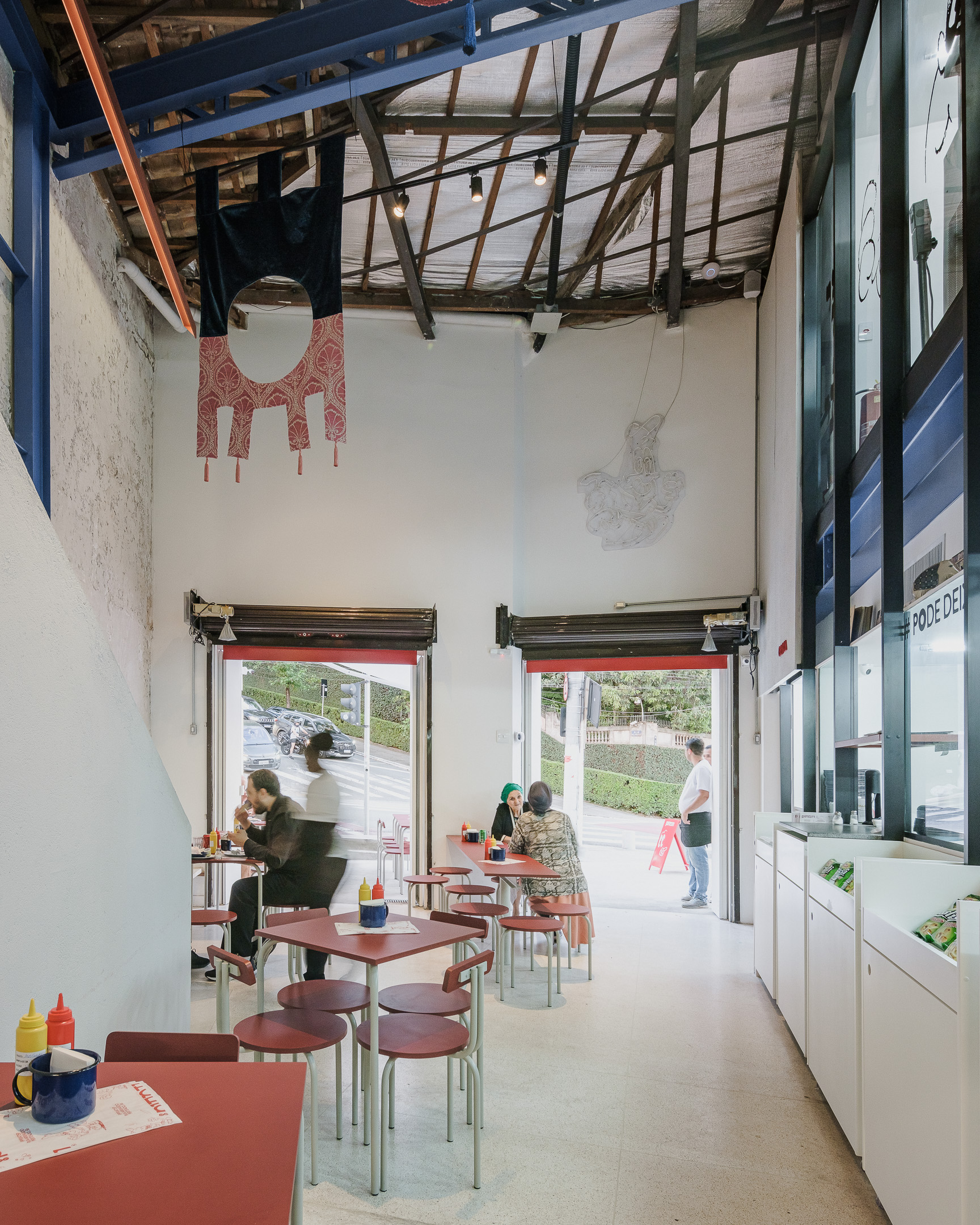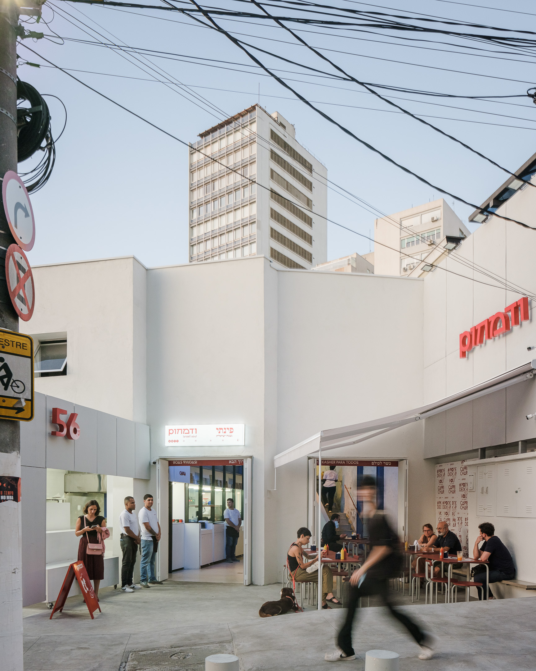 Pinati is an informal Isreali restaurant in Higienópolis neighborhood of São Paulo. With white cladded walls, red and blue highlights and stripped back interiors, this family eatery is a lively addition to a hectic street corner.