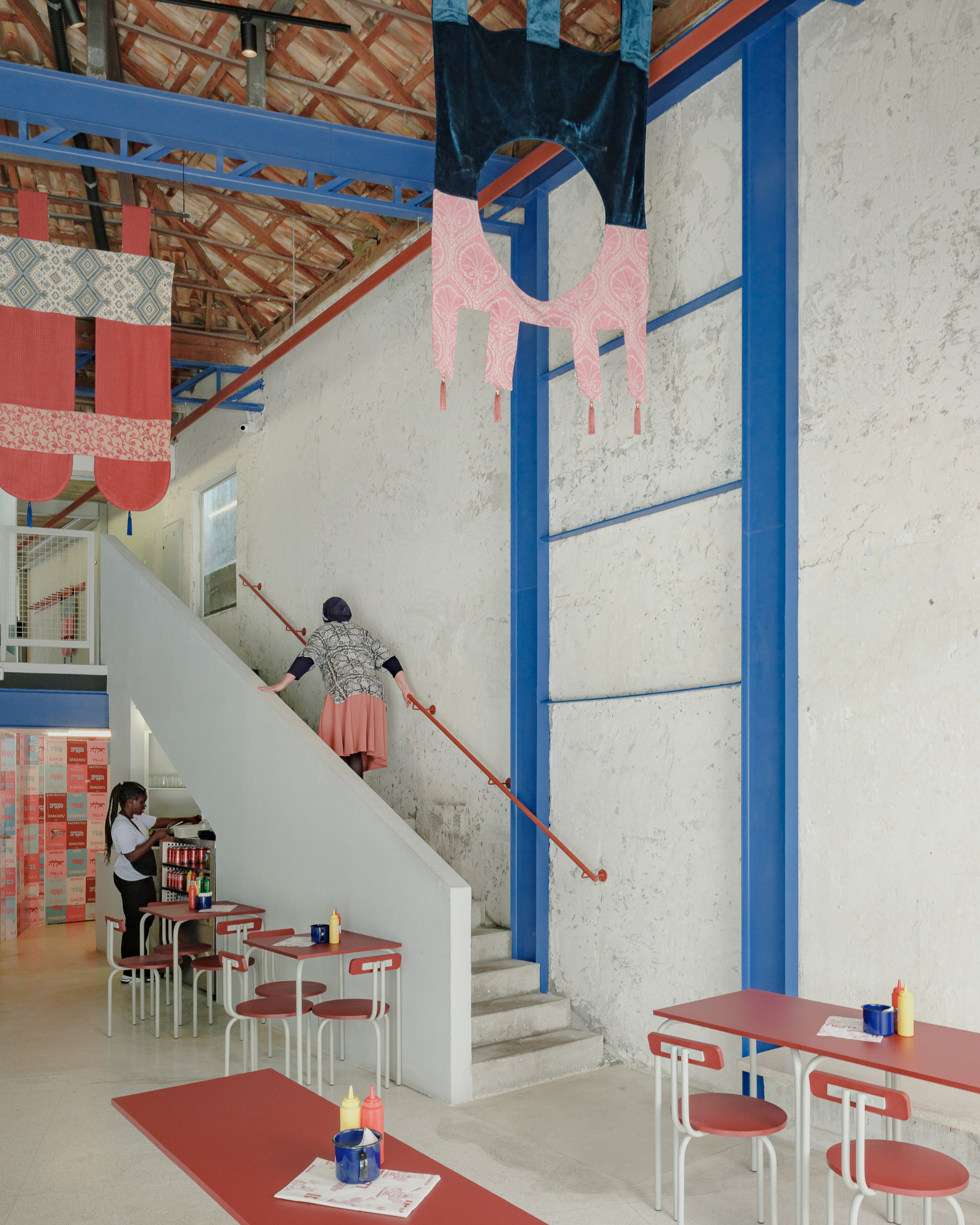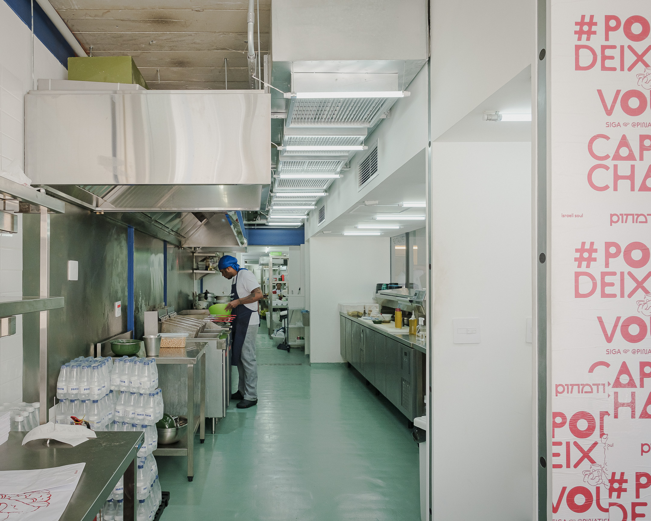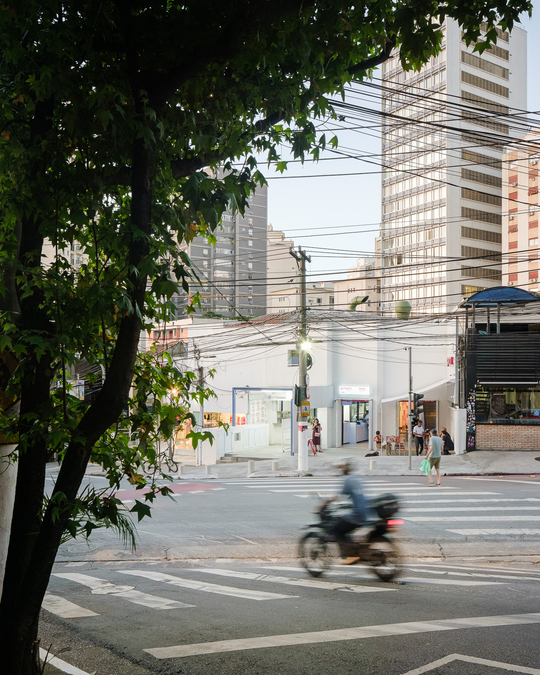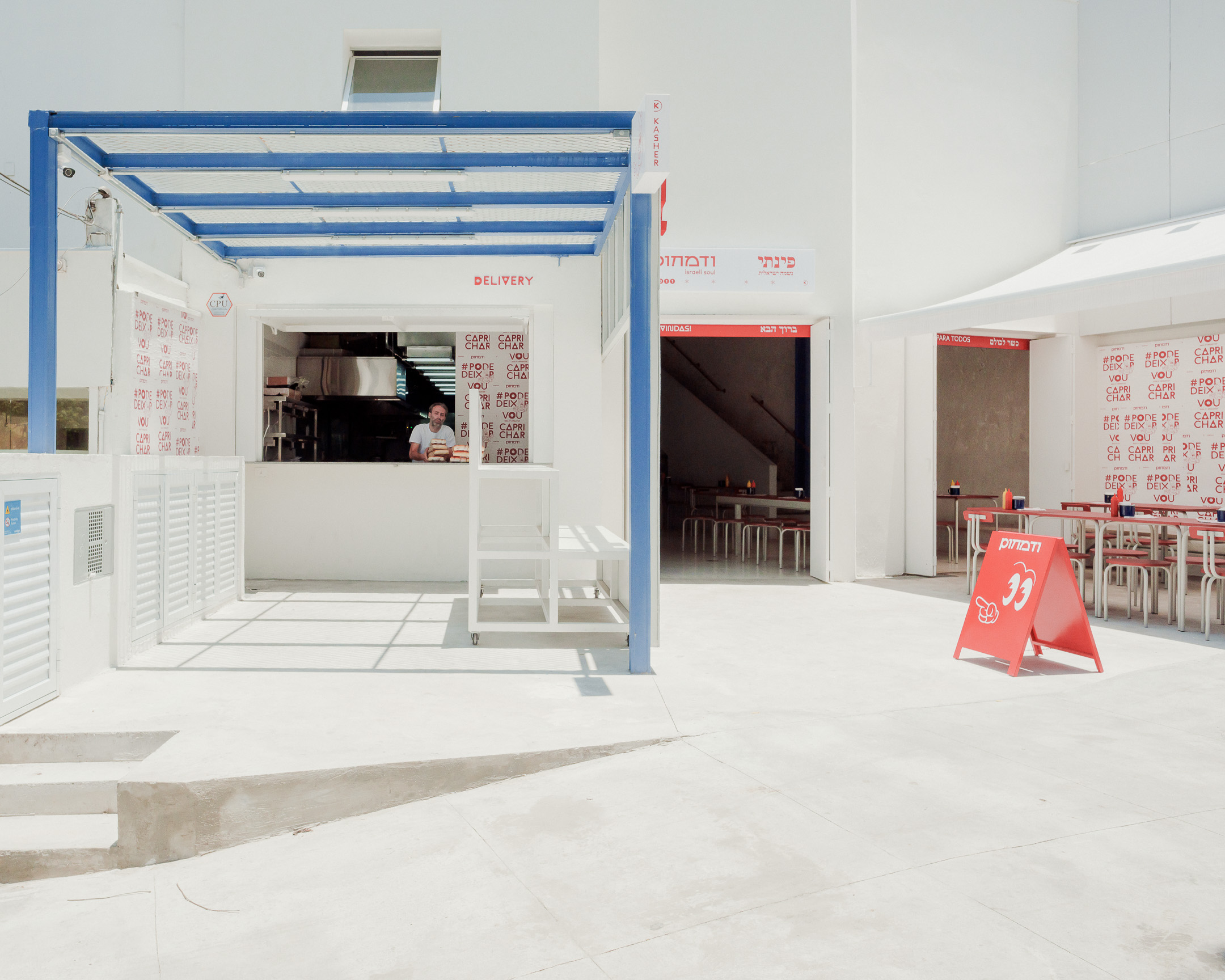 Pinati is an informal Isreali restaurant in Higienópolis neighborhood of São Paulo. With white cladded walls, red and blue highlights and stripped back interiors, this family eatery is a lively addition to a hectic street corner.