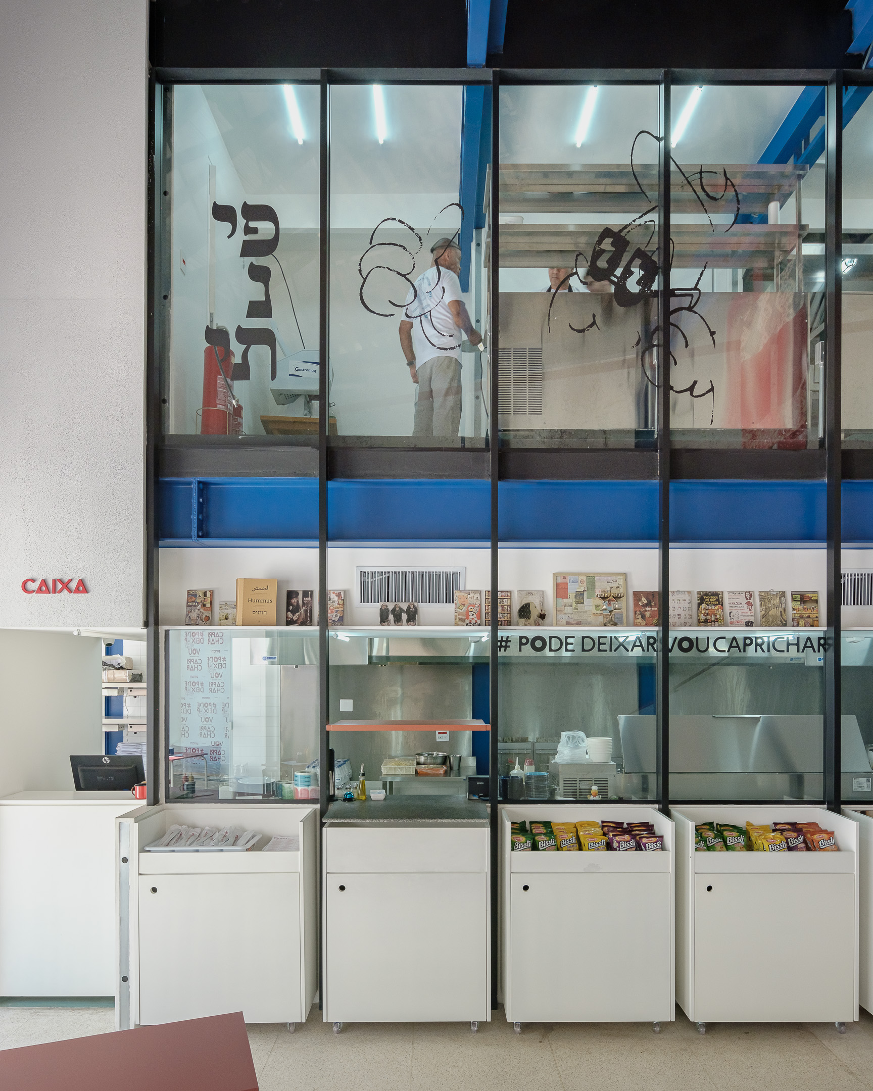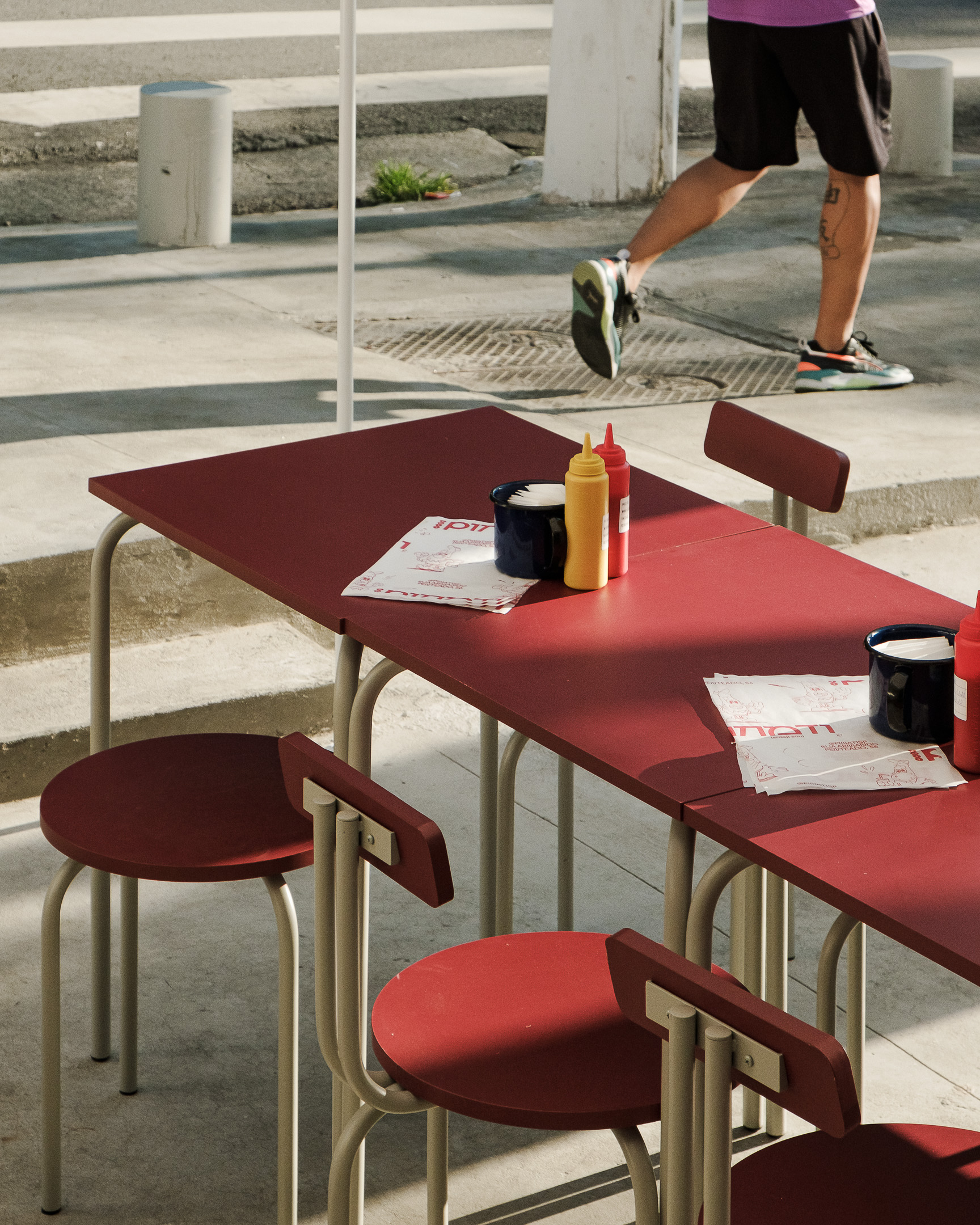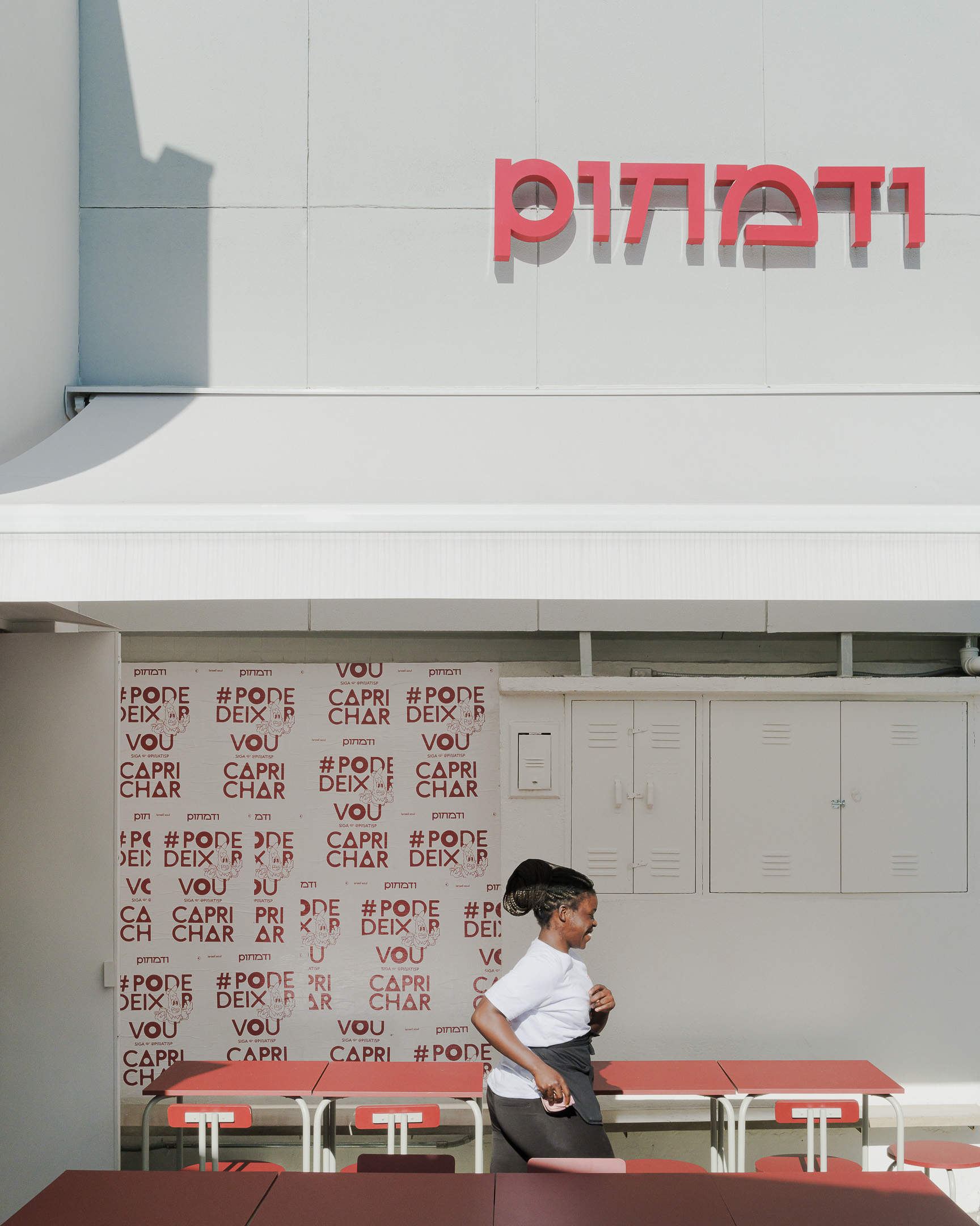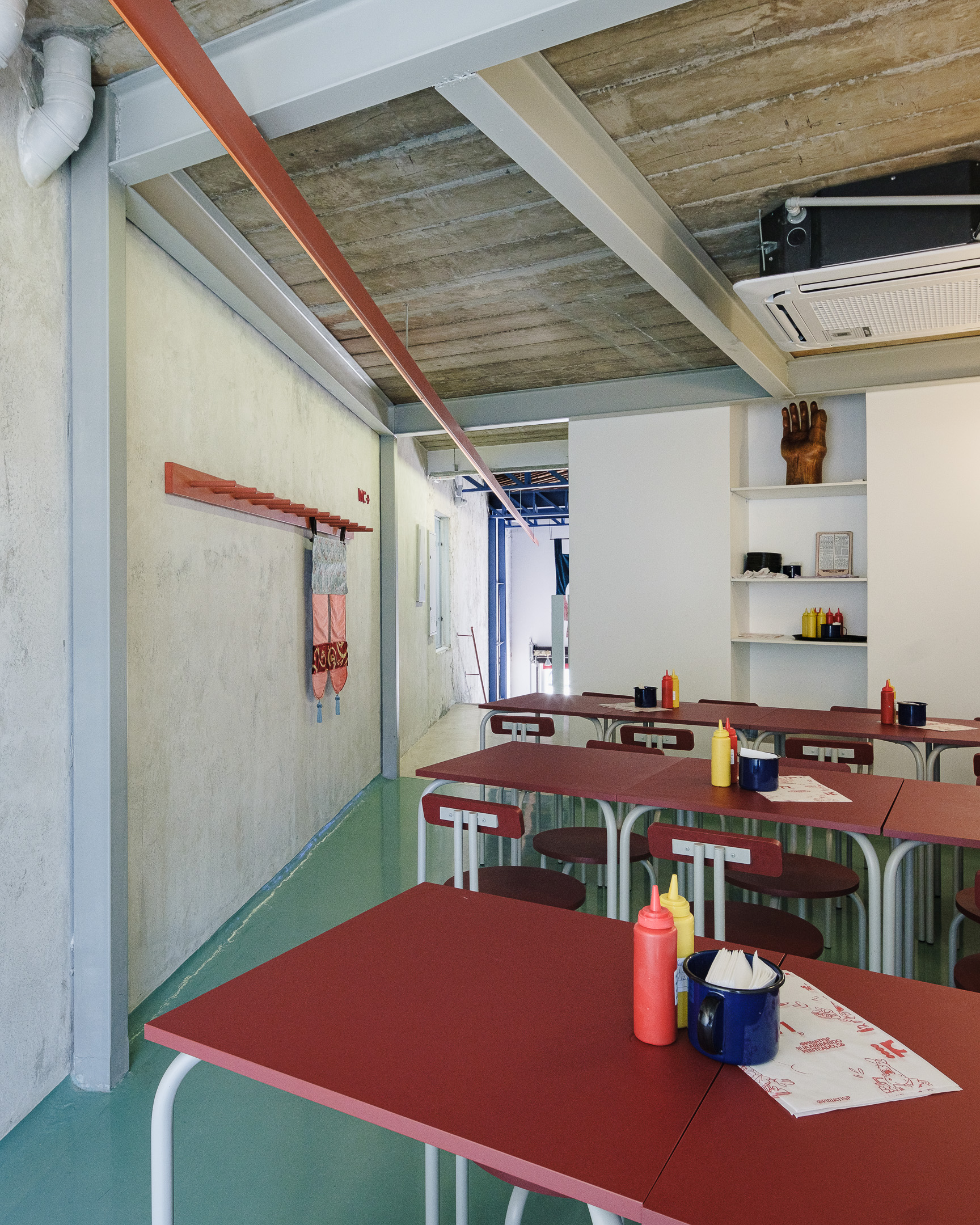 Pinati is an informal Isreali restaurant in Higienópolis neighborhood of São Paulo. With white cladded walls, red and blue highlights and stripped back interiors, this family eatery is a lively addition to a hectic street corner.