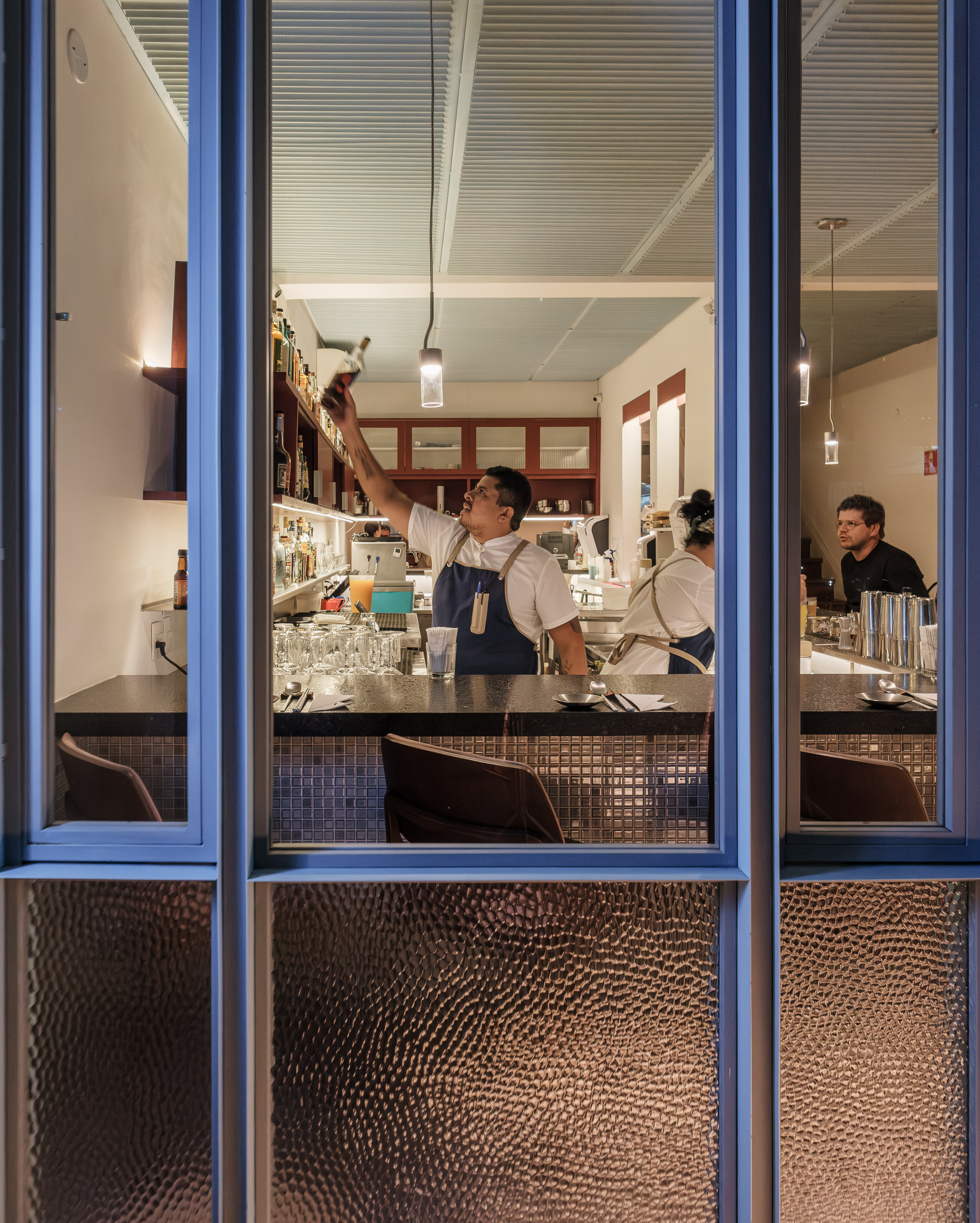 A Taiwanese restaurant in São Paulo Brazil features a metal and glass façade, granite and color accents.