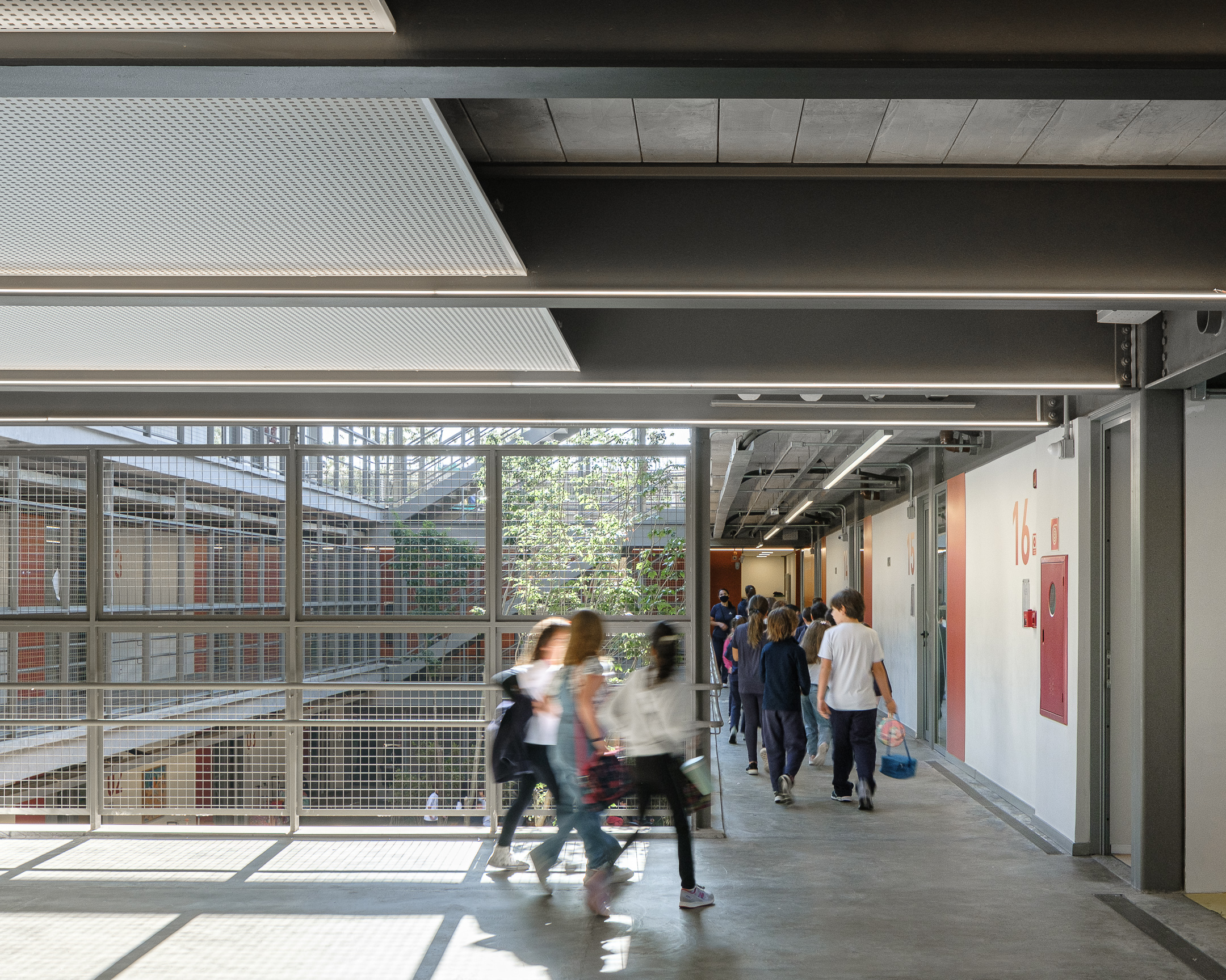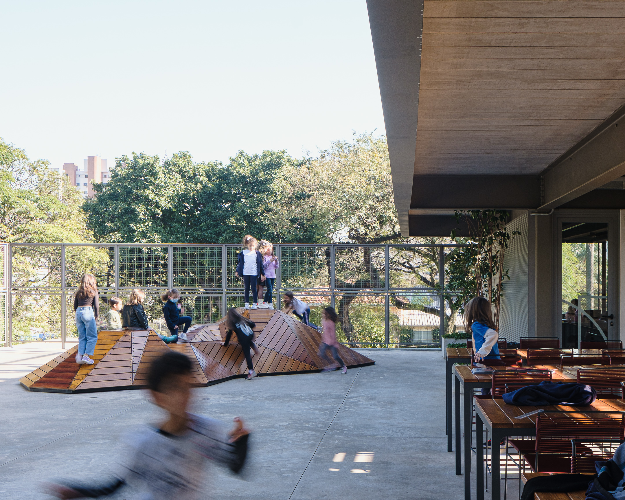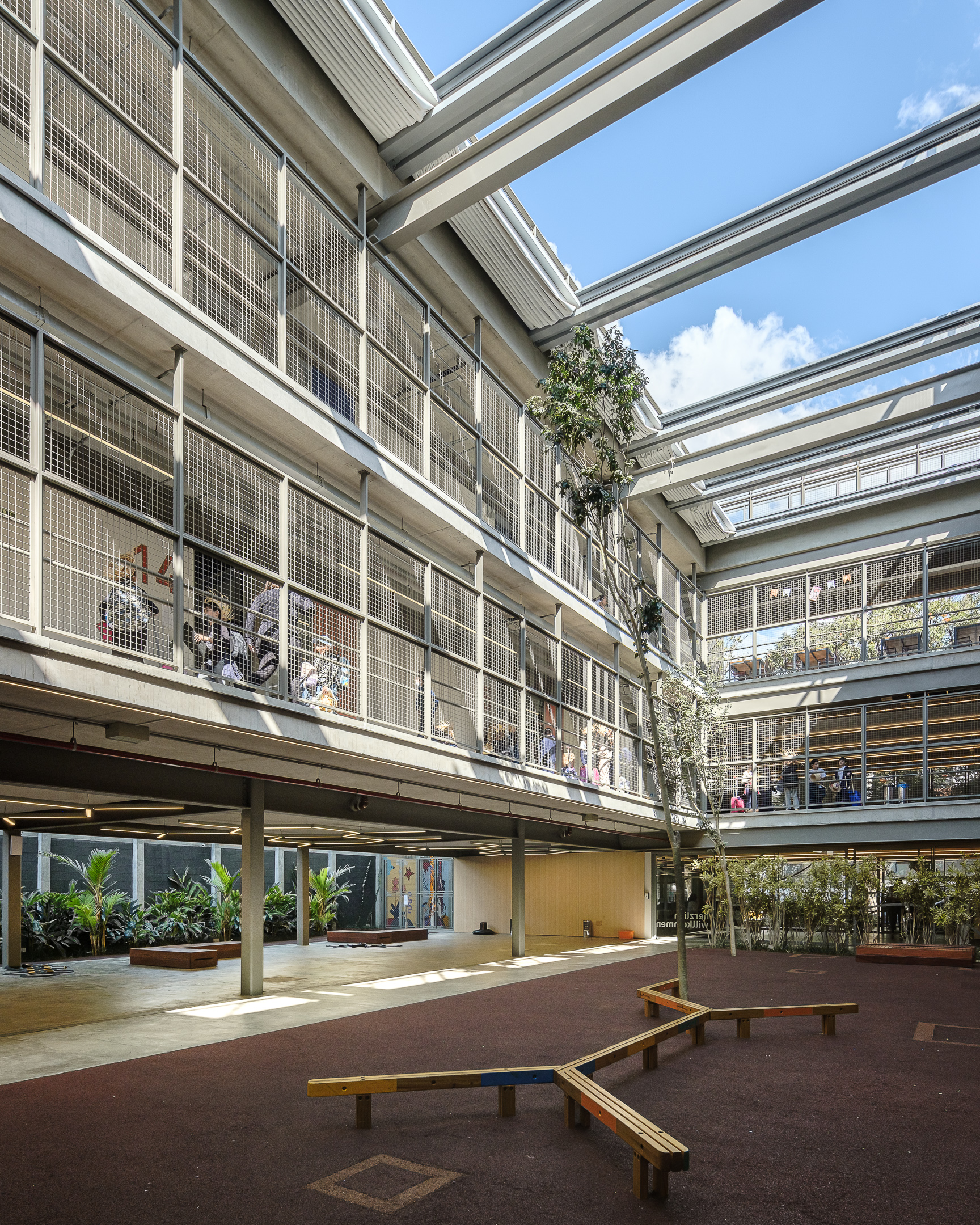 An elementary school features a lightweight metallic structure and a patio with a retractable roof.