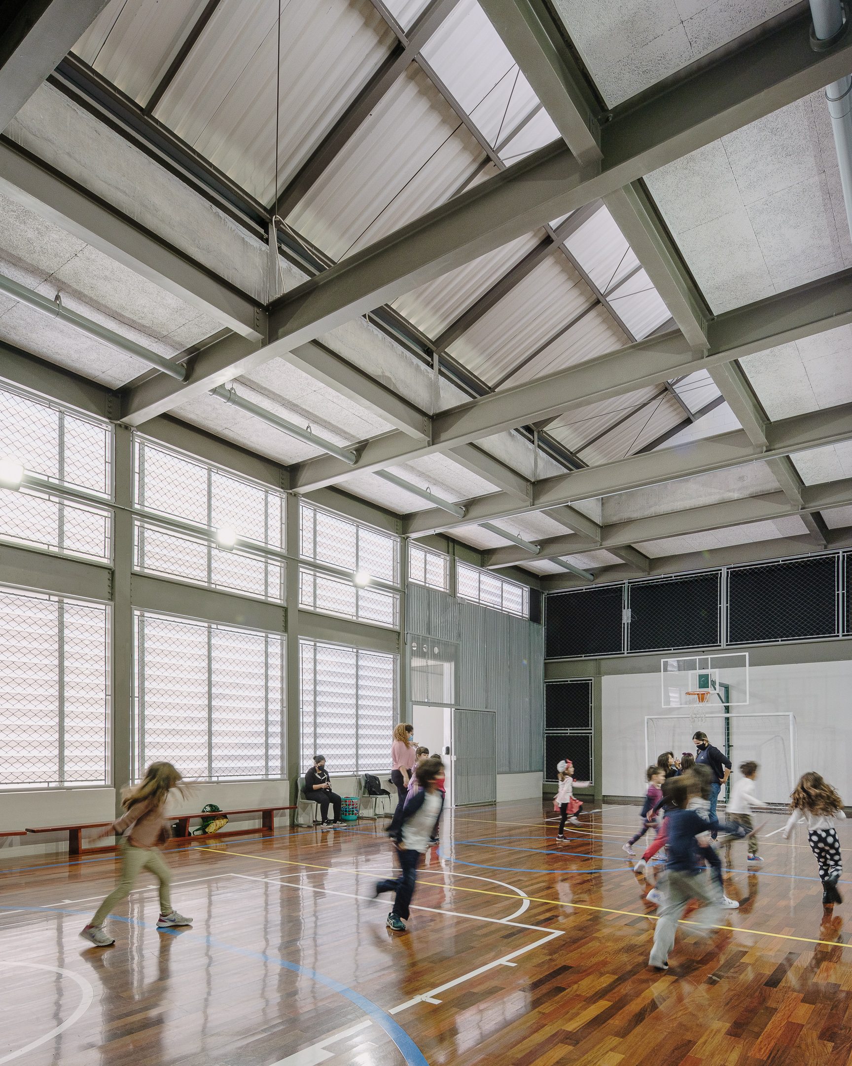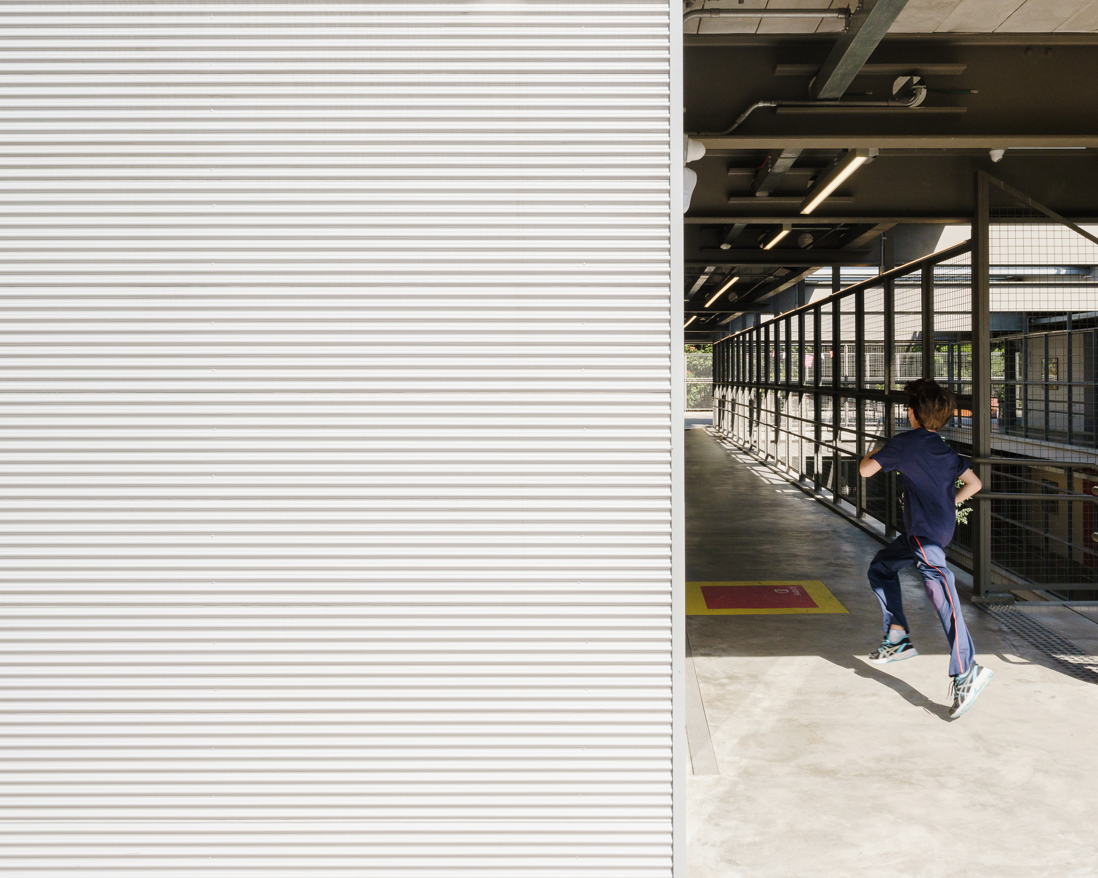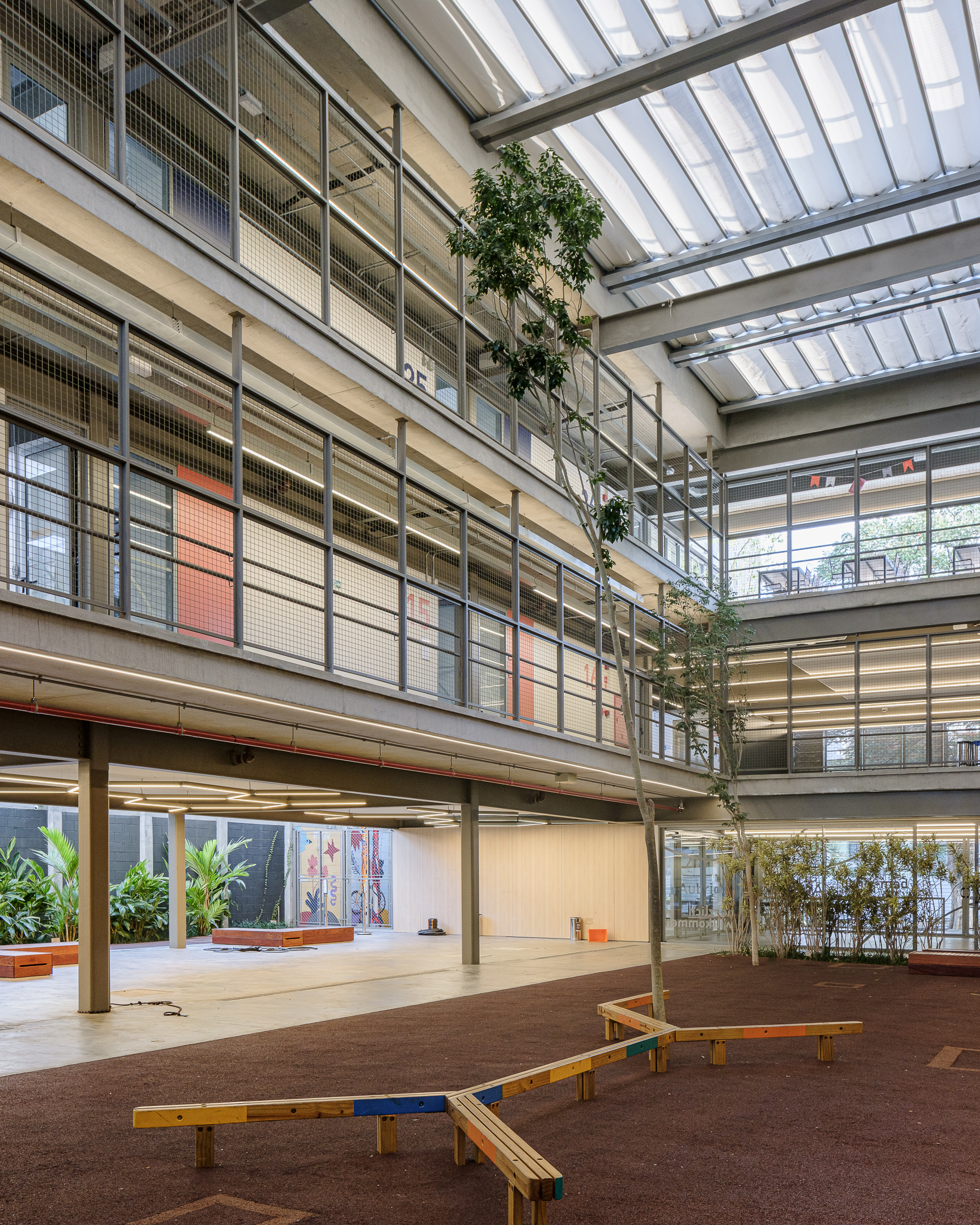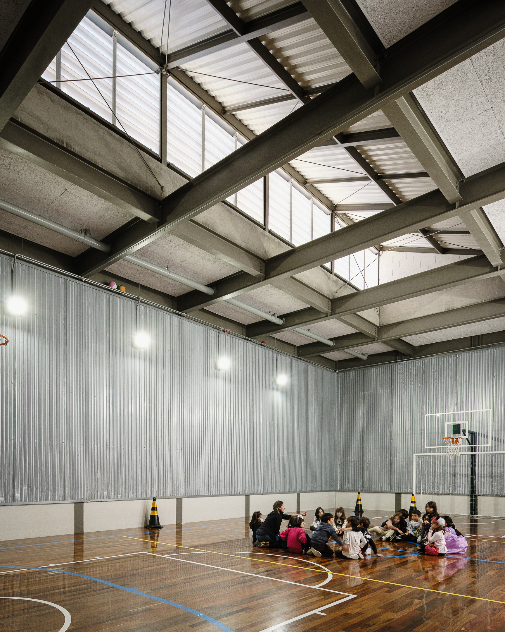 An elementary school features a lightweight metallic structure and a patio with a retractable roof.
