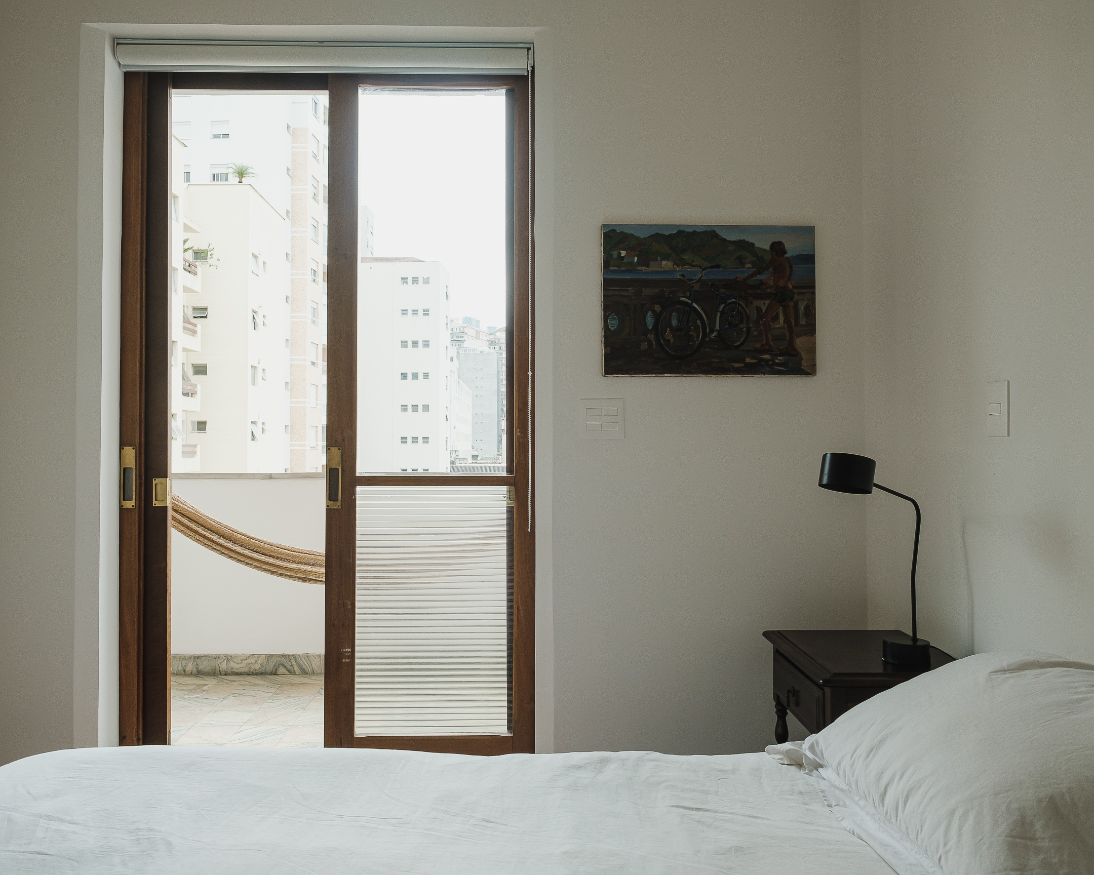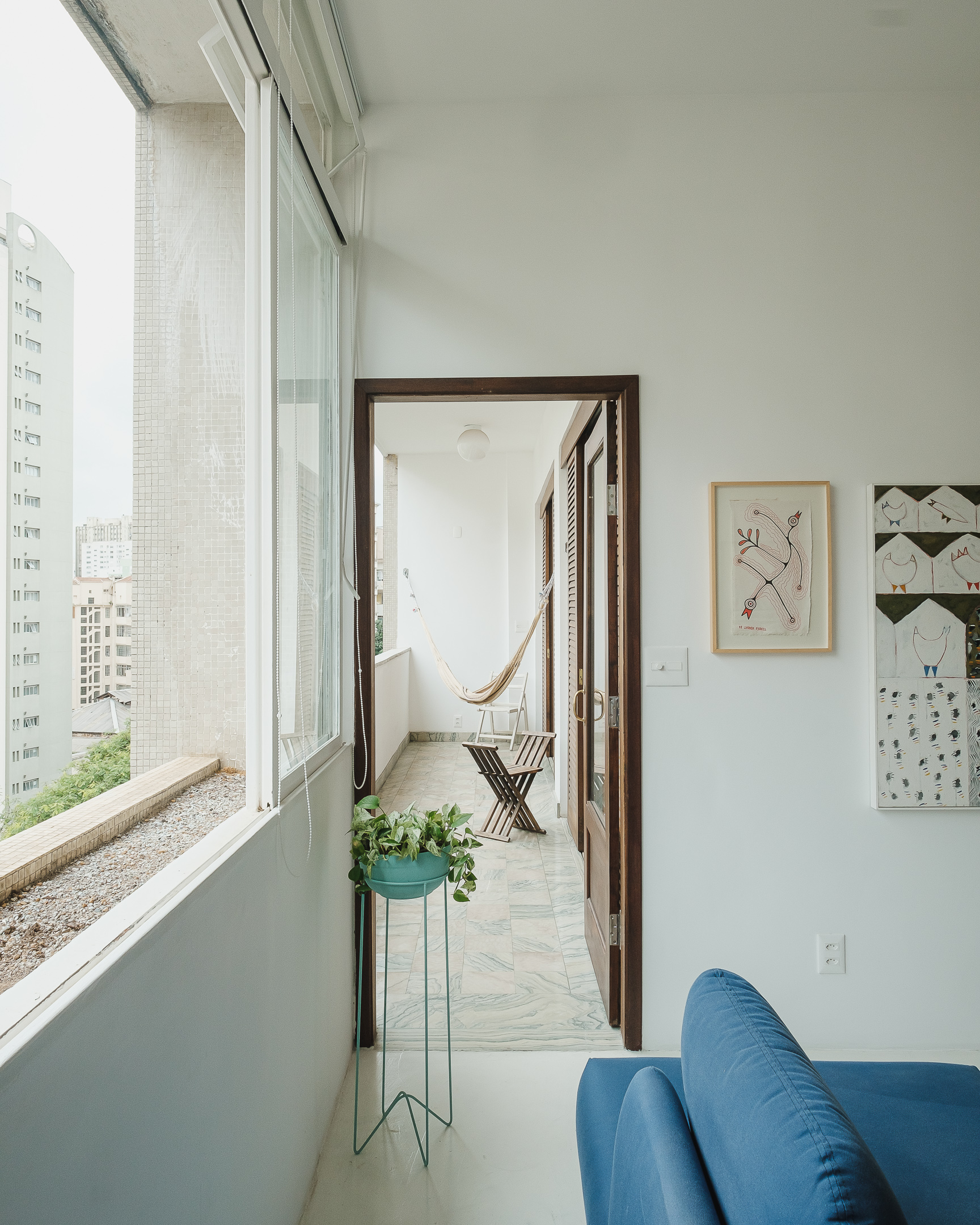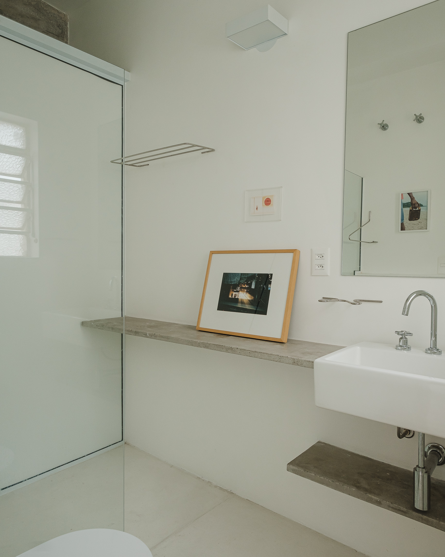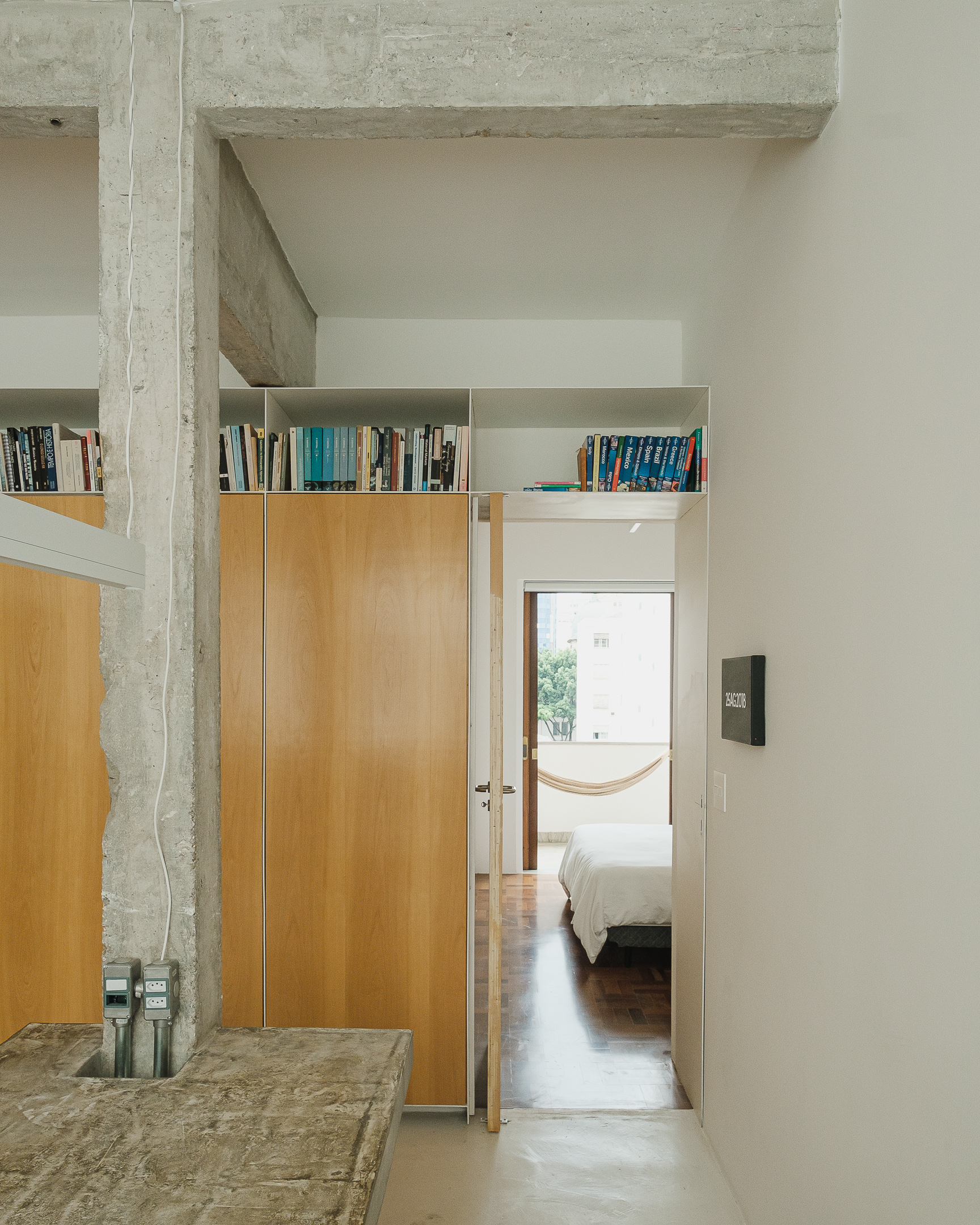 This renovation of an apartment in downtown São Paulo exposed the building’s structure, adding two concrete tables, book shelving and a subtle toned color palette.