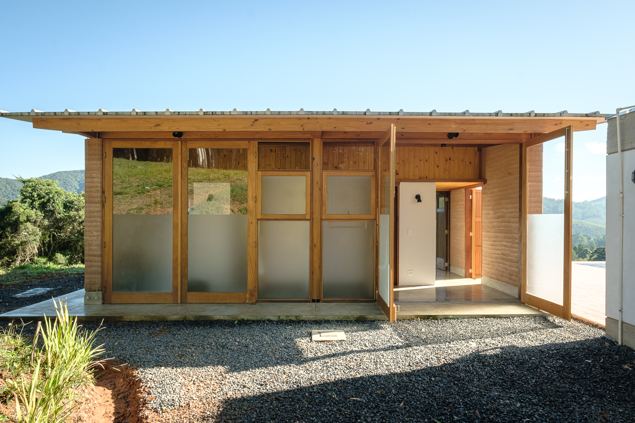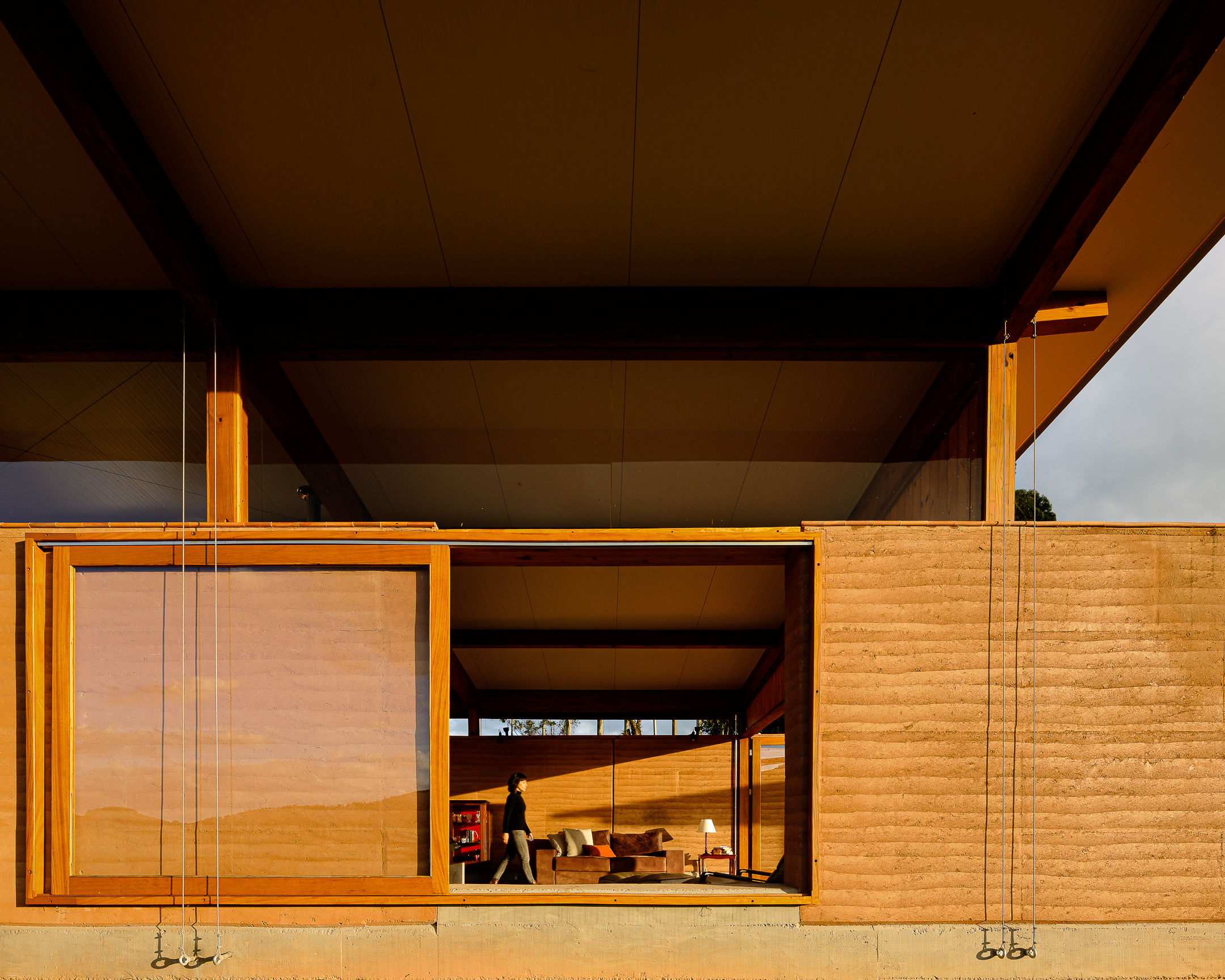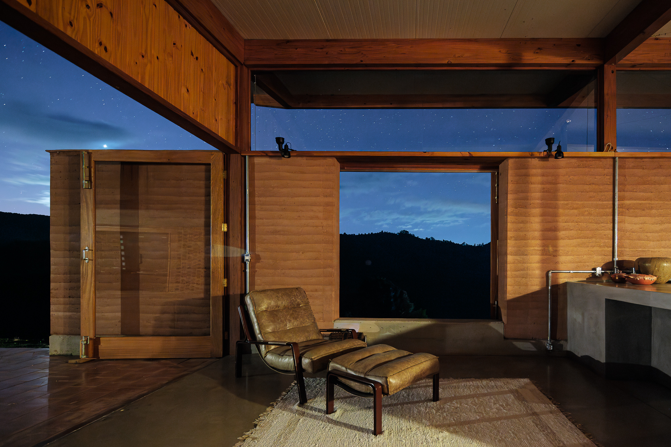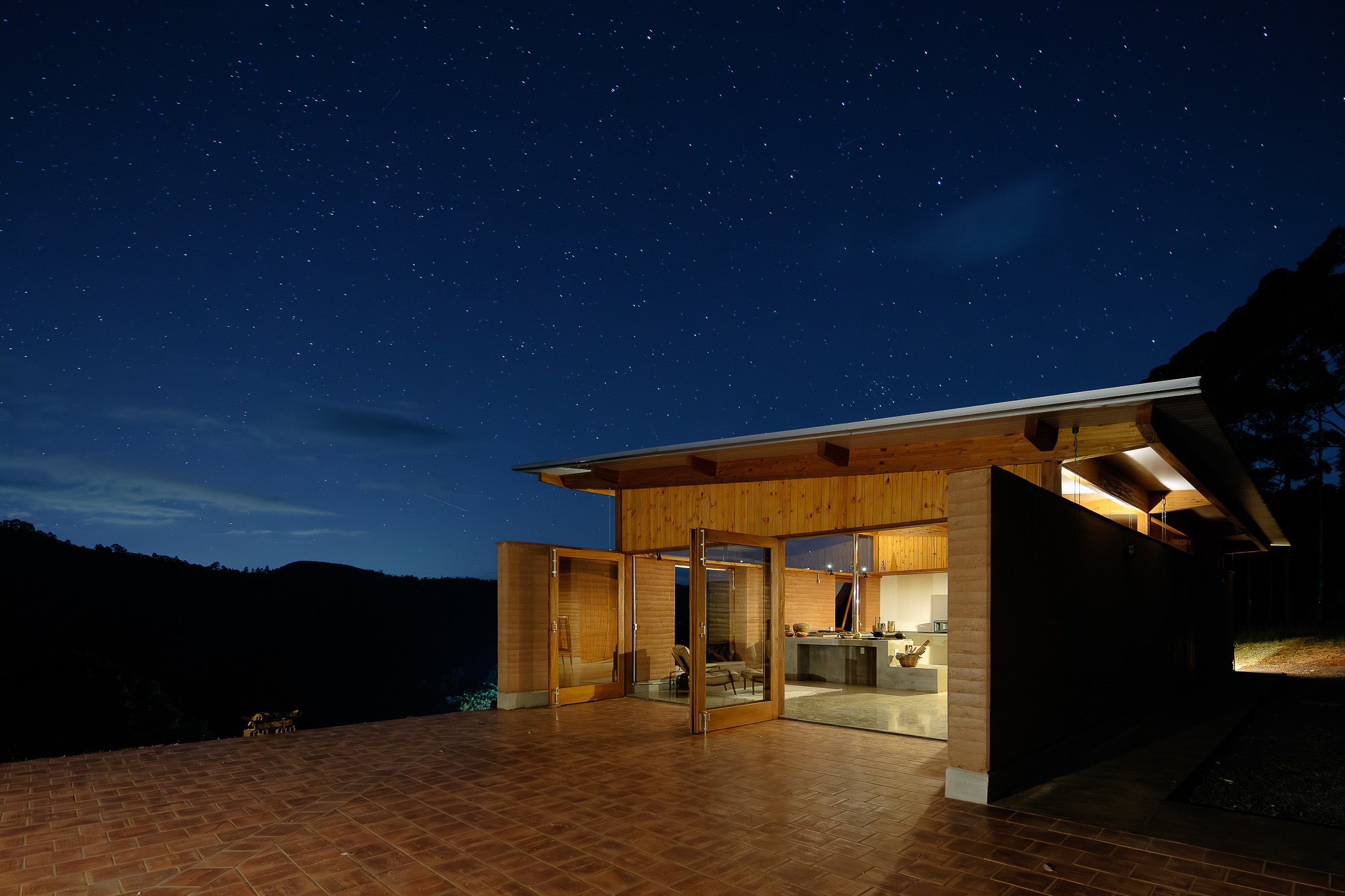 Overlooking the Mantiqueira mountains, a house built with rammed earth and local materials.