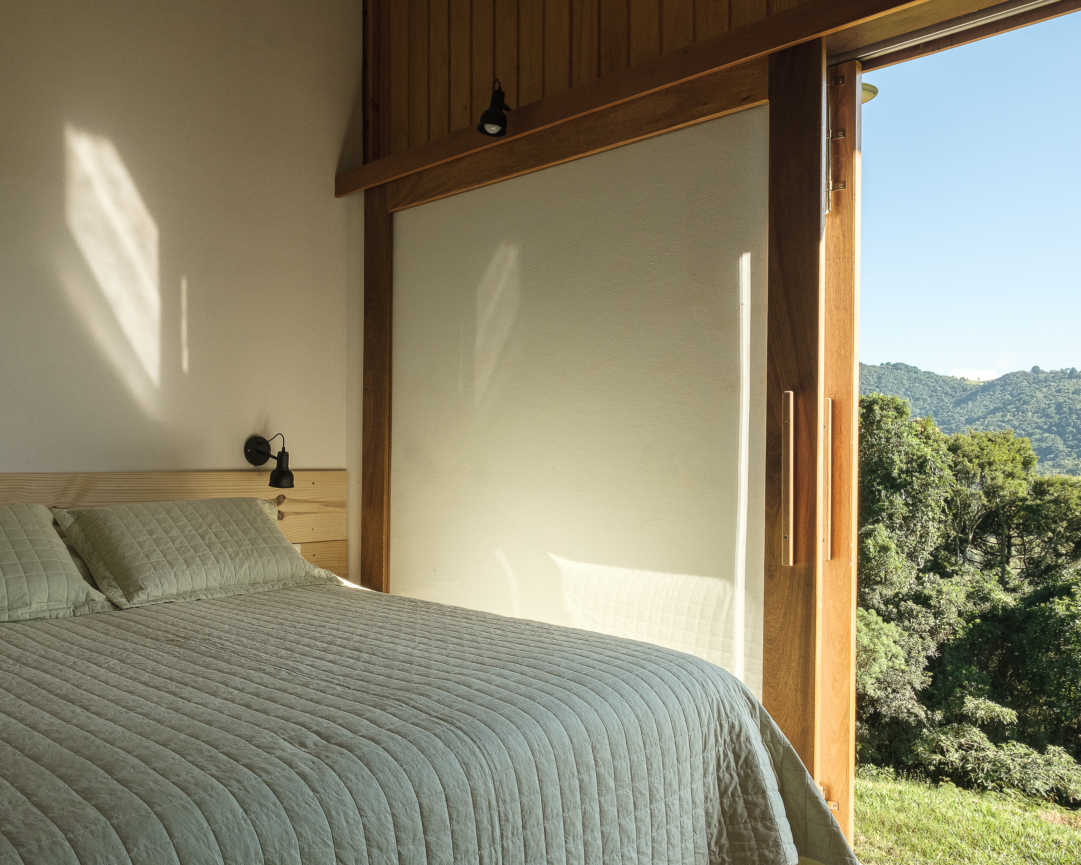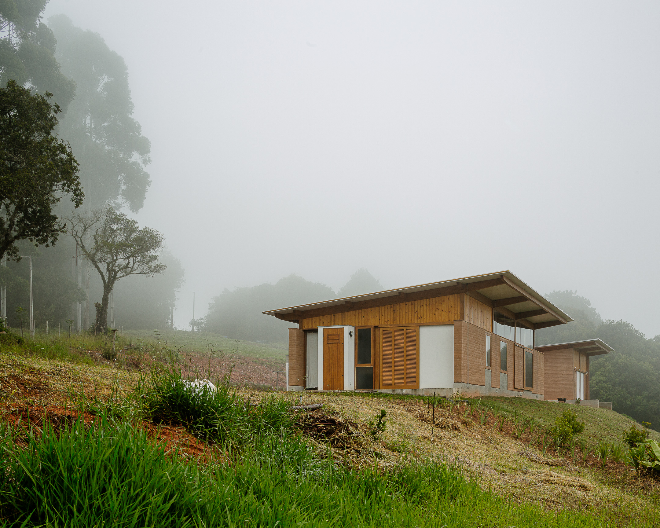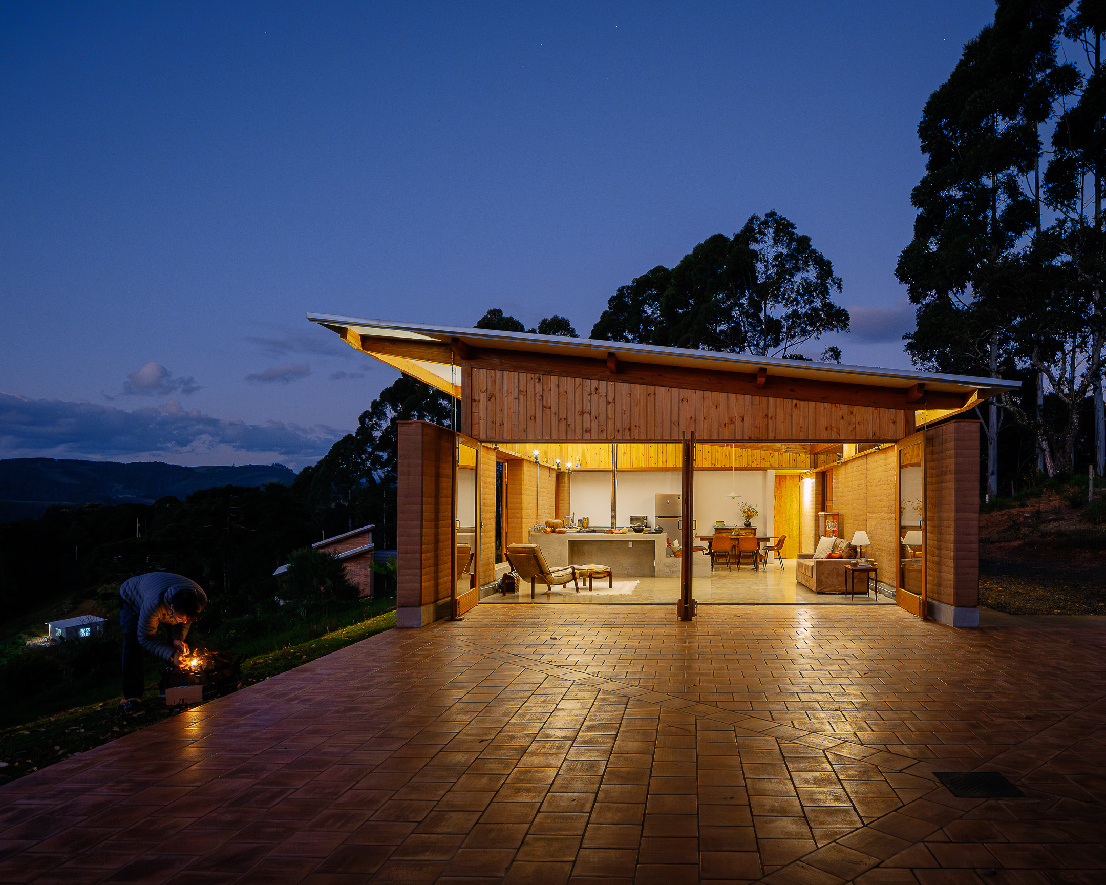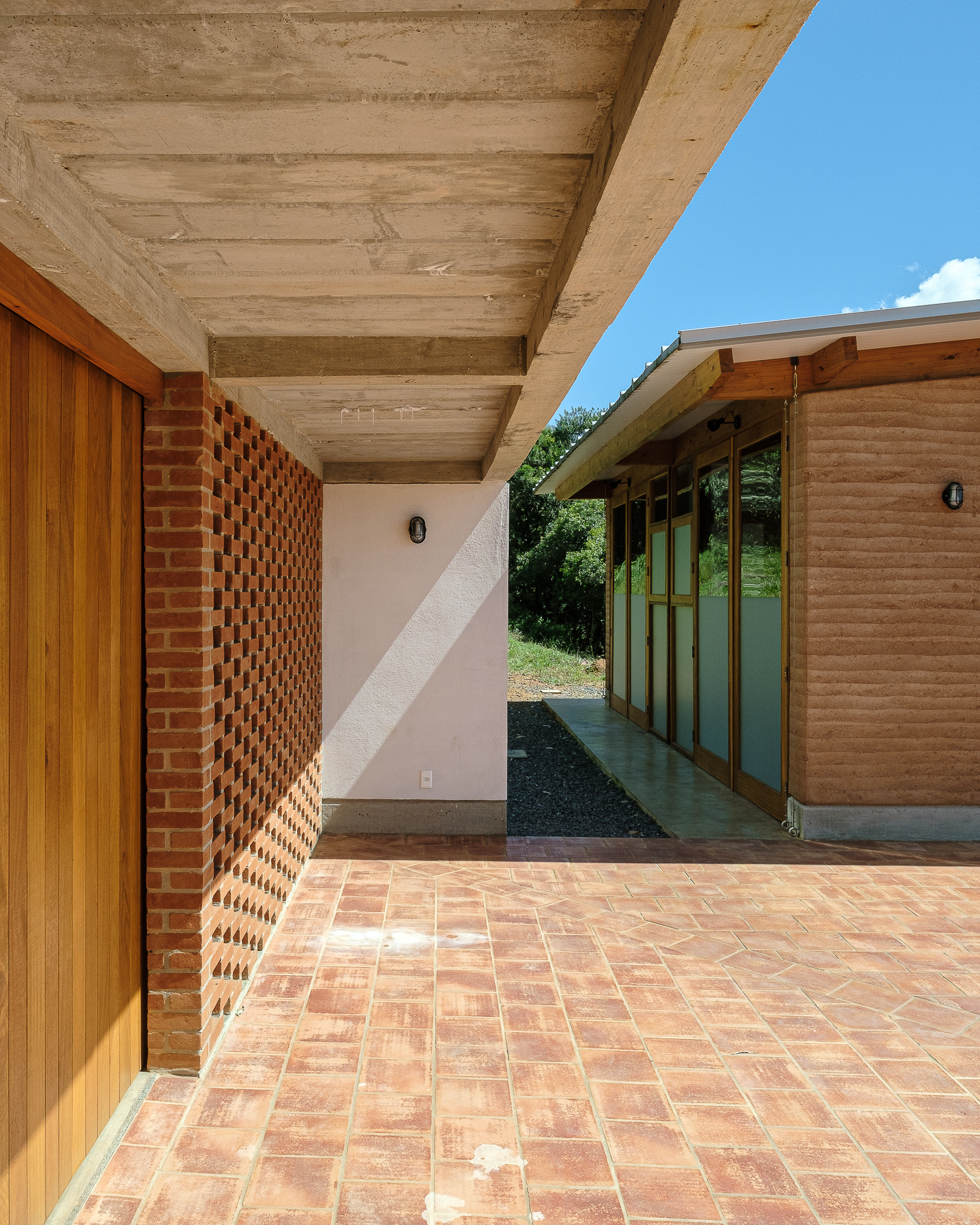 Overlooking the Mantiqueira mountains, a house built with rammed earth and local materials.