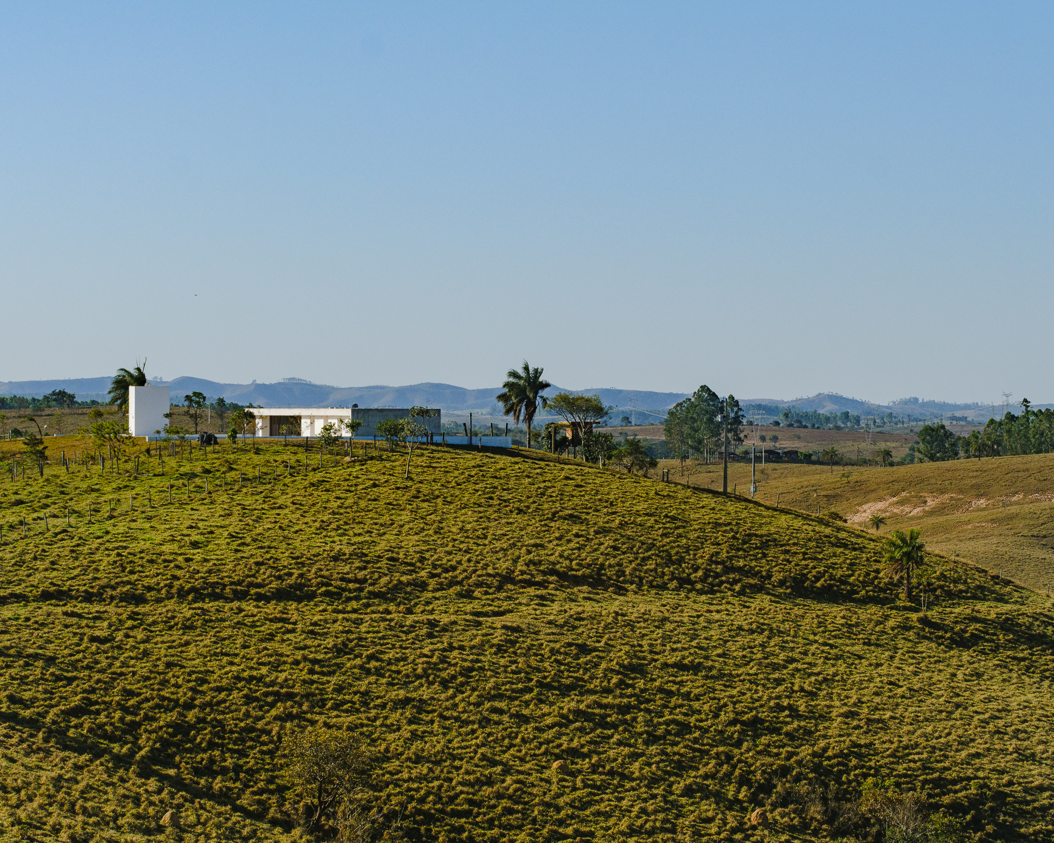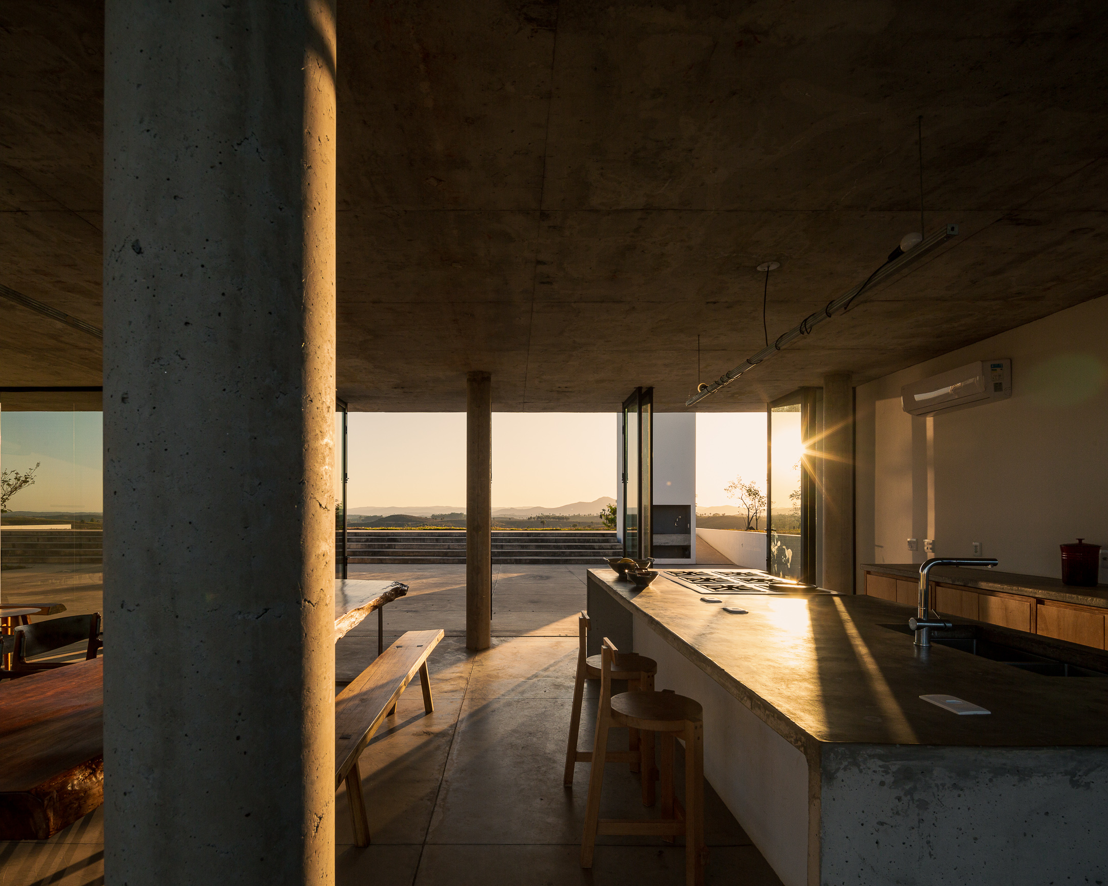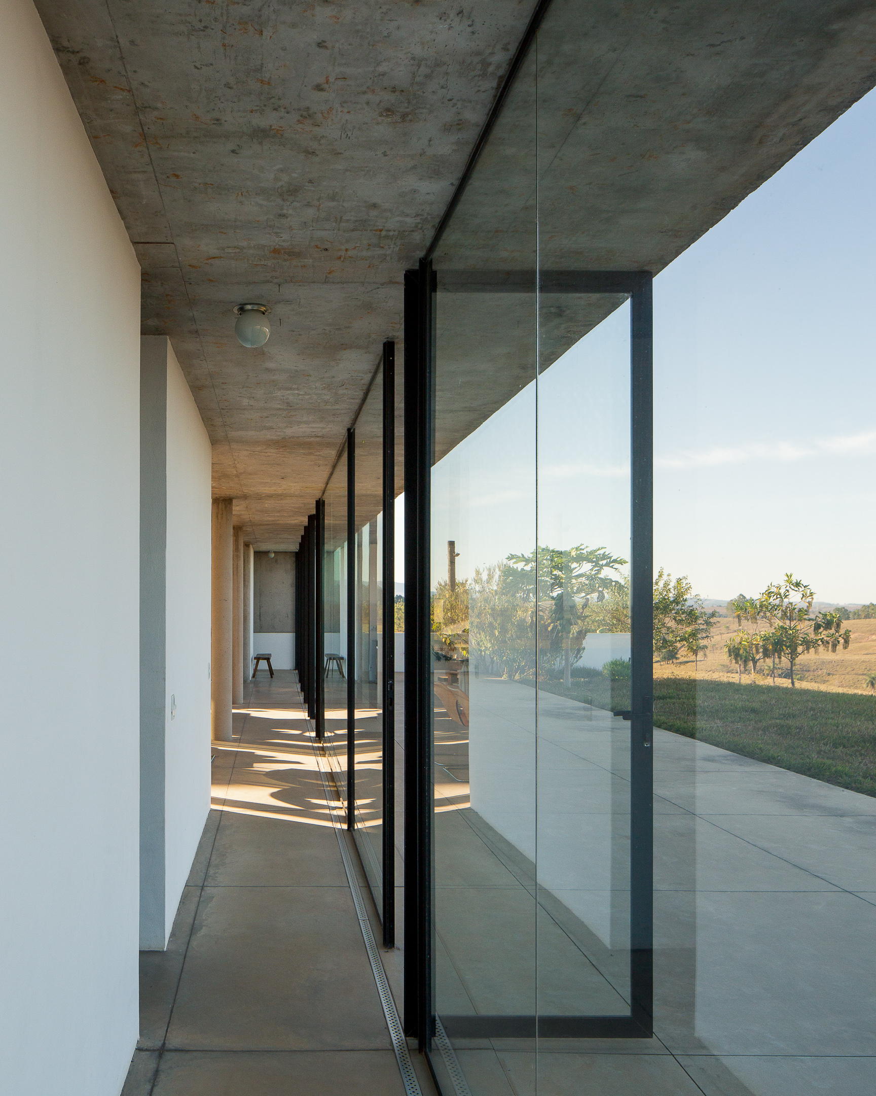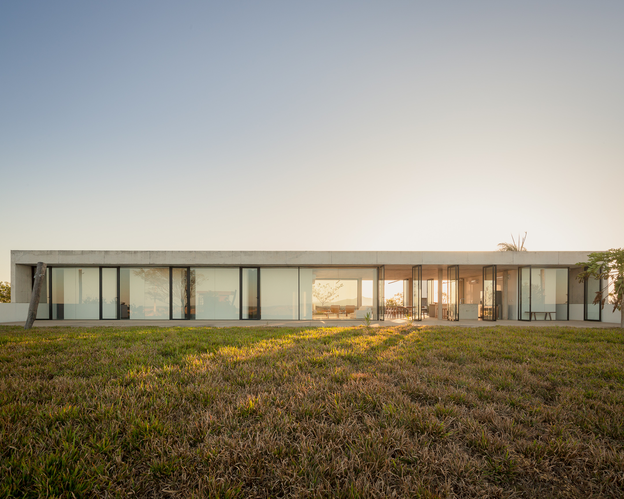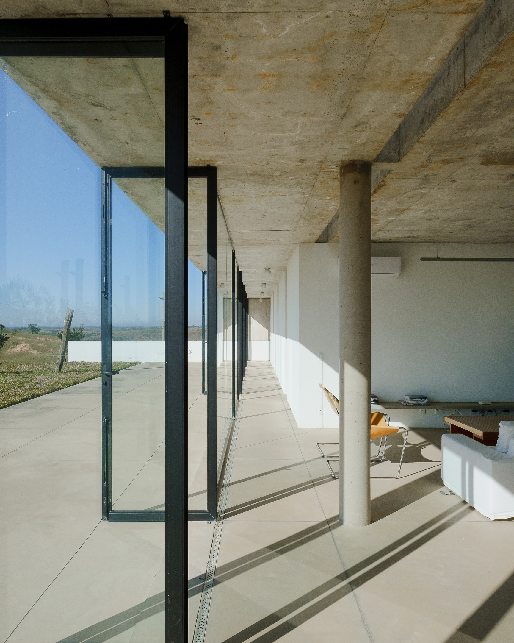 In the deep country side of brazilian state of Minas Gerais, this home in concrete and glass emerges from a hilltop. Featuring sweeping views of grasslands, meadows, and a patio for sky gazing, this house mediates the landscape through architecture.