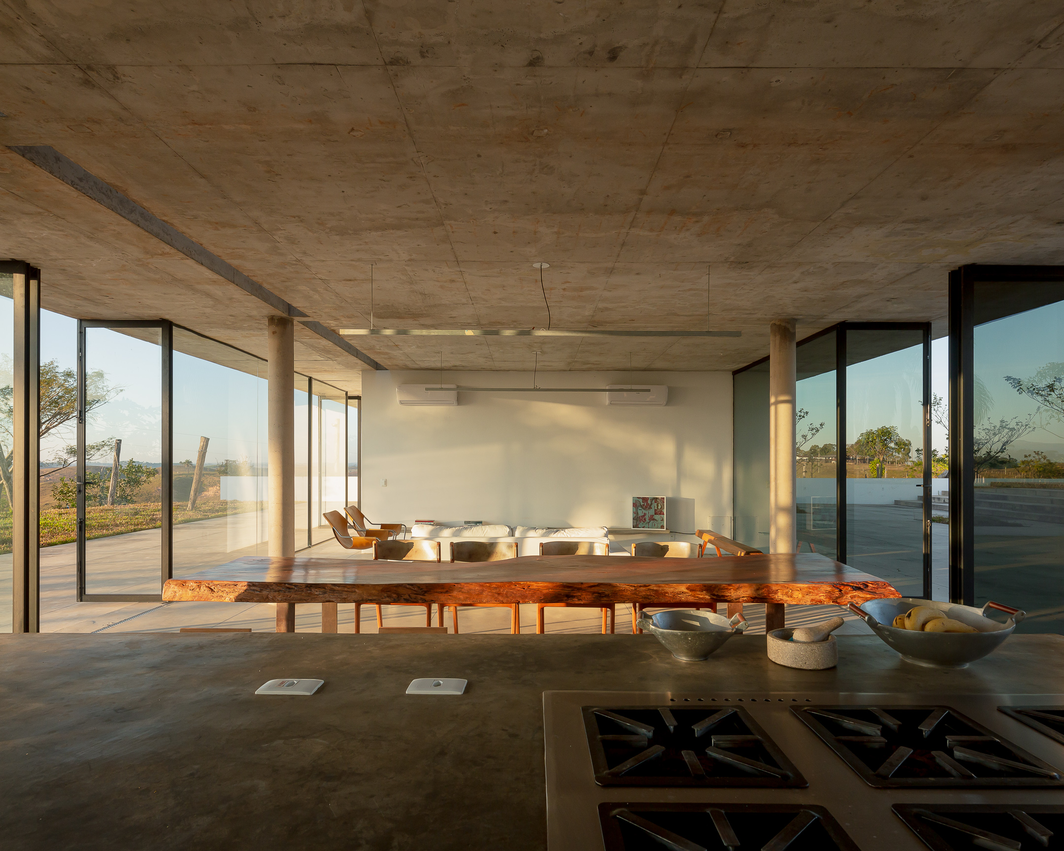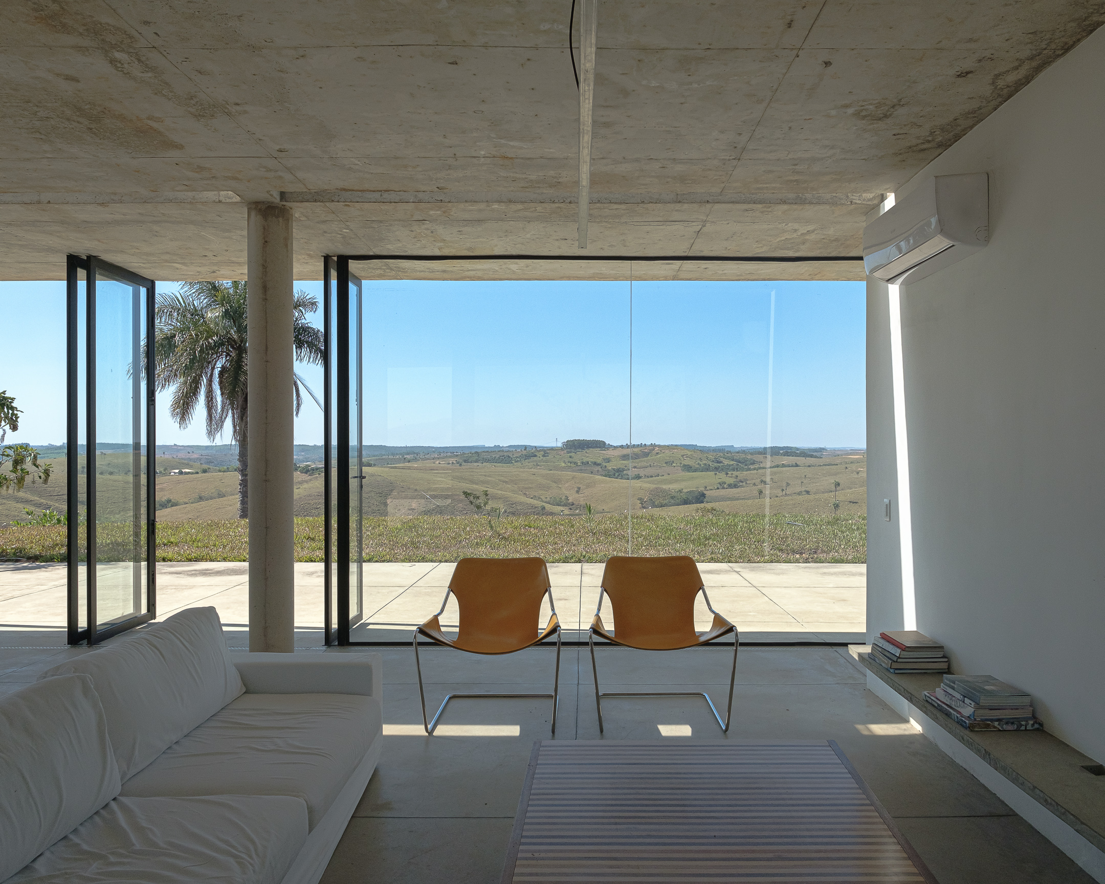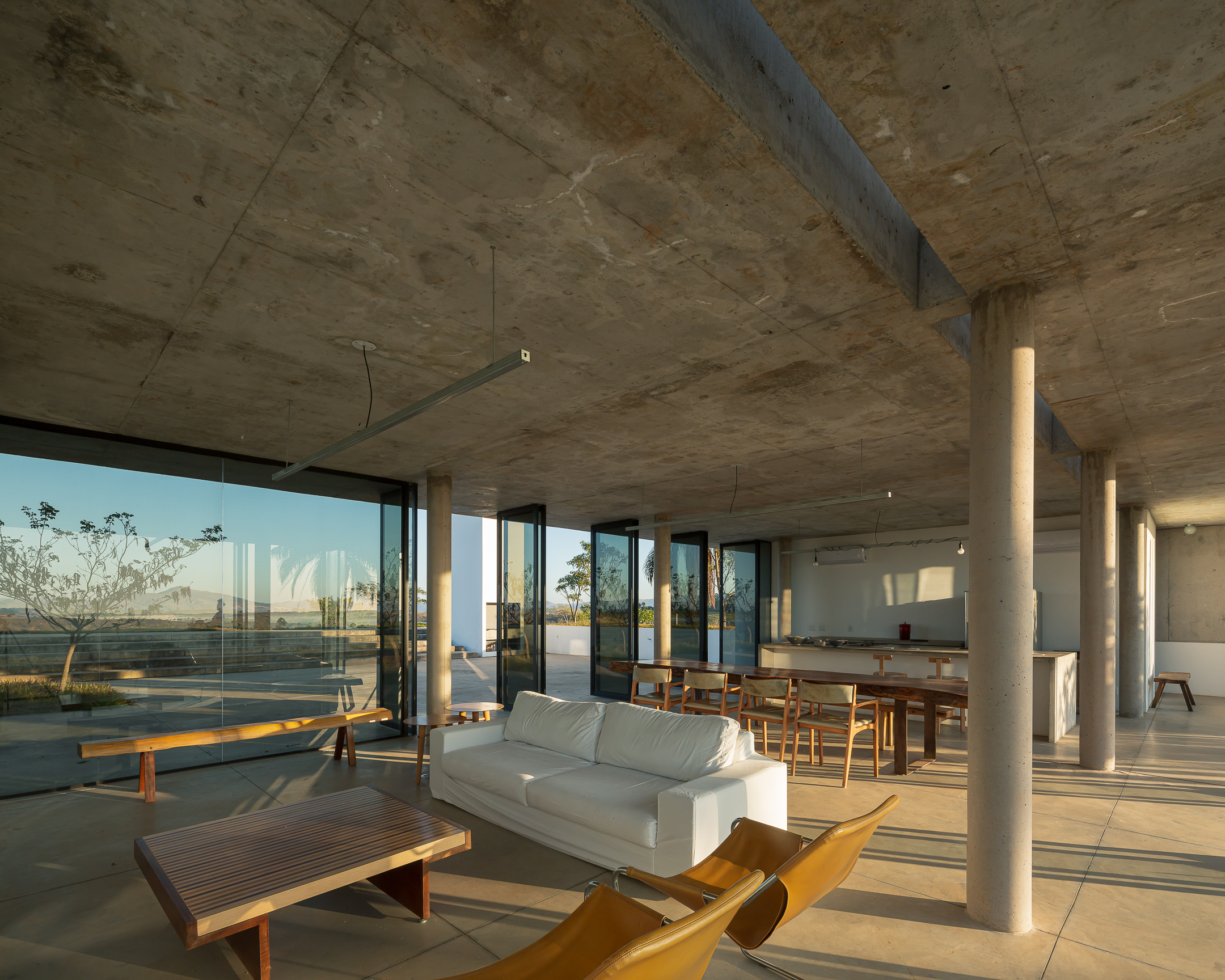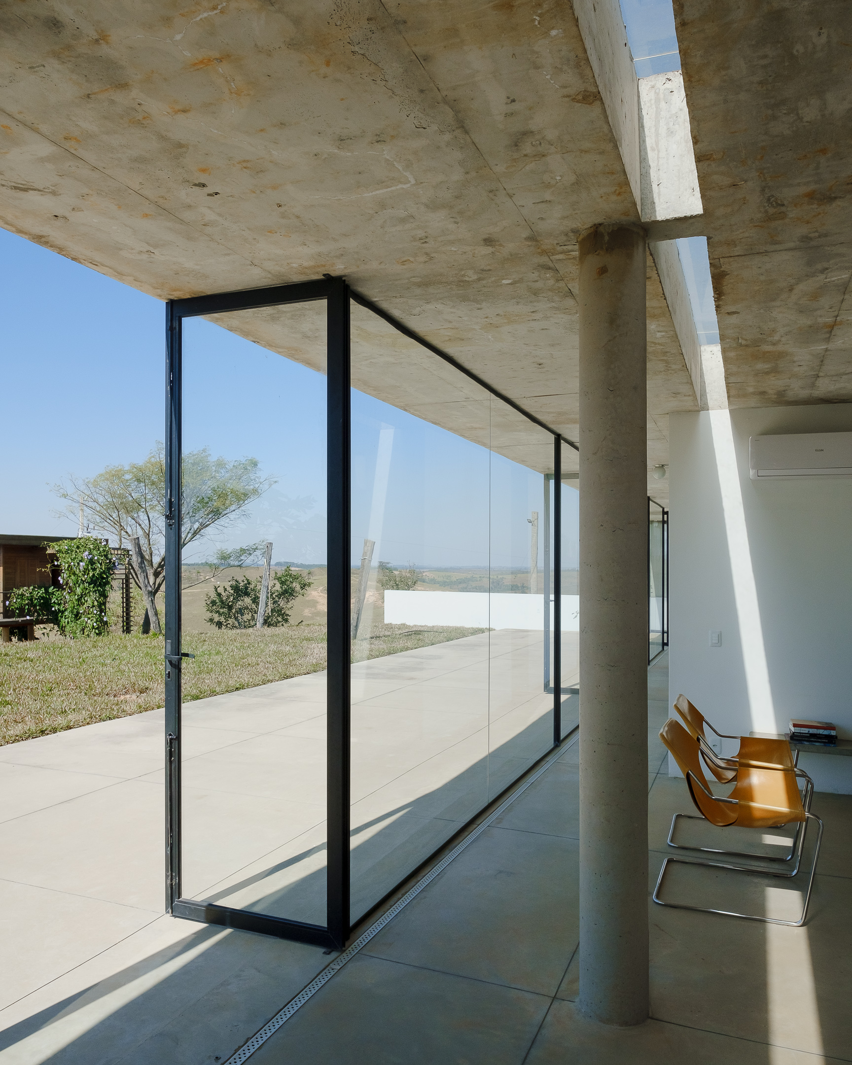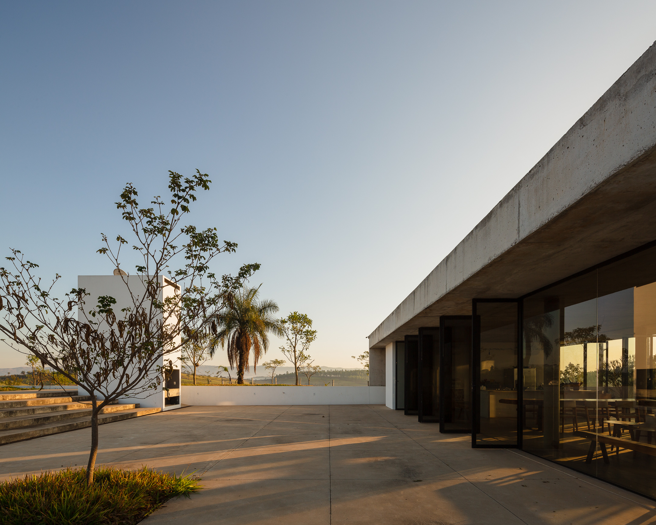 In the deep country side of brazilian state of Minas Gerais, this home in concrete and glass emerges from a hilltop. Featuring sweeping views of grasslands, meadows, and a patio for sky gazing, this house mediates the landscape through architecture.