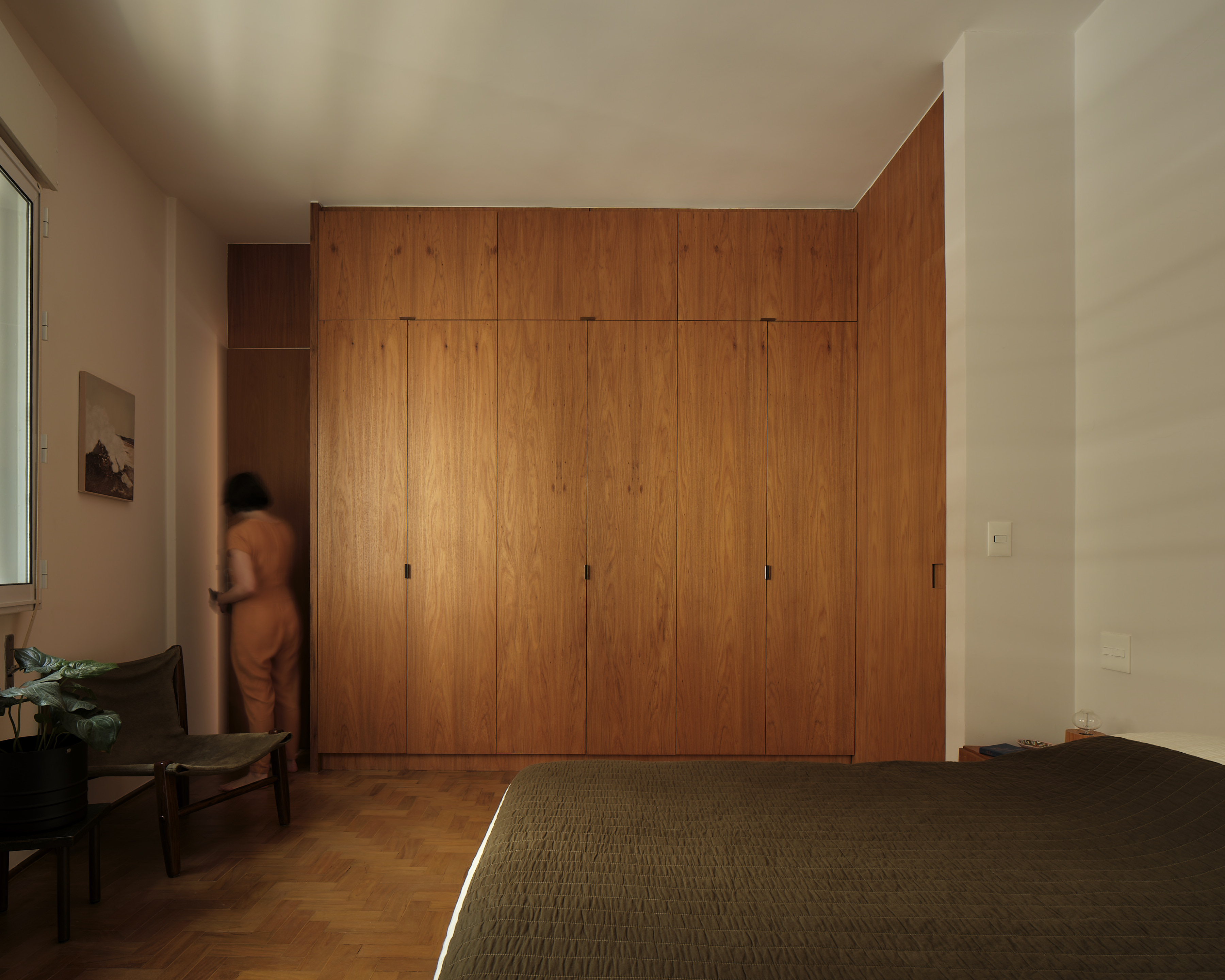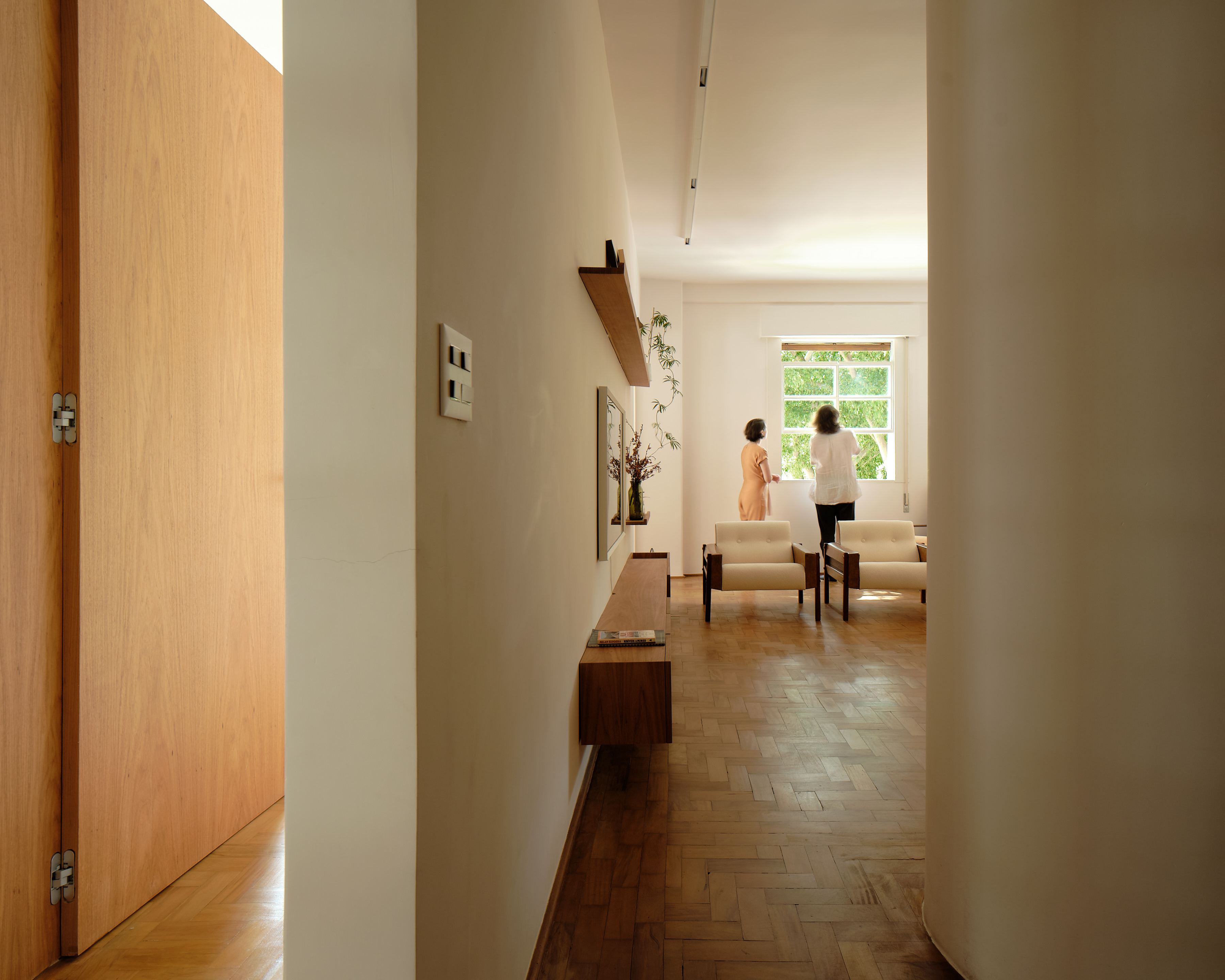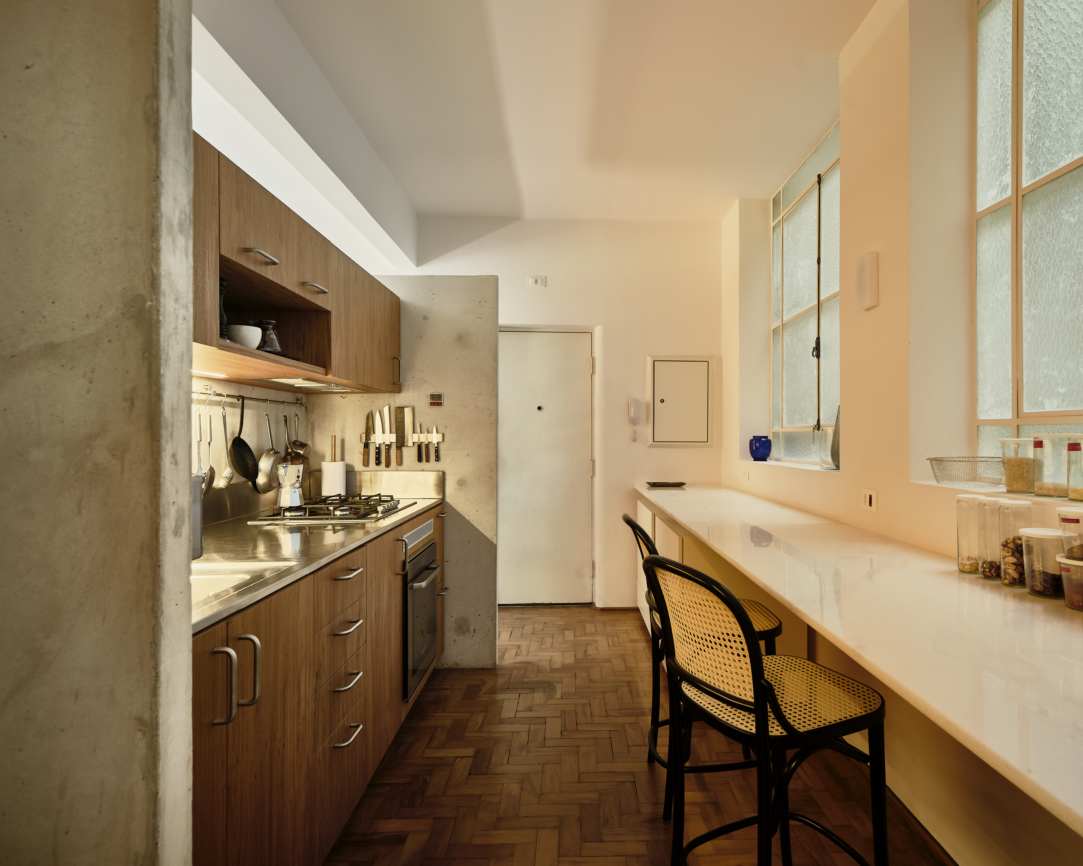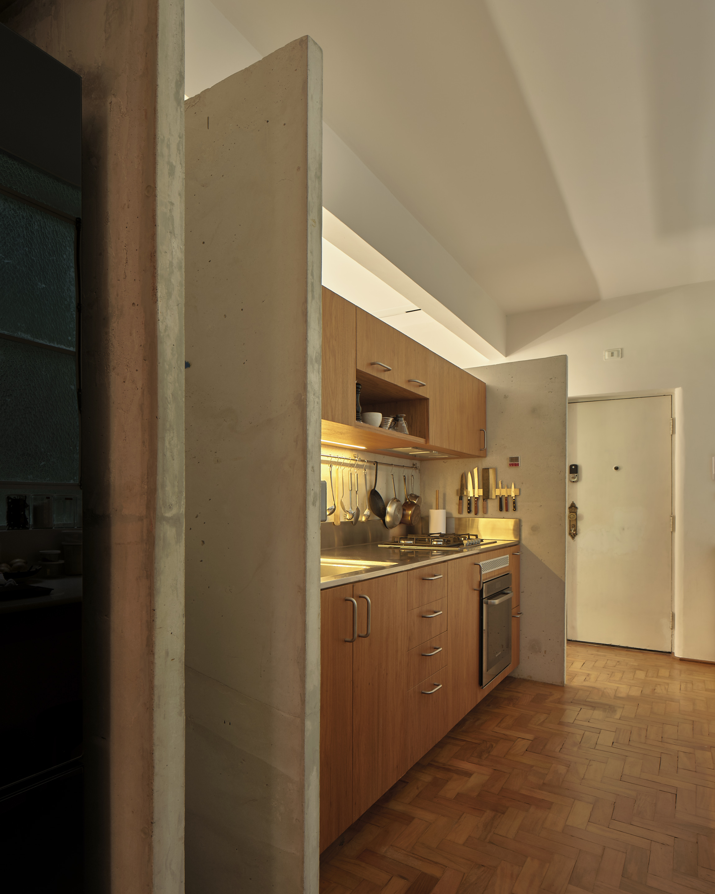 Renovation of a 1940s apartment in downtown São Paulo, featuring a new spatial arrangments with concrete and wooden panels.