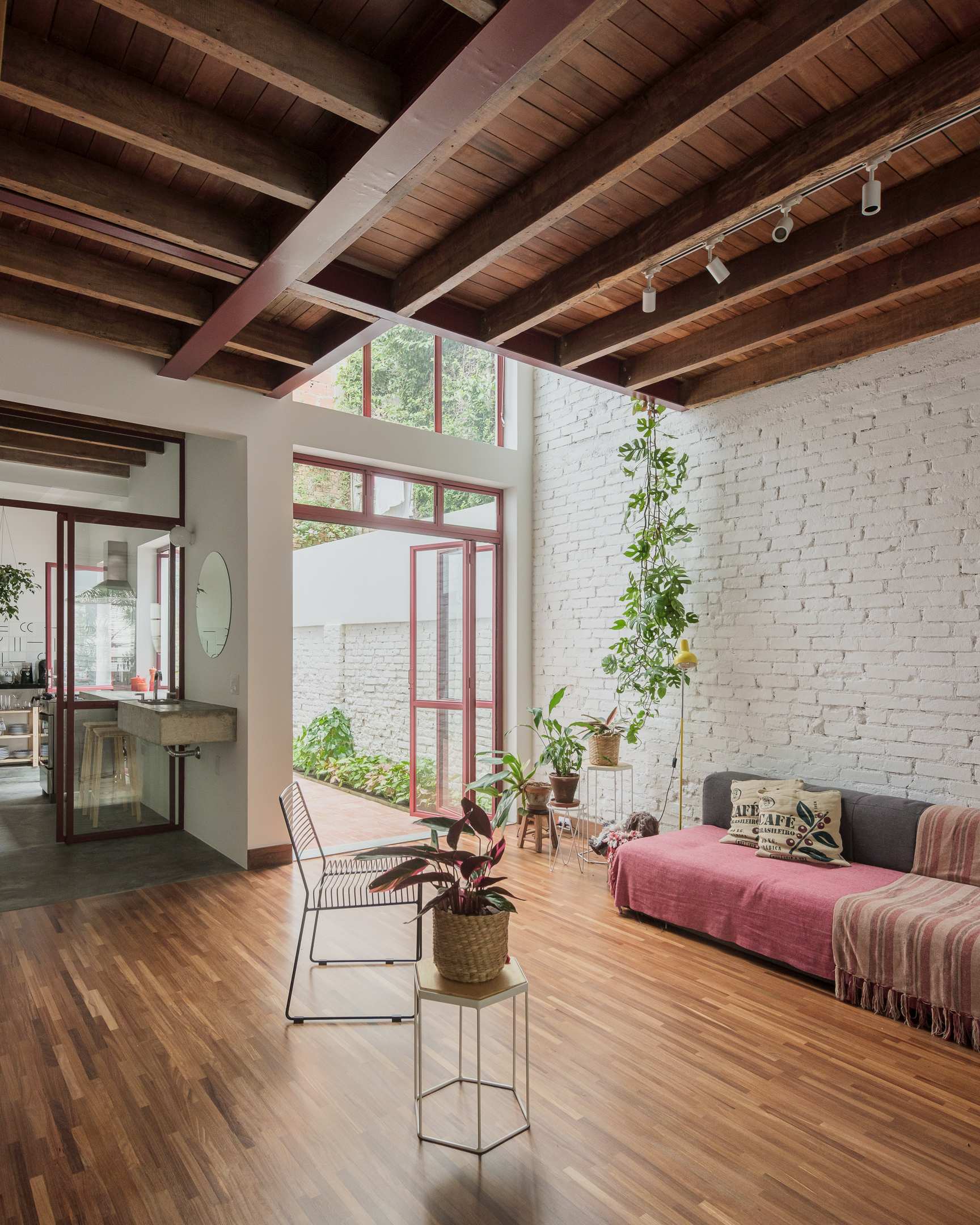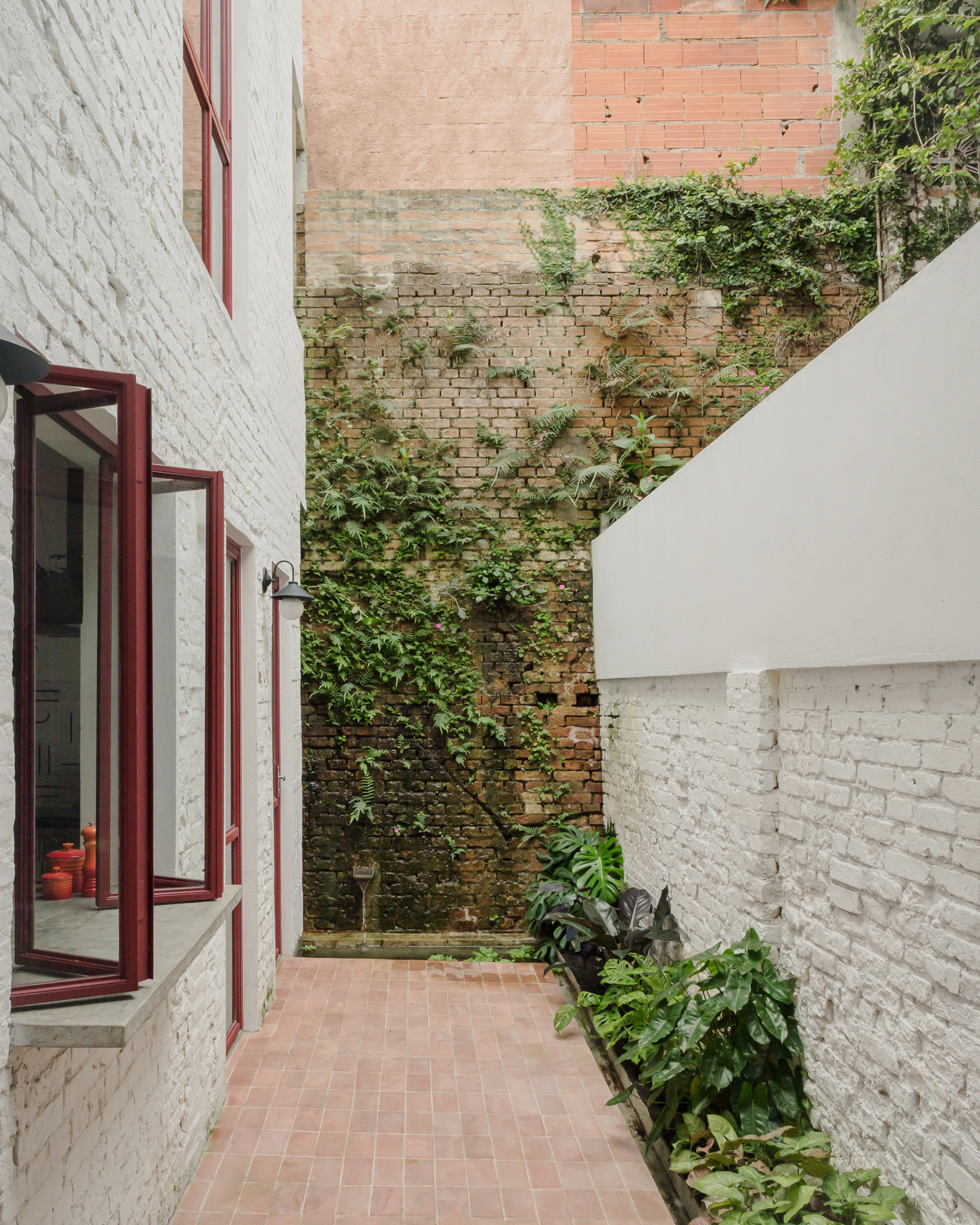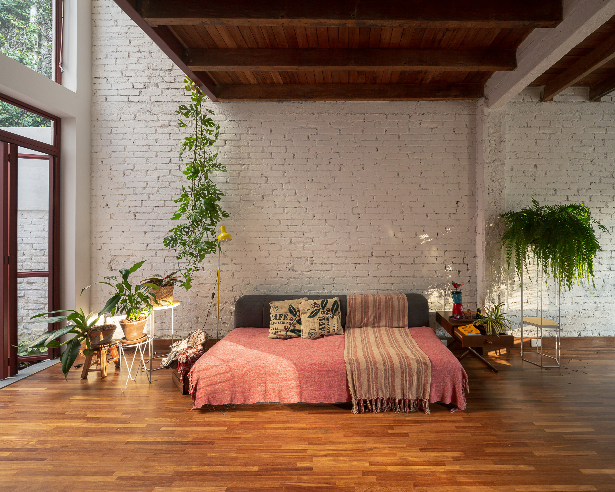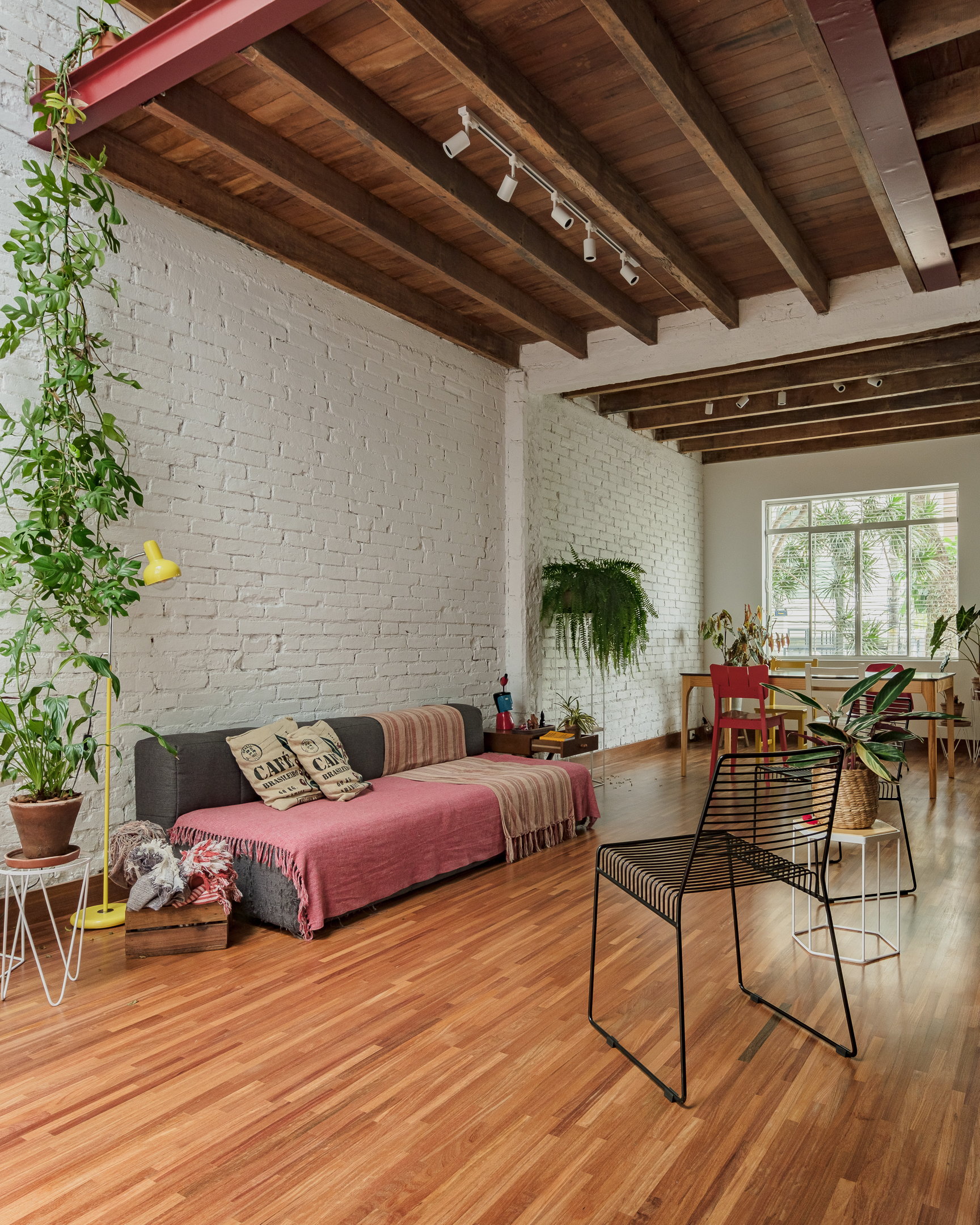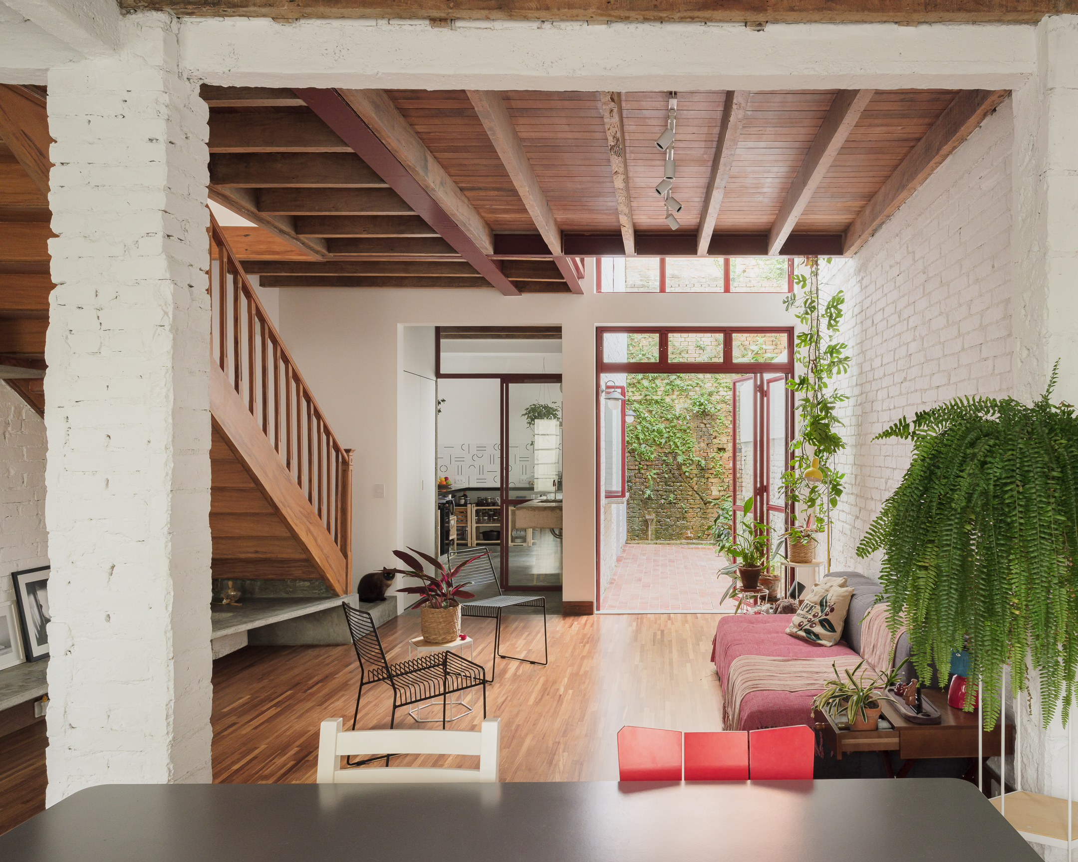 A renovated rowhouse in a central neighbourhood in São Paulo, Brazil opens up the source of the Saracura river, which flows from behind the brick walls into a garden pool. Warm tones and ample rooms make for comfortable and light-filled living spaces.