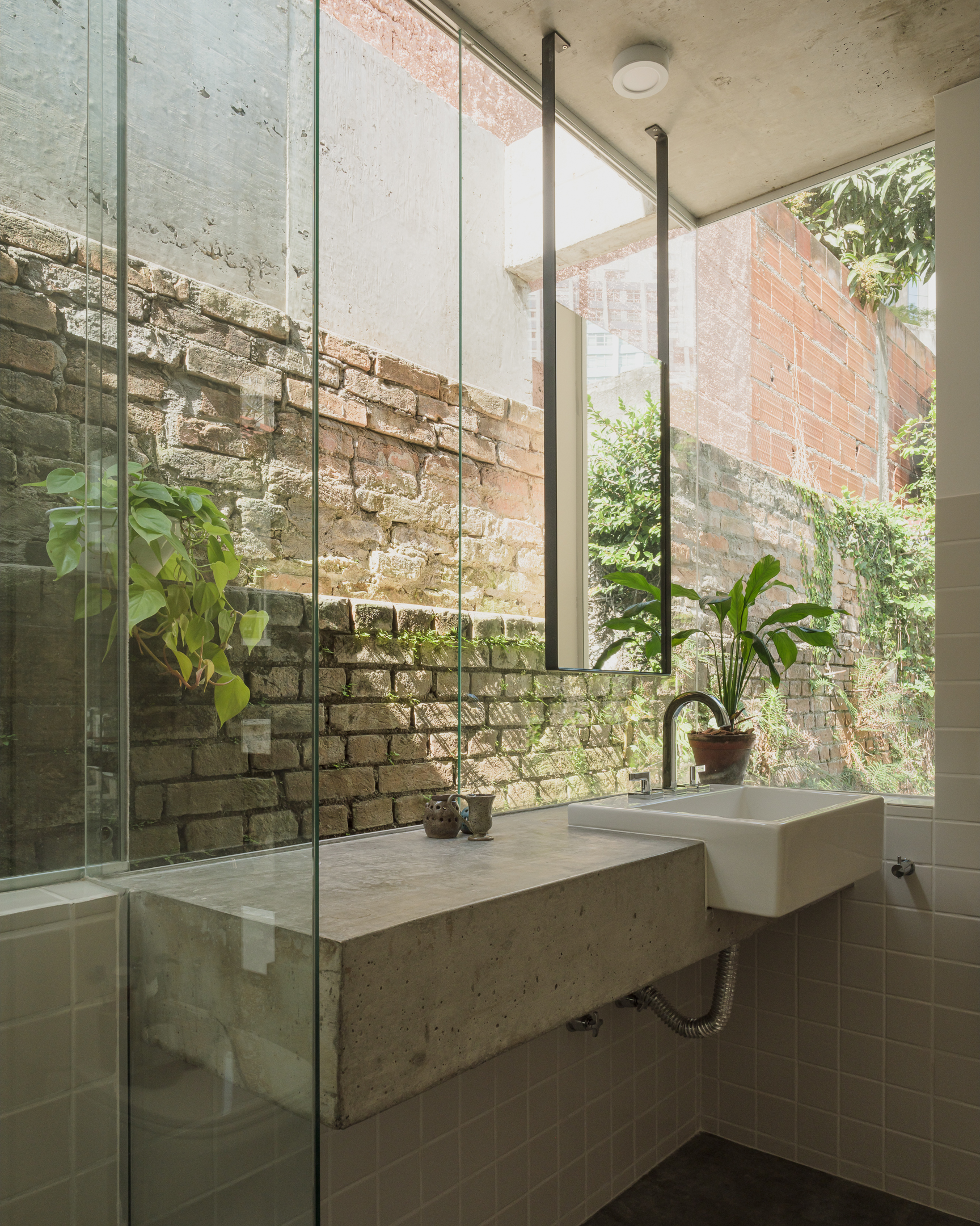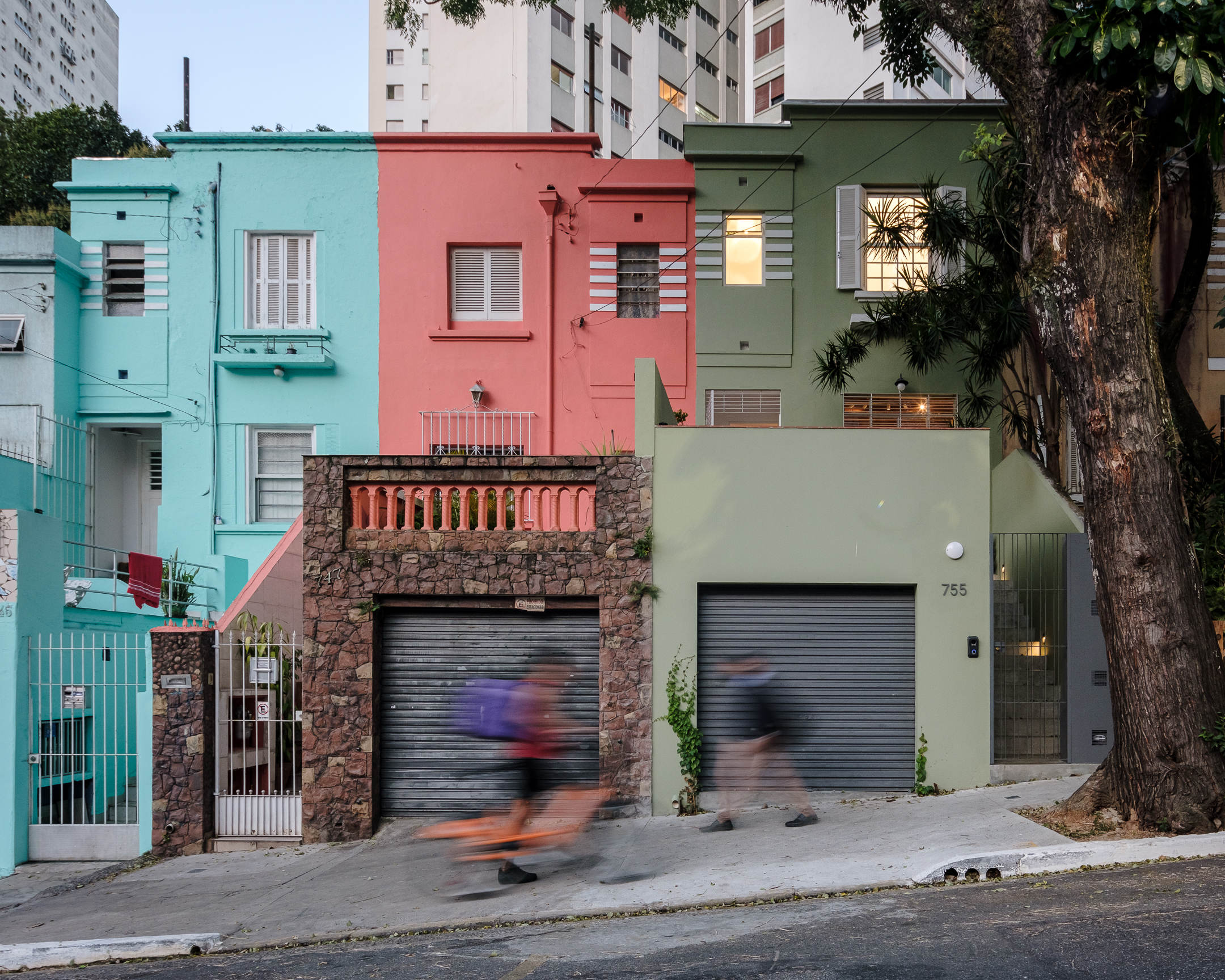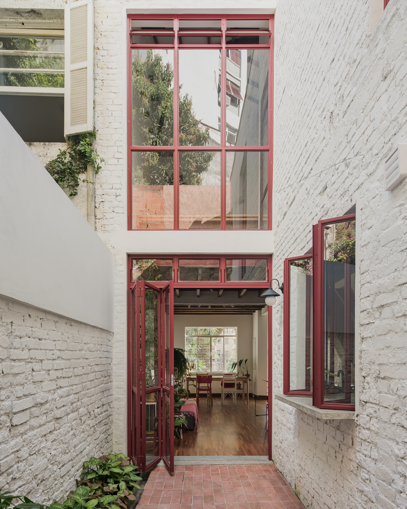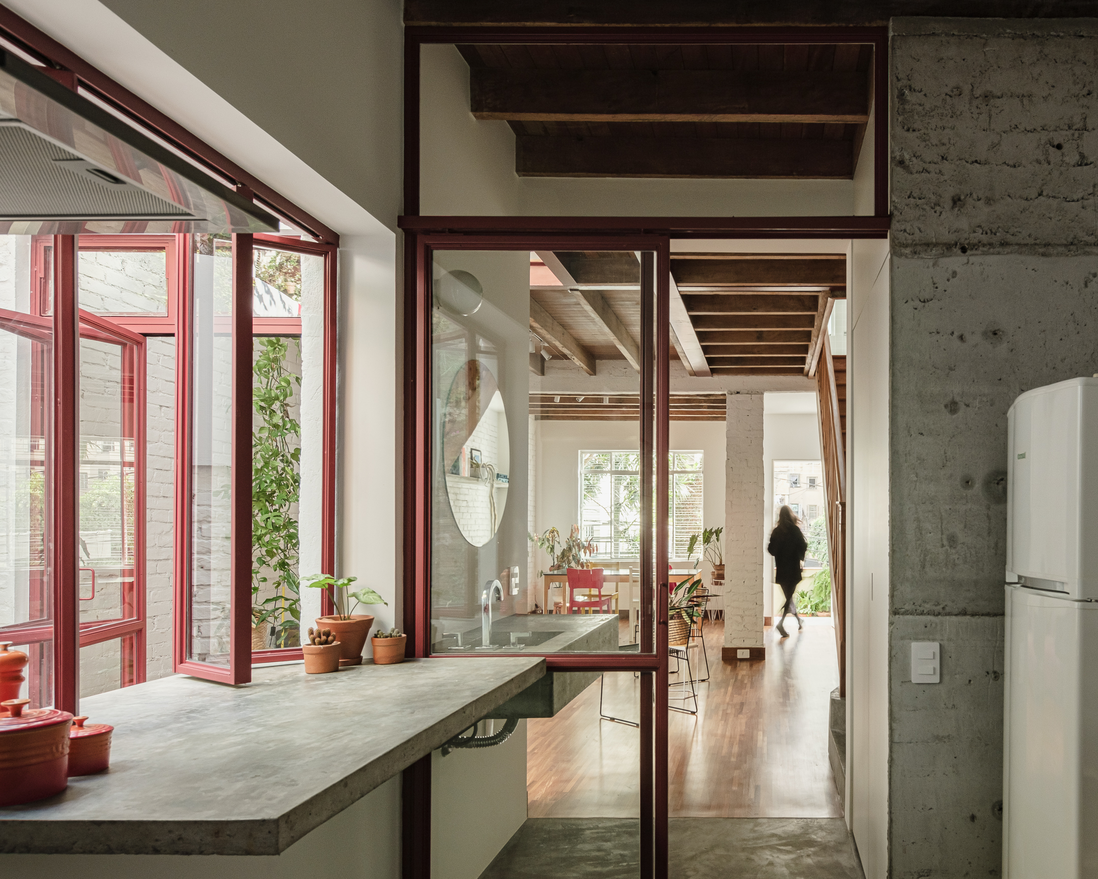 A renovated rowhouse in a central neighbourhood in São Paulo, Brazil opens up the source of the Saracura river, which flows from behind the brick walls into a garden pool. Warm tones and ample rooms make for comfortable and light-filled living spaces.