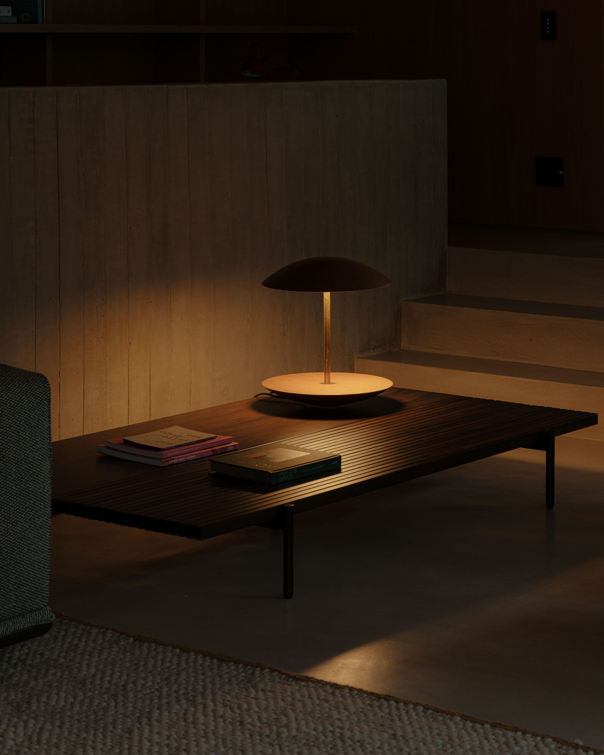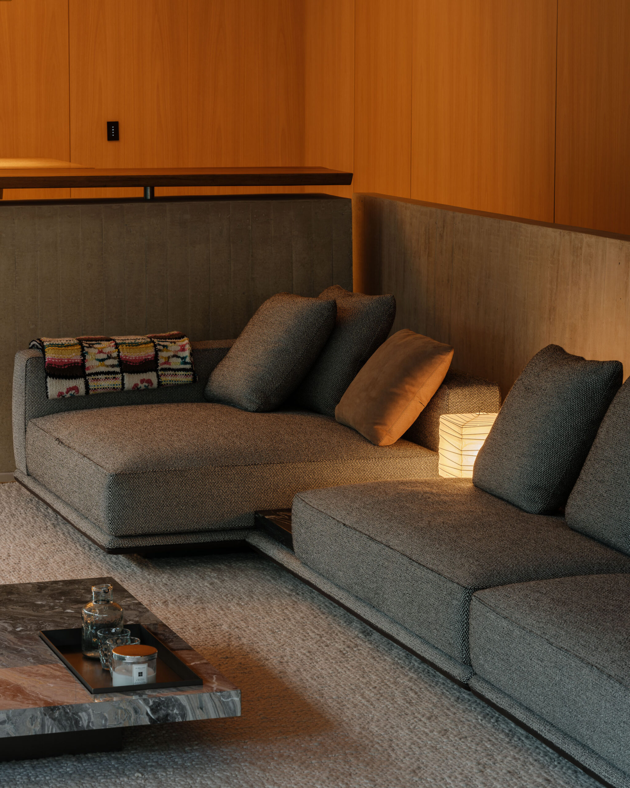 Sofa, rug, coffee table, and dining chairs: Atrium, Minotti