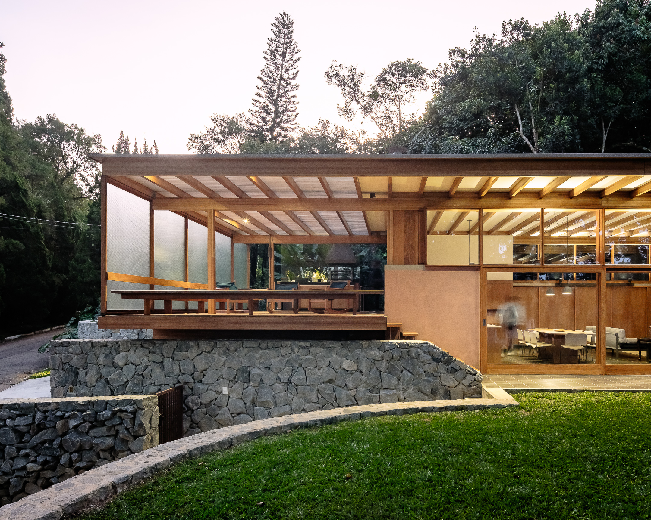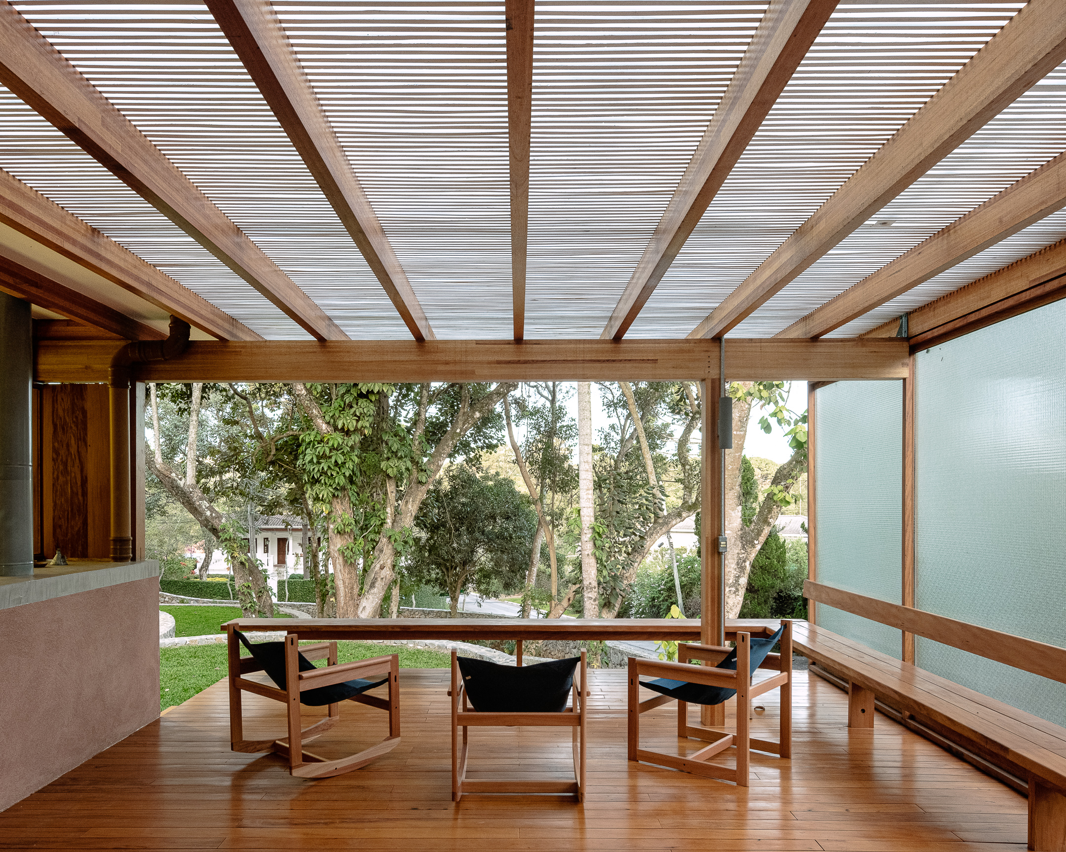 The orthogonal geometry of the house is organized through its longitudinal section, with collective uses closer to the street and private uses along the lot’s boundary. The floor design establishes movement and defines distinct spaces within the house, with varying ceiling heights relative to the horizontal roof. The regularity of the roof supports the variety of the floor design.